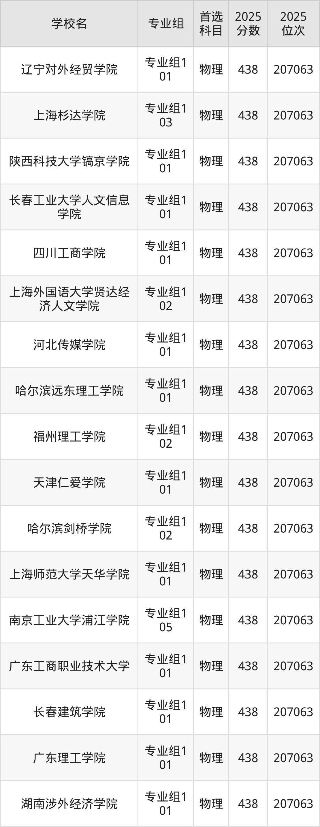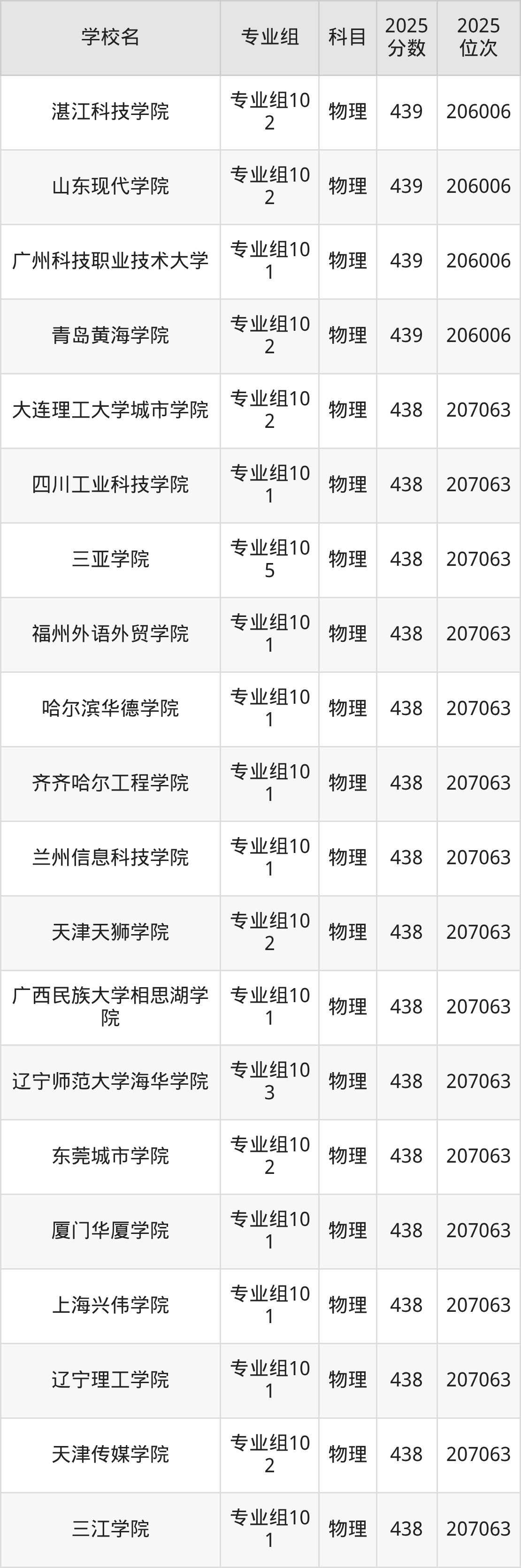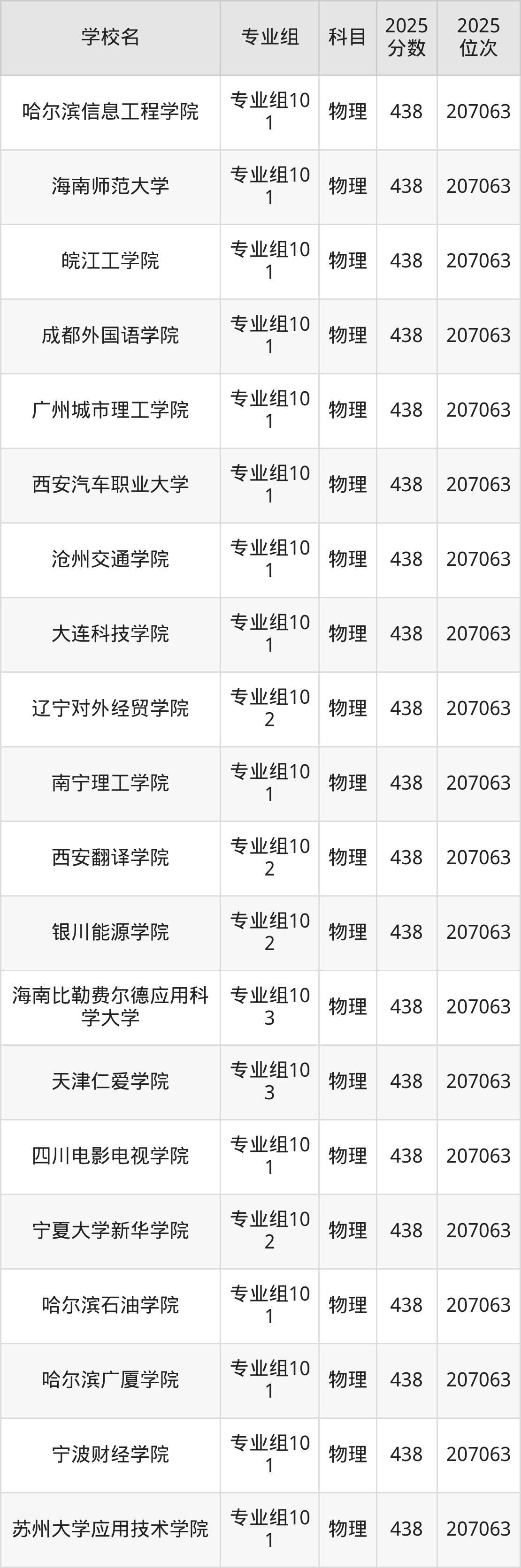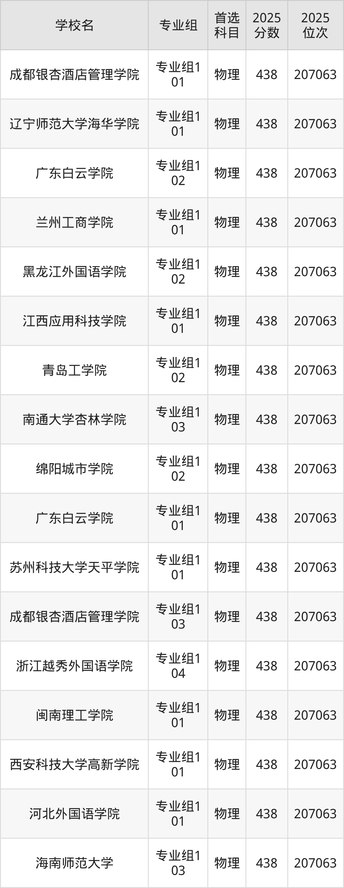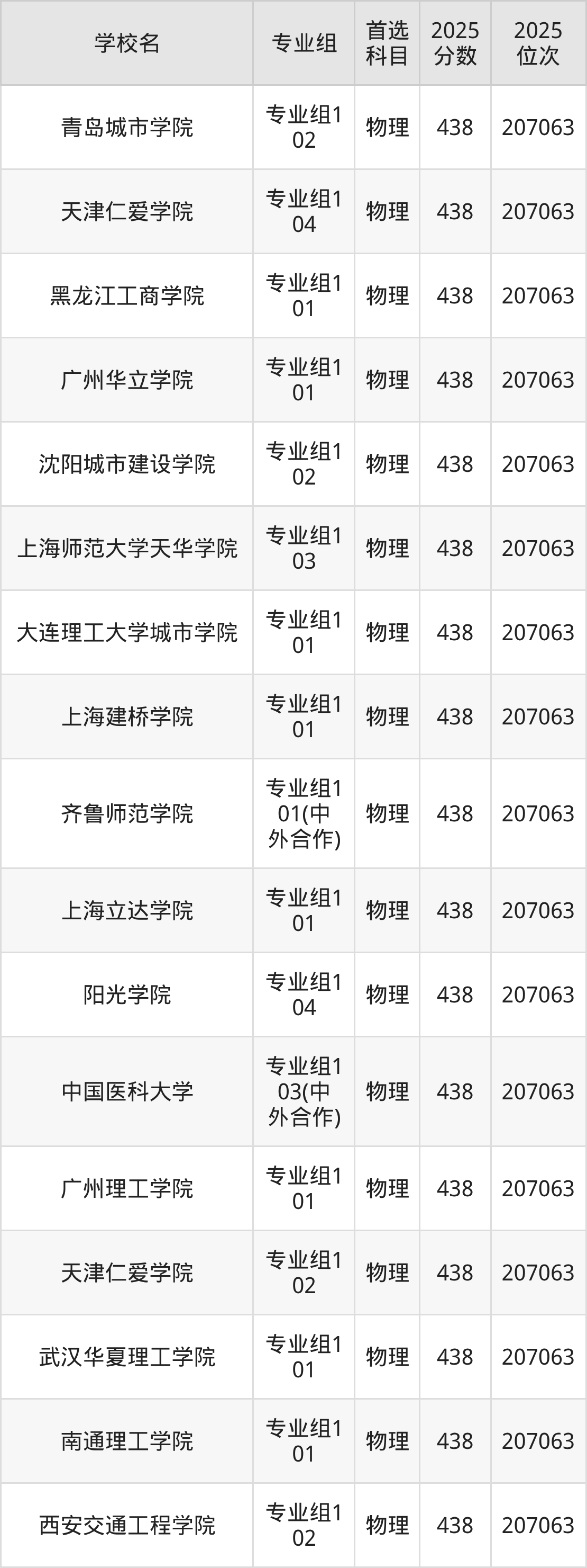 四川物理类438分对应的位次排名是207063名,因此建议2026年位次排在这附近的考生考虑这些大学。