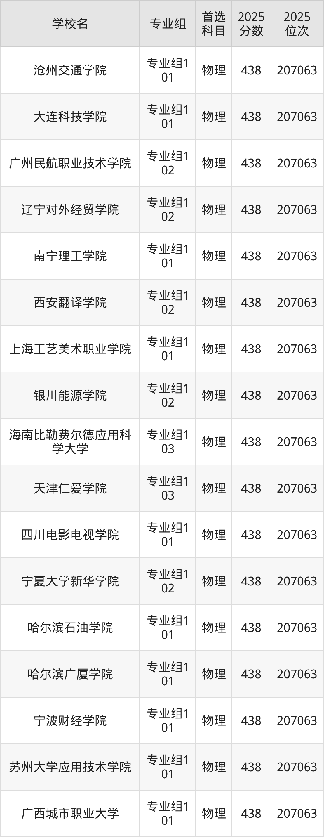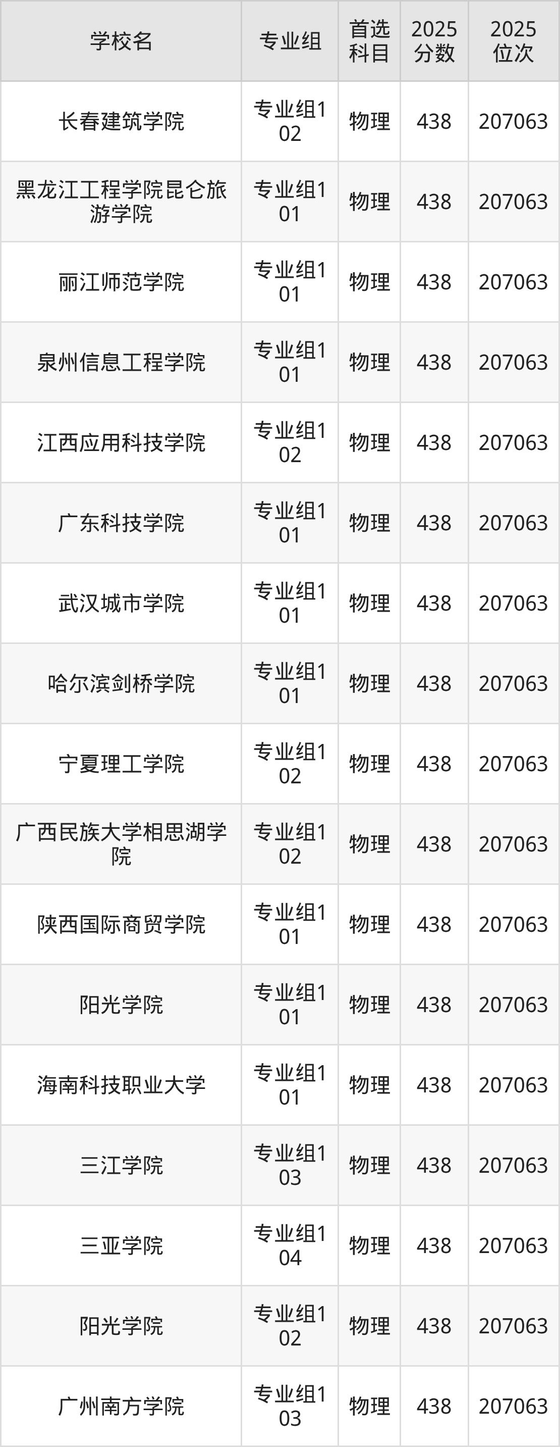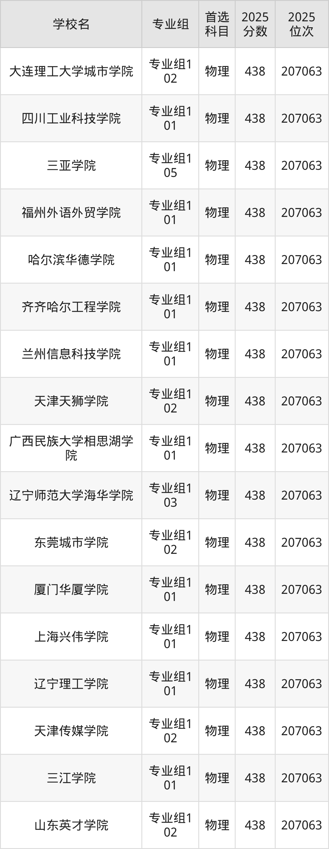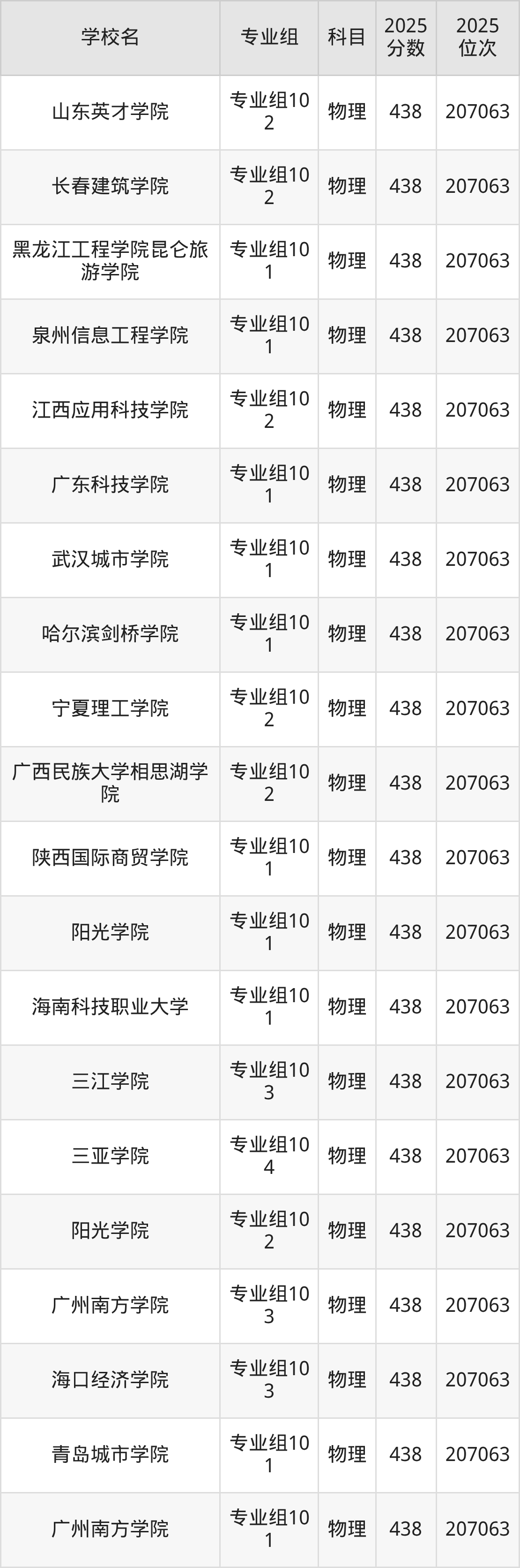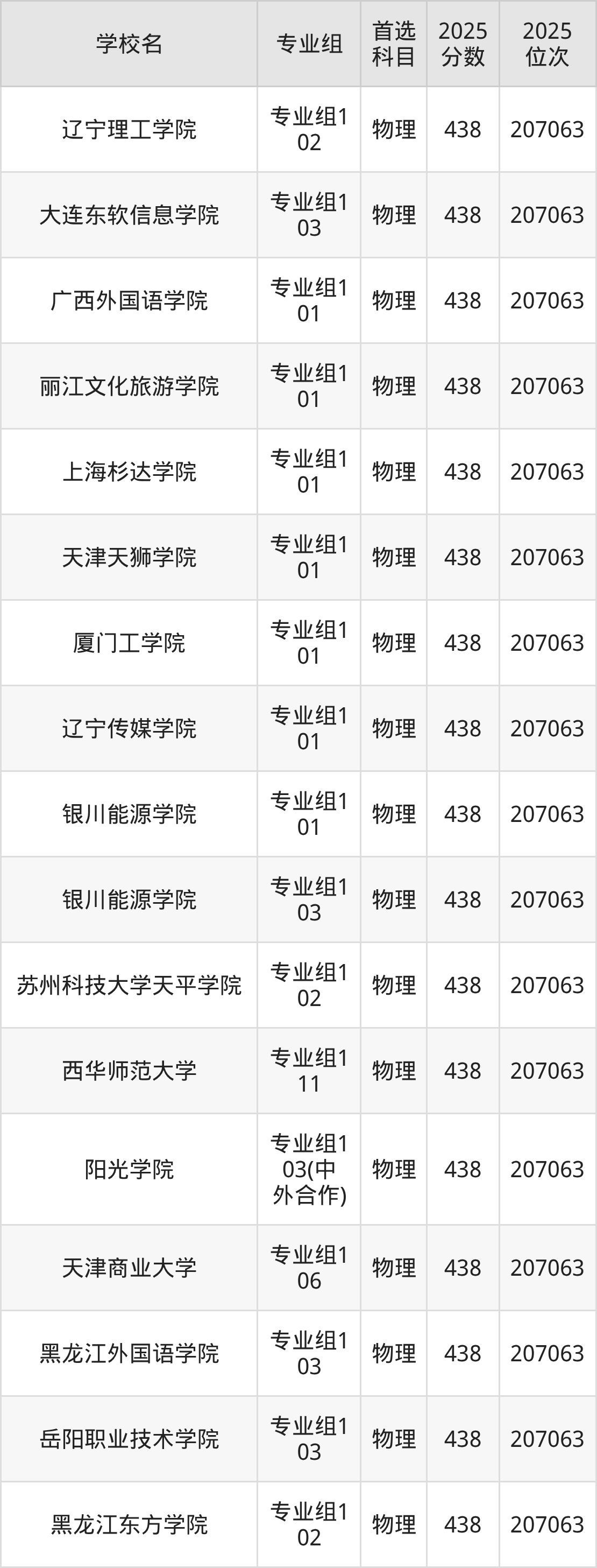 四川物理类438分对应的位次排名是207063名,因此建议2026年位次排在这附近的考生考虑这些大学。