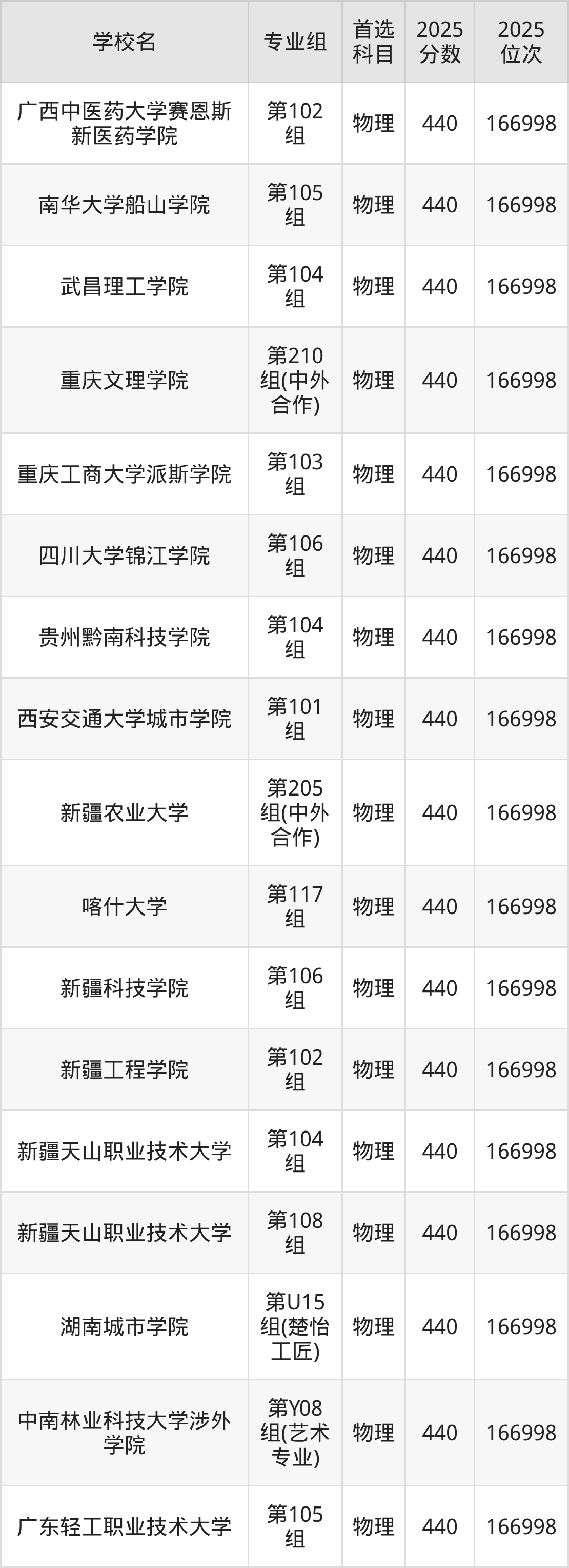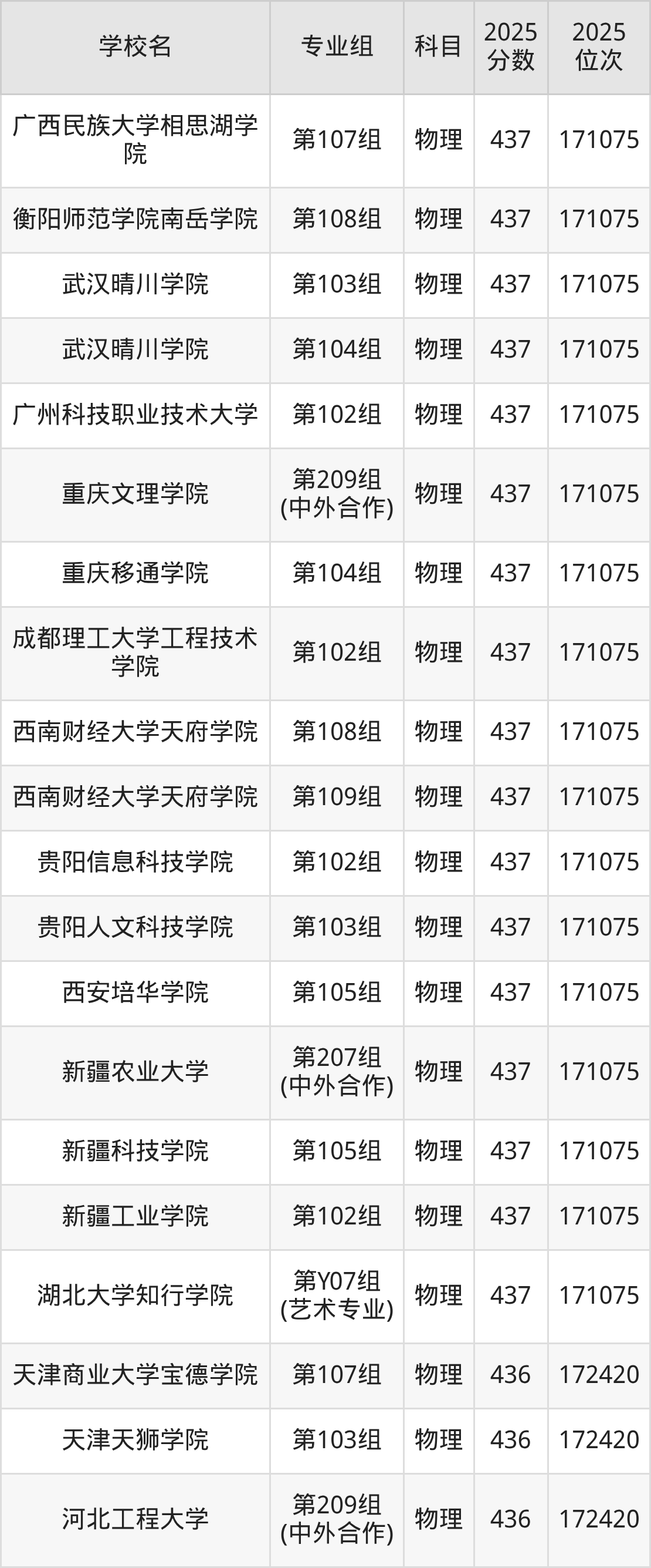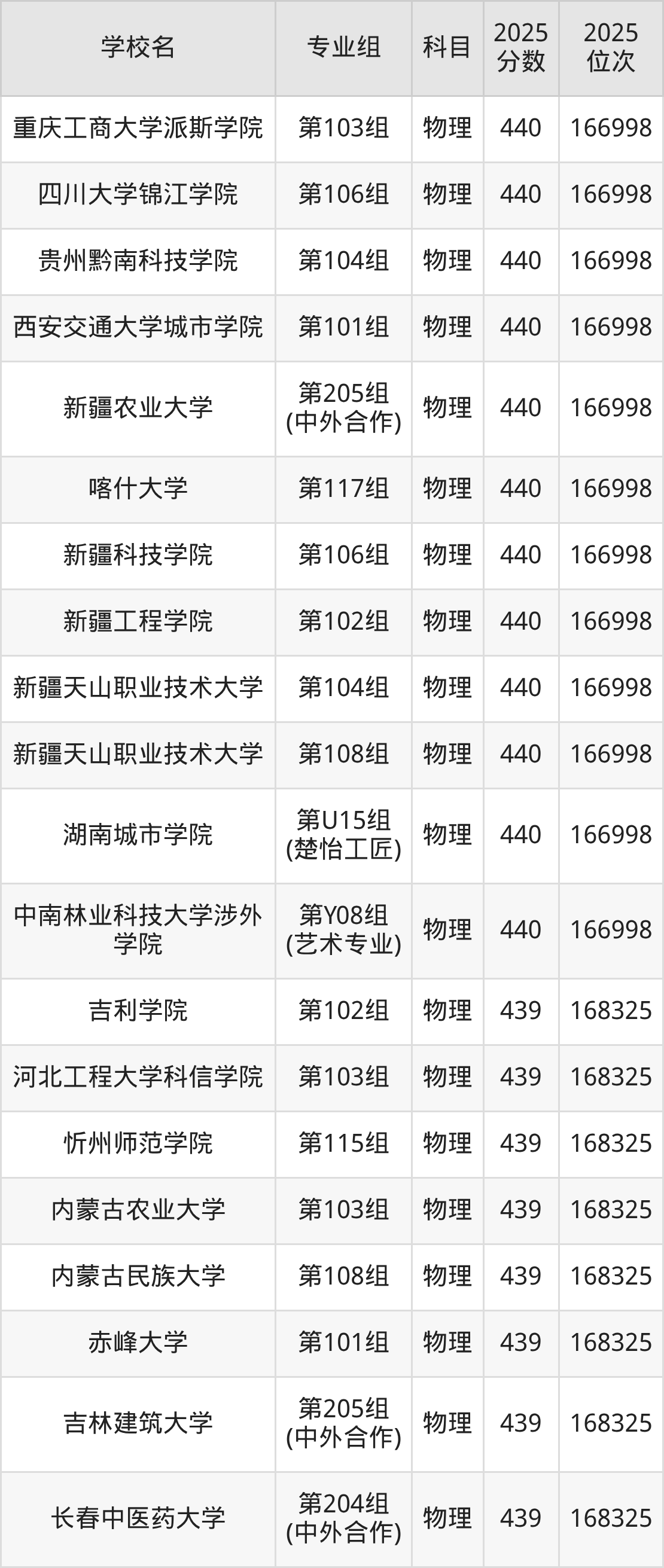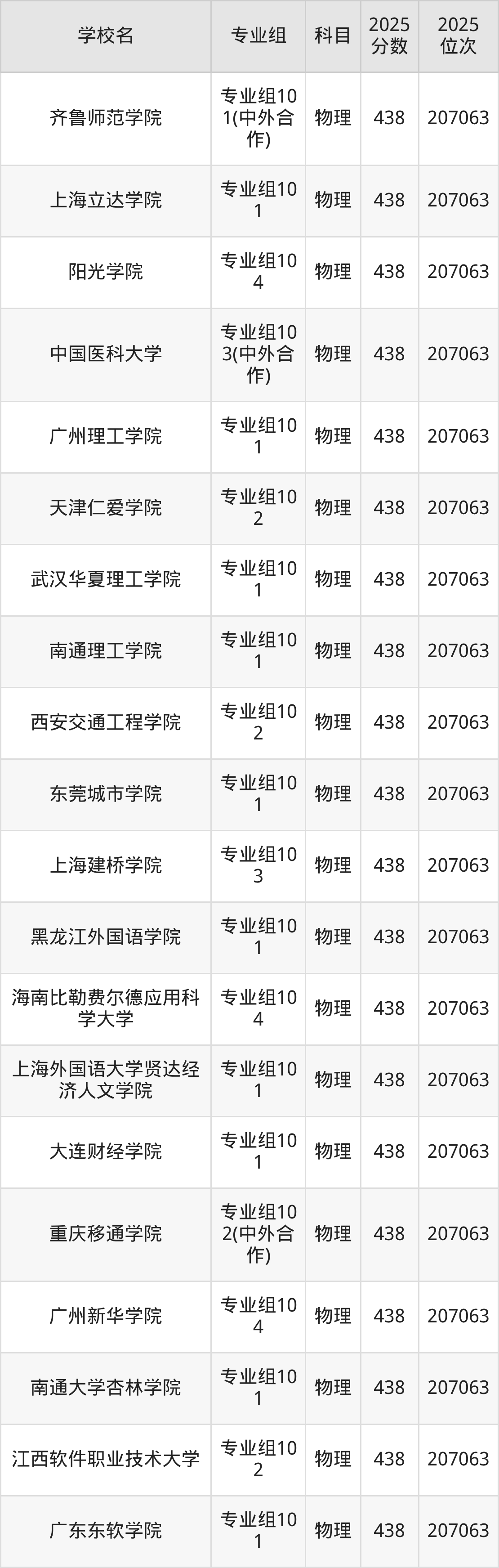 四川物理类438分对应的位次排名是207063名,因此建议2026年位次排在这附近的考生考虑这些大学。