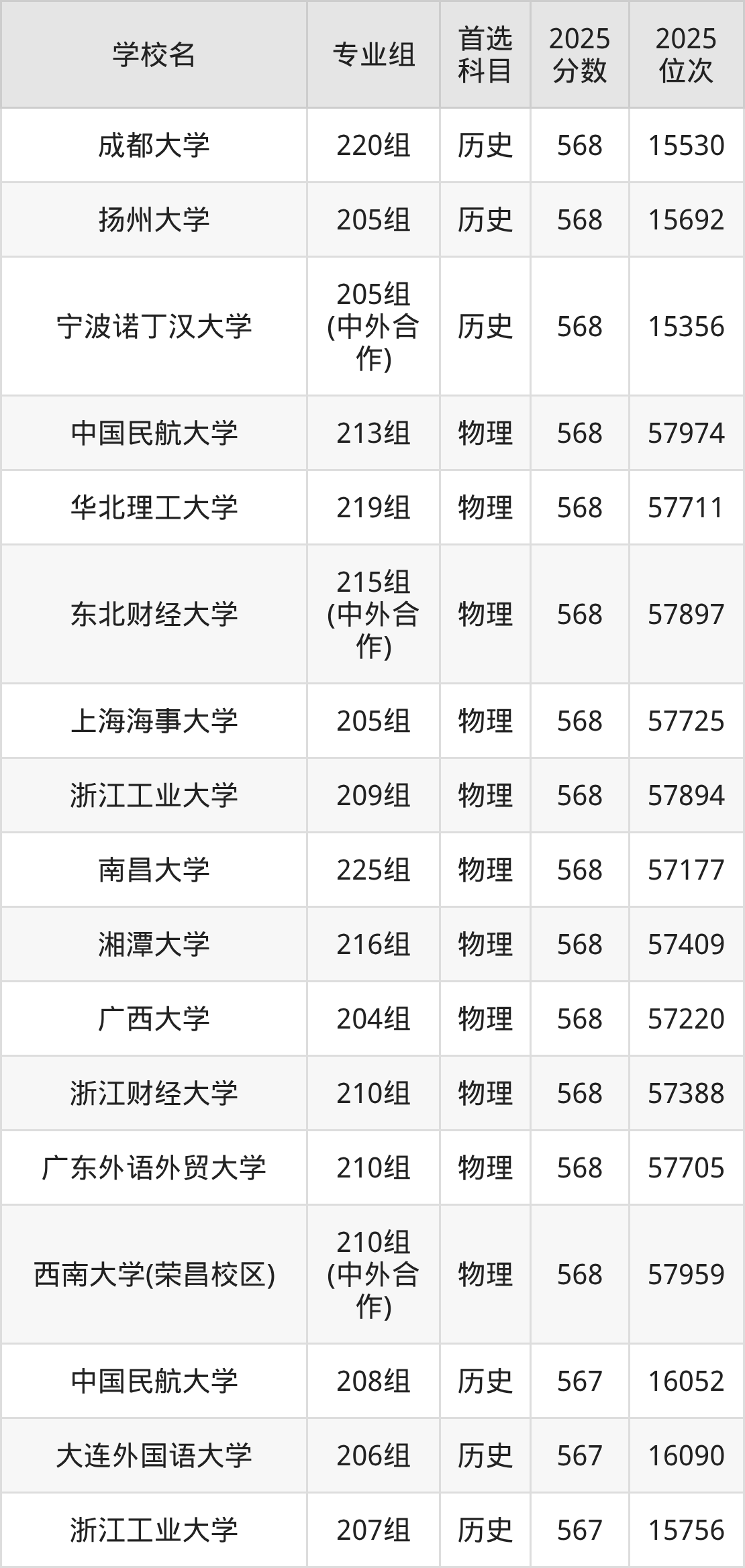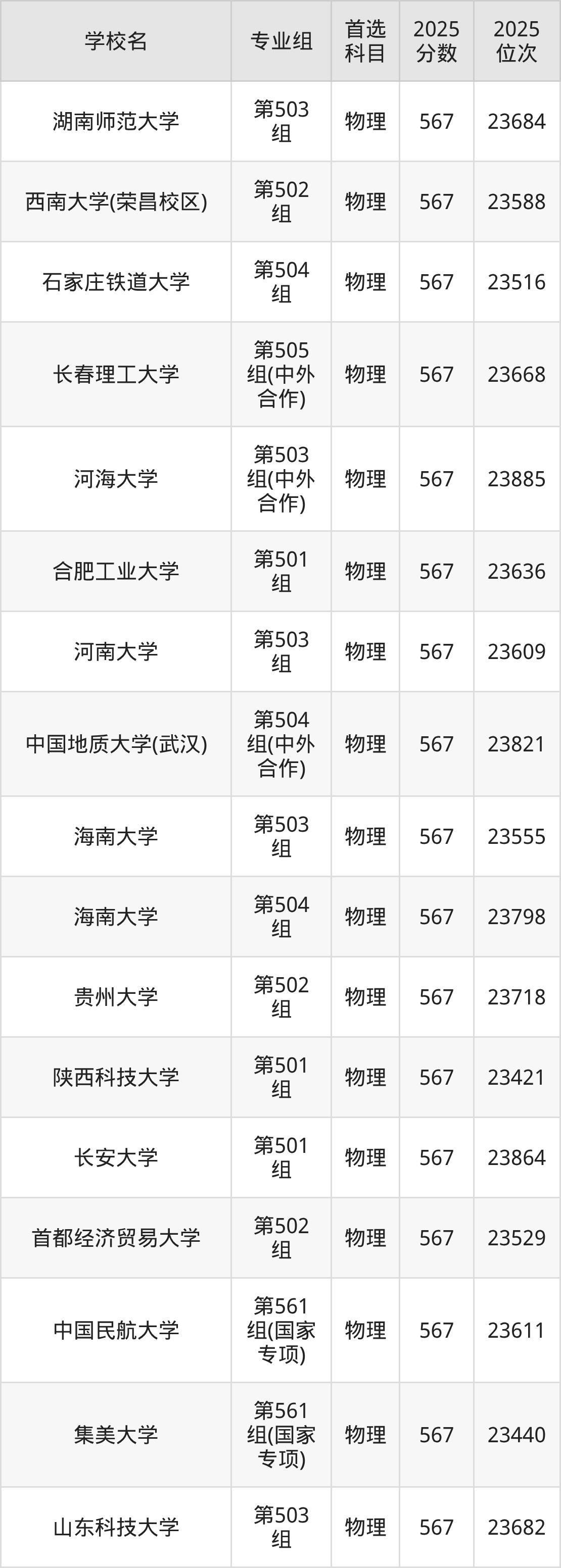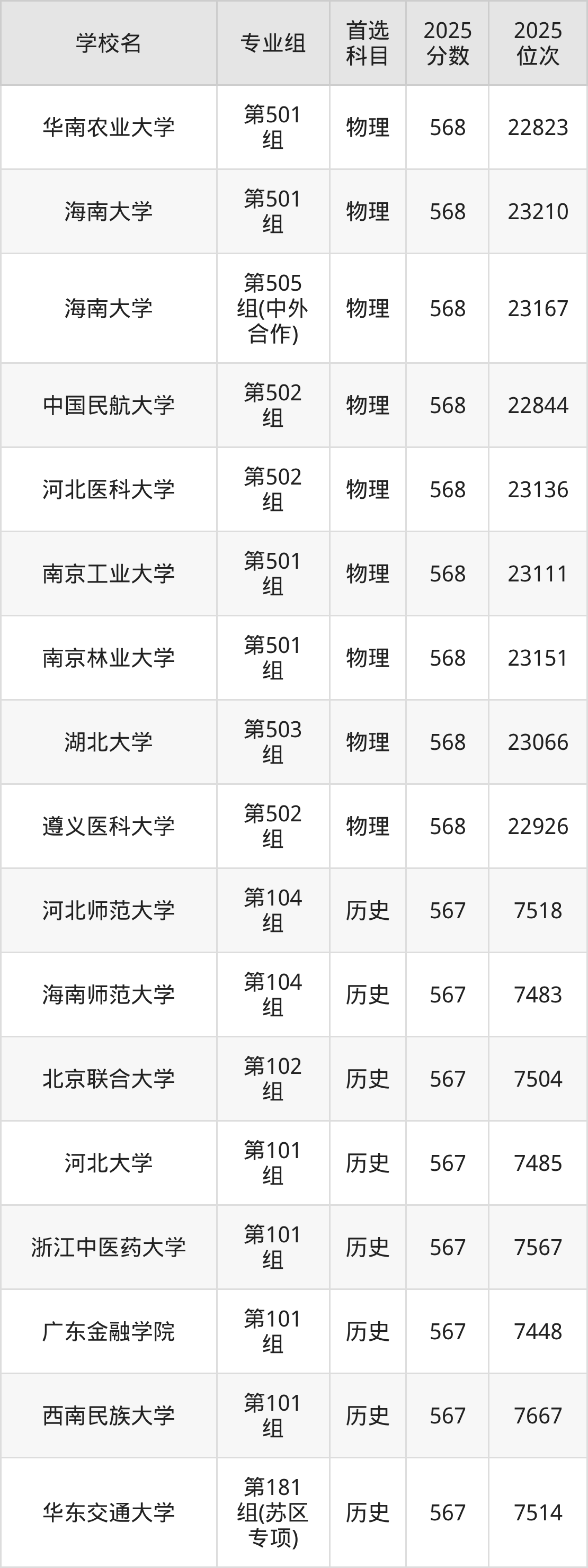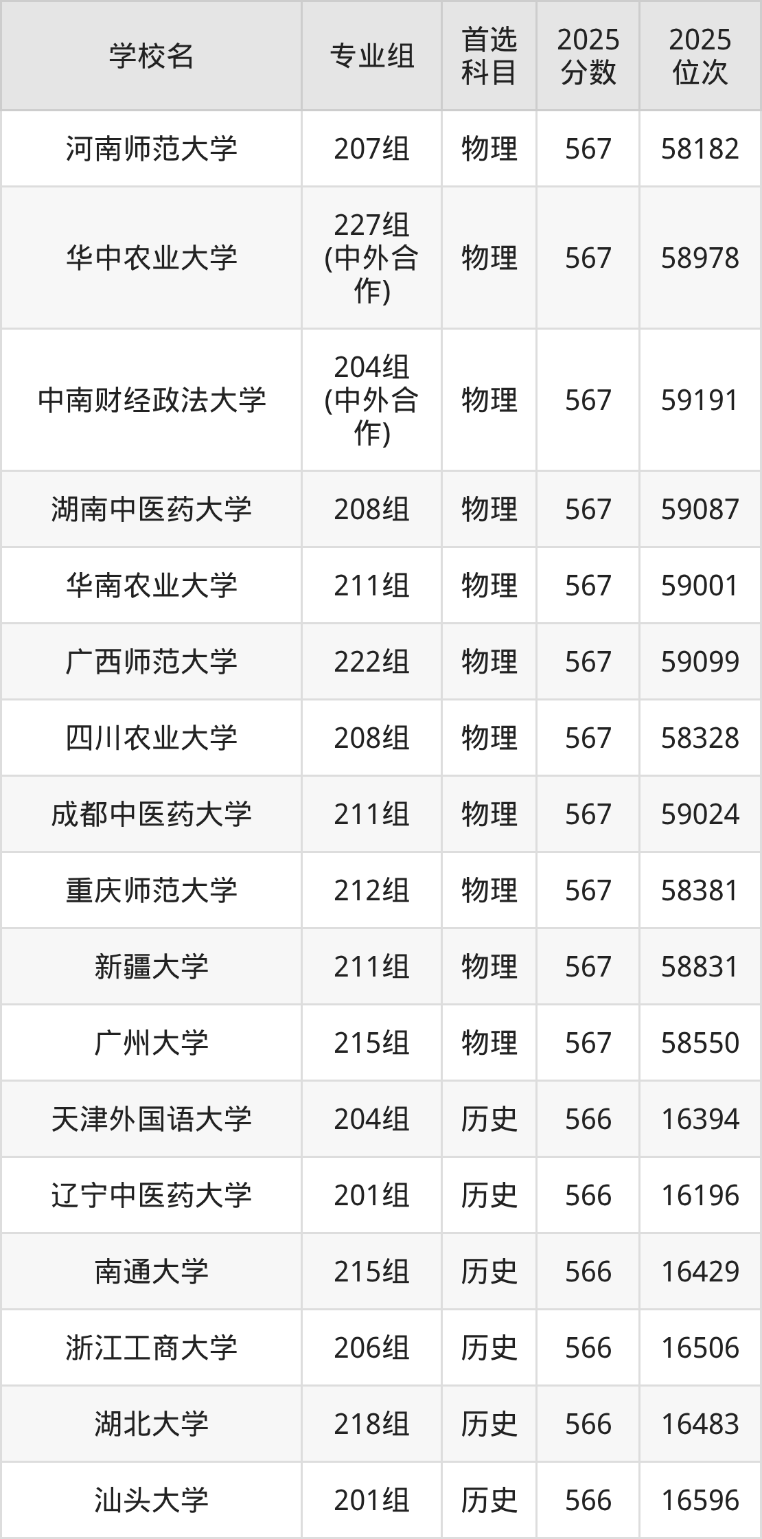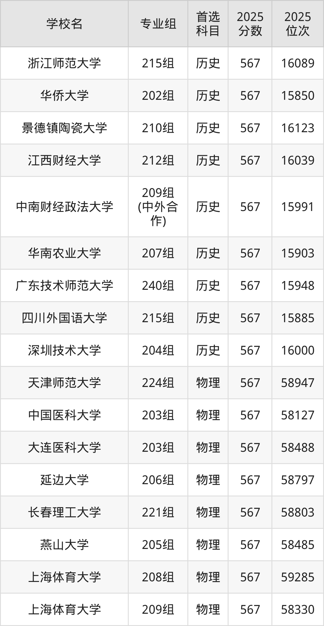广东高考物理类567分对应的位次排名是58127名-59285名,历史类567分对应的位次排名是15756名-16123名,因此建议2026年位次排在这附近的同学考虑这些大学。