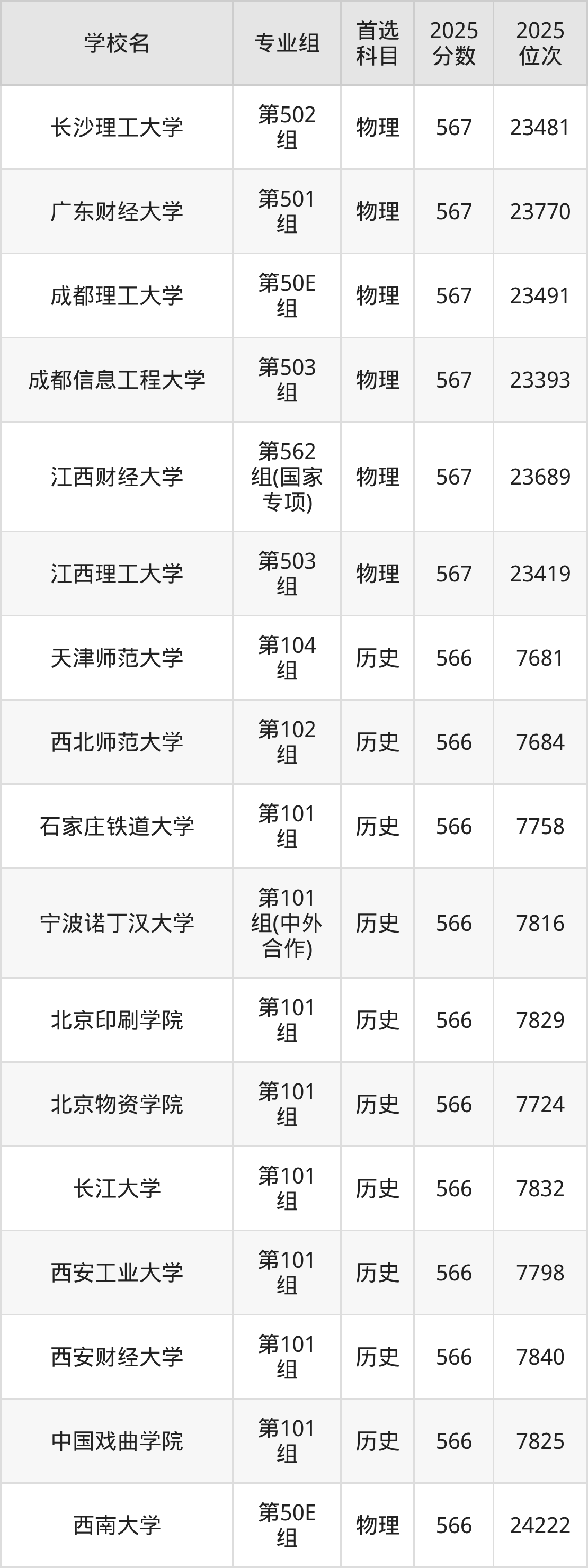 江西高考历史类567分对应的位次排名是7448名-7667名,物理类567分对应的位次排名是23393名-23885名,因此建议2026年位次排在这附近的同学考虑这些大学。