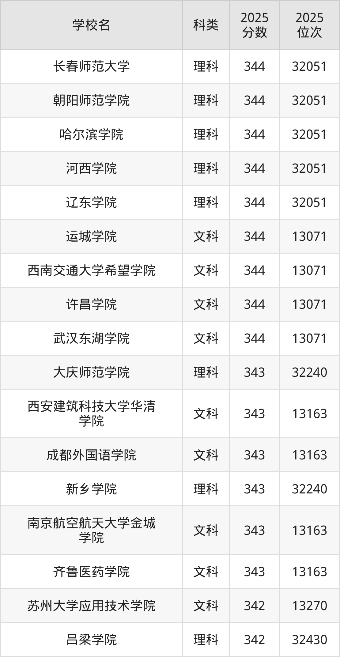 2025年在新疆高考文科录取分数线是344分的大学有浙江金融职业学院、运城学院、西南交通大学希望学院、许昌学院、武汉东湖学院。理科录取分数线是344分的大学有长春师范大学、朝阳师范学院、哈尔滨学院、河西学院、辽东学院。
