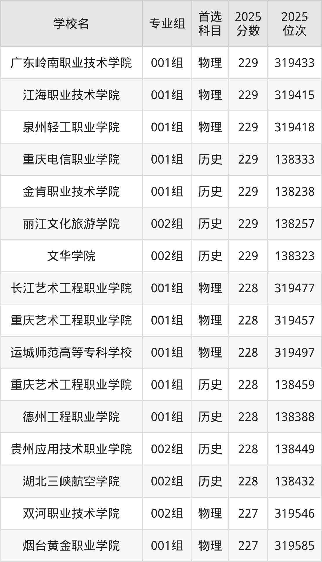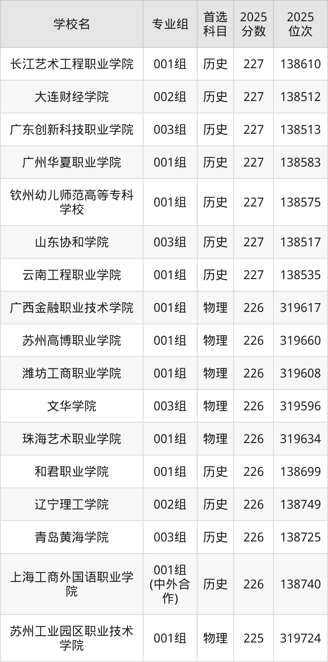 下面老师将以上文整理的其中两个省份为例,为大家具体展示227分左右能上的专科大学名单。