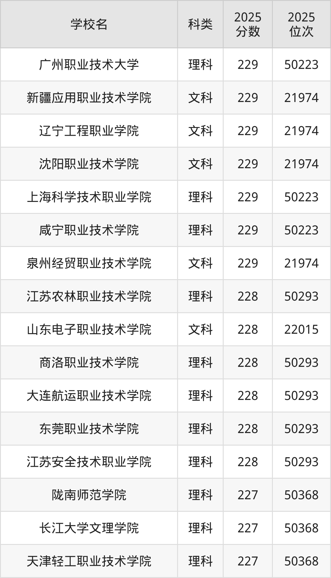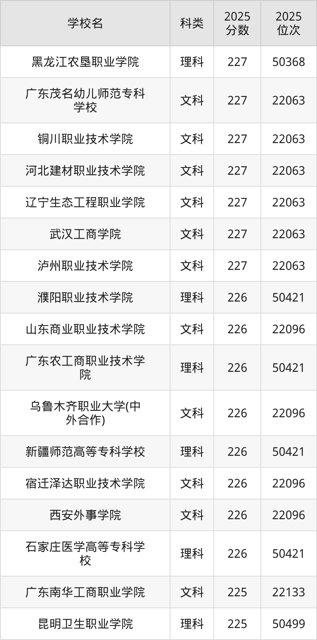 从2025年划定的批次线来看,227分在以下地区可以上专科大学,2025年专科线不超过227分的地区有22个,具体如下: