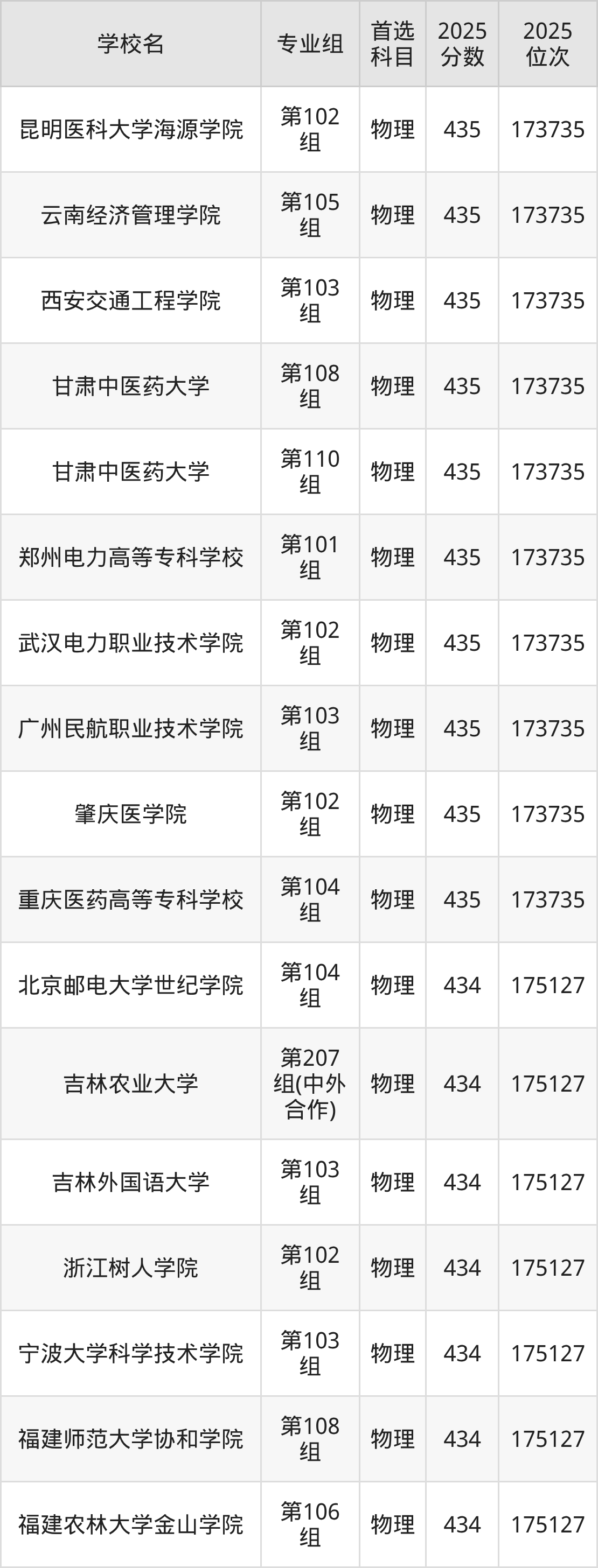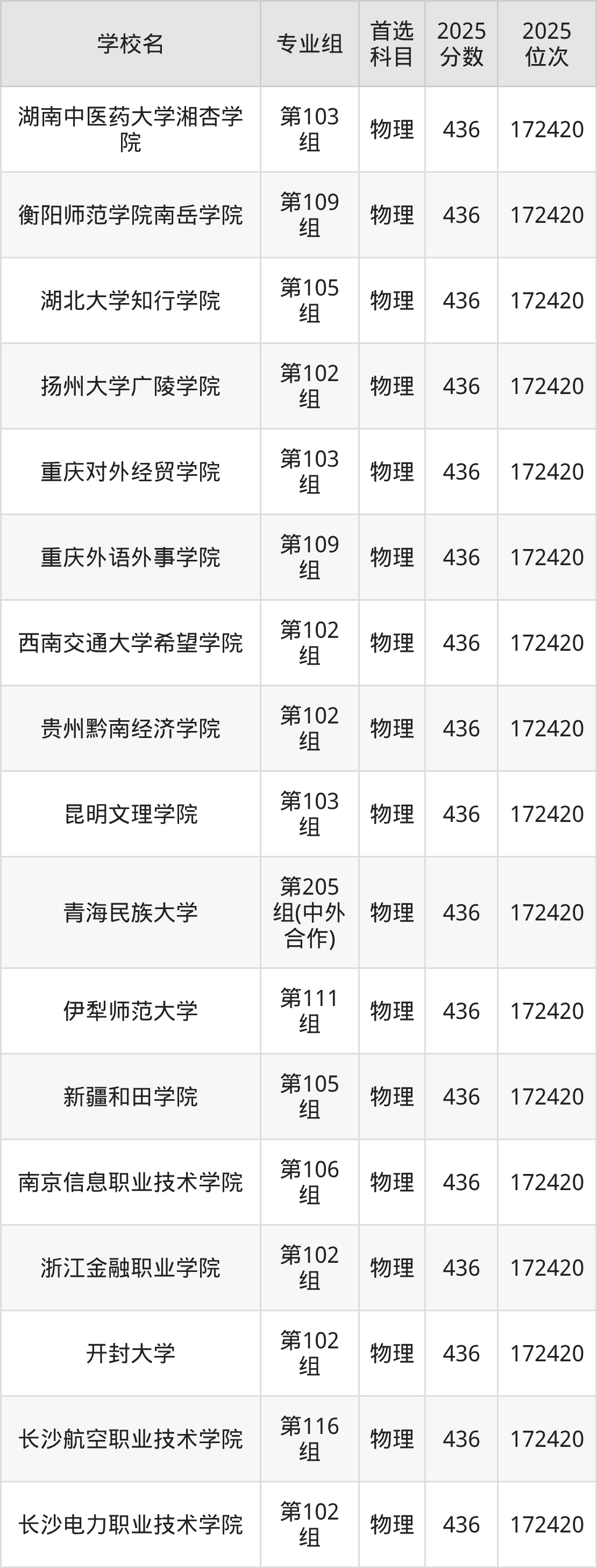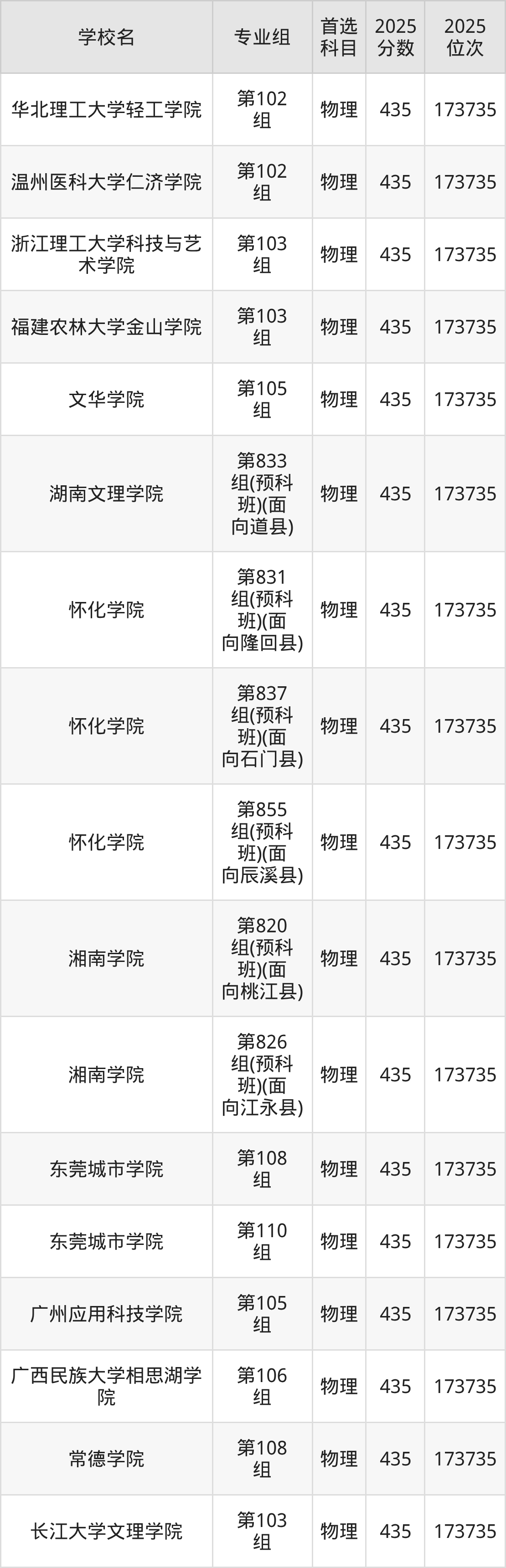 湖南物理类435分对应的位次排名是173735名,因此建议2026年位次排在这附近的考生考虑这些大学。
