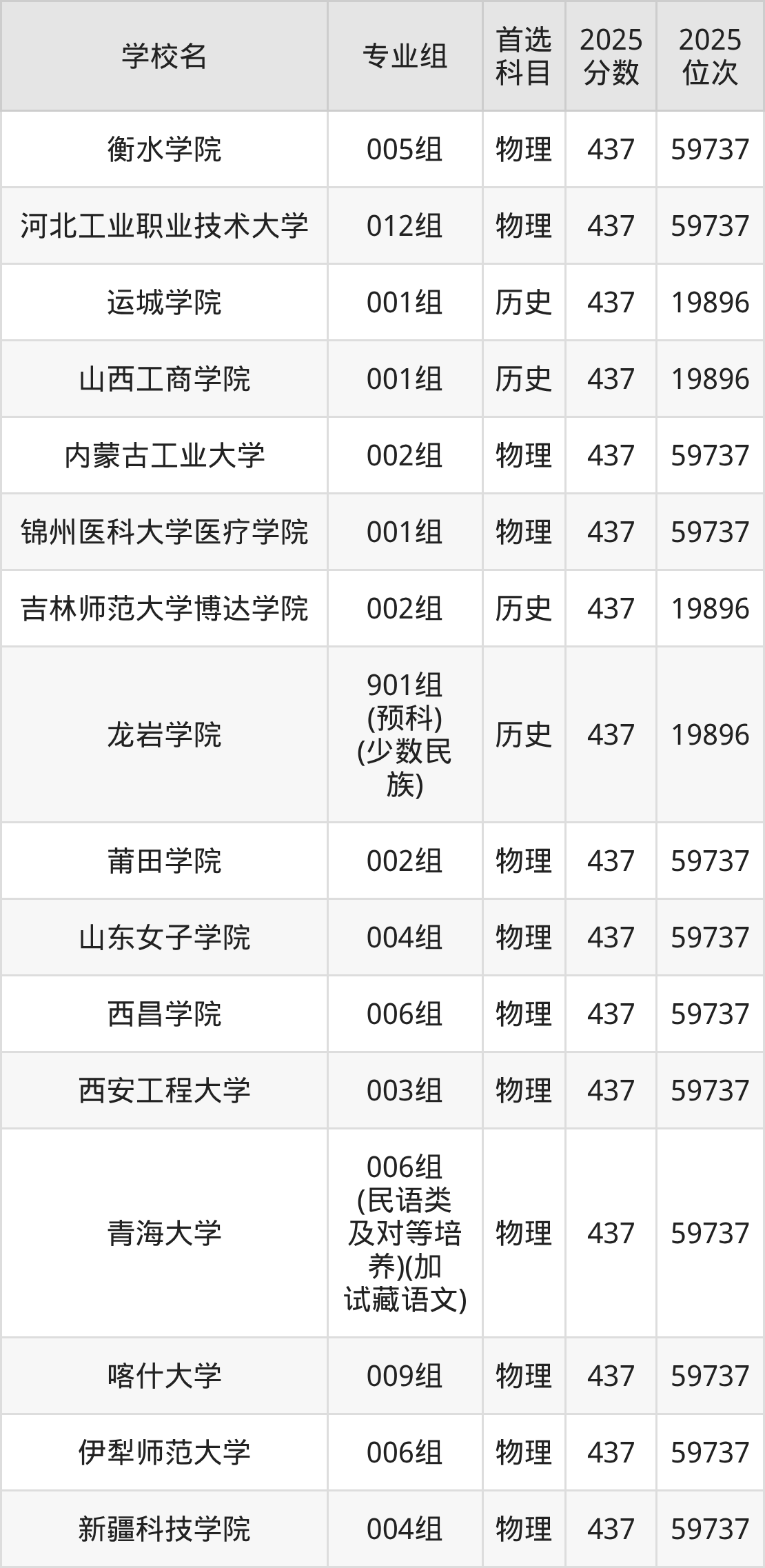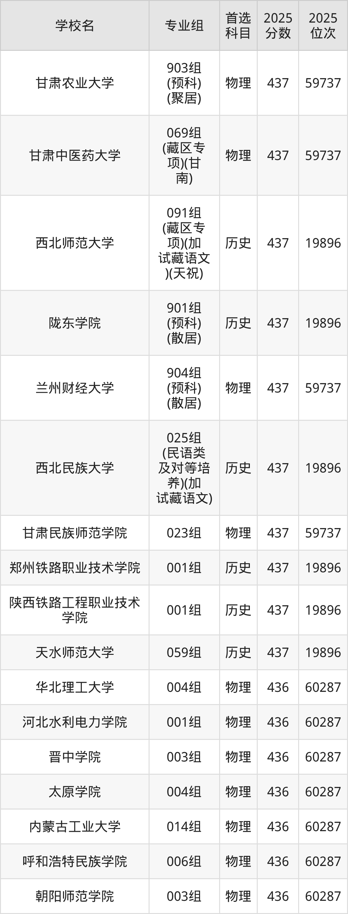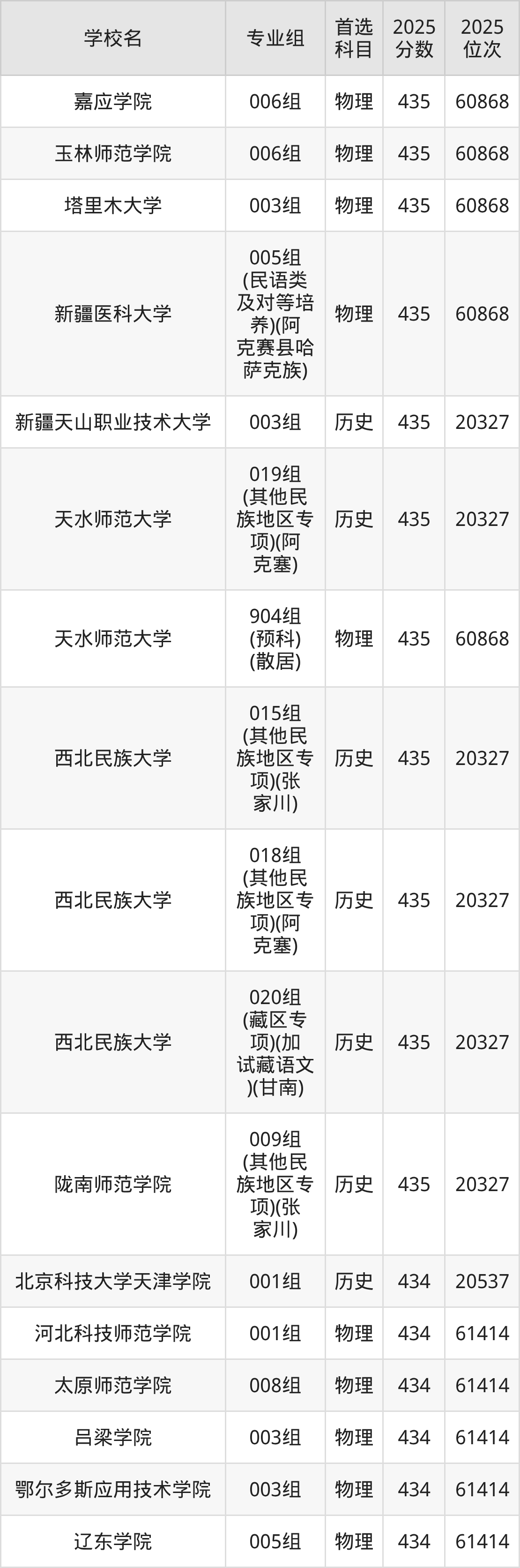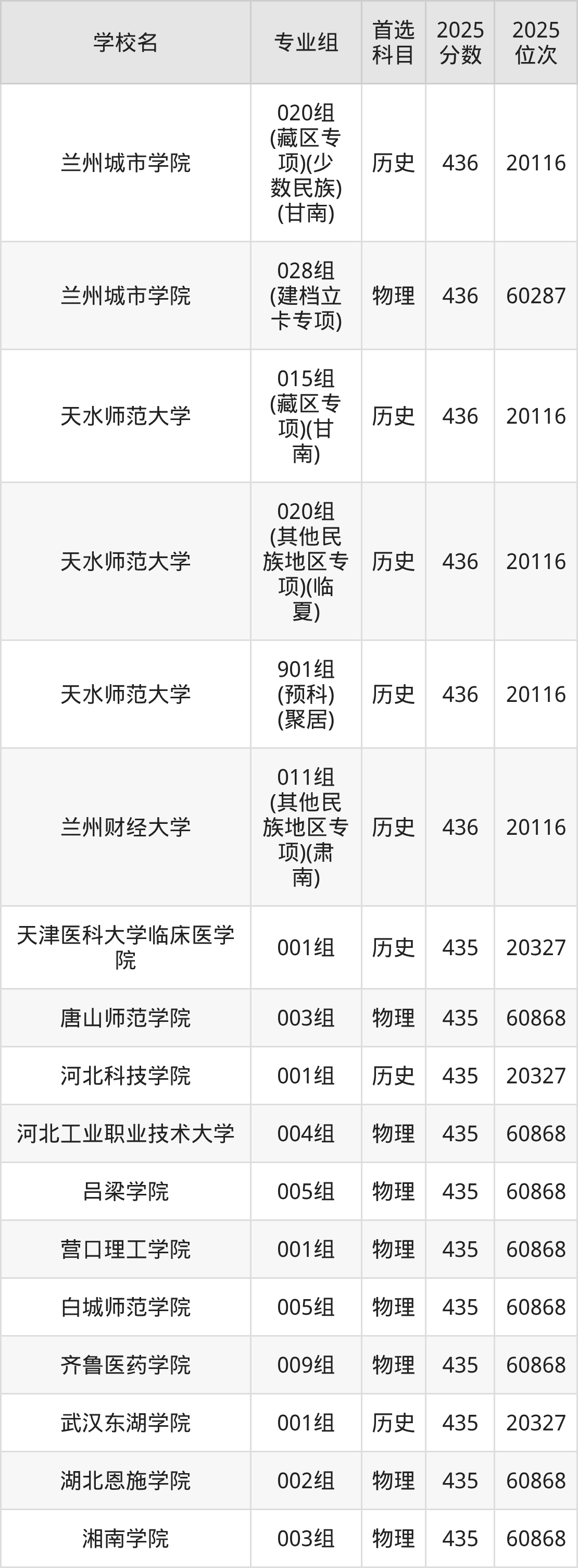 2025年在甘肃高考历史类录取分数线是435分的大学有天津医科大学临床医学院、河北科技学院、武汉东湖学院、新疆天山职业技术大学、天水师范大学、西北民族大学、陇南师范学院。物理类录取分数线是435分的大学有唐山师范学院、河北工业职业技术大学、吕梁学院、营口理工学院、白城师范学院、齐鲁医药学院、湖北恩施学院、湘南学院、嘉应学院、玉林师范学院等。