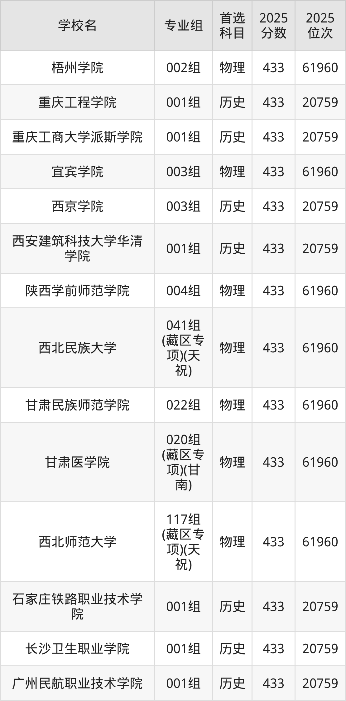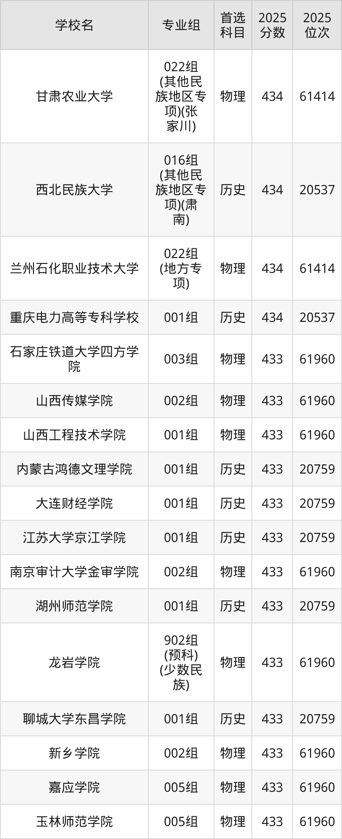 甘肃高考历史类435分对应的位次排名是20327名,物理类435分对应的位次排名是60868名,因此建议2026年位次排在这附近的同学考虑这些大学。