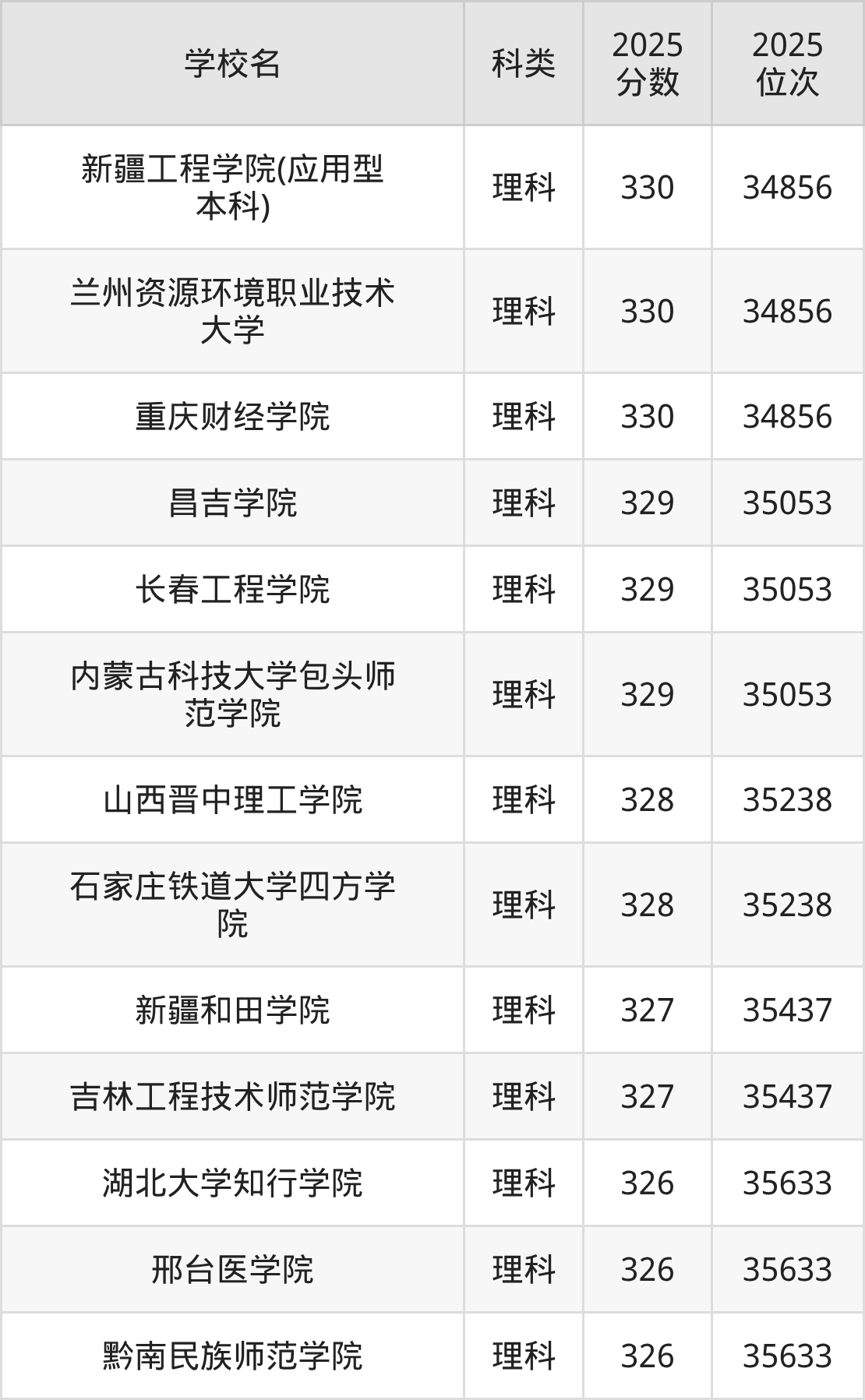 328分可以冲一冲的大学:新疆工程学院(应用型本科)330分、兰州资源环境职业技术大学330分、重庆财经学院330分、昌吉学院329分等;