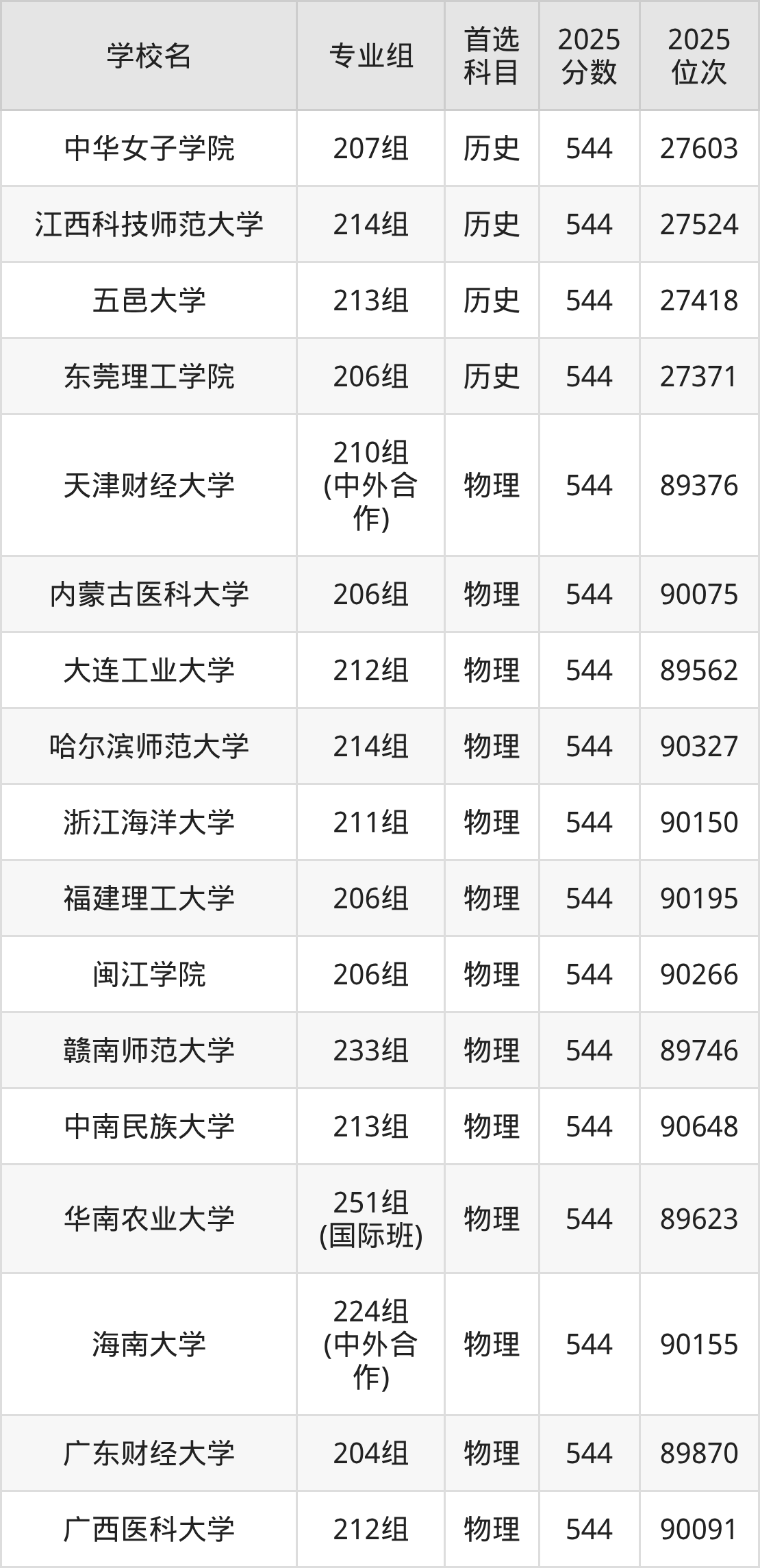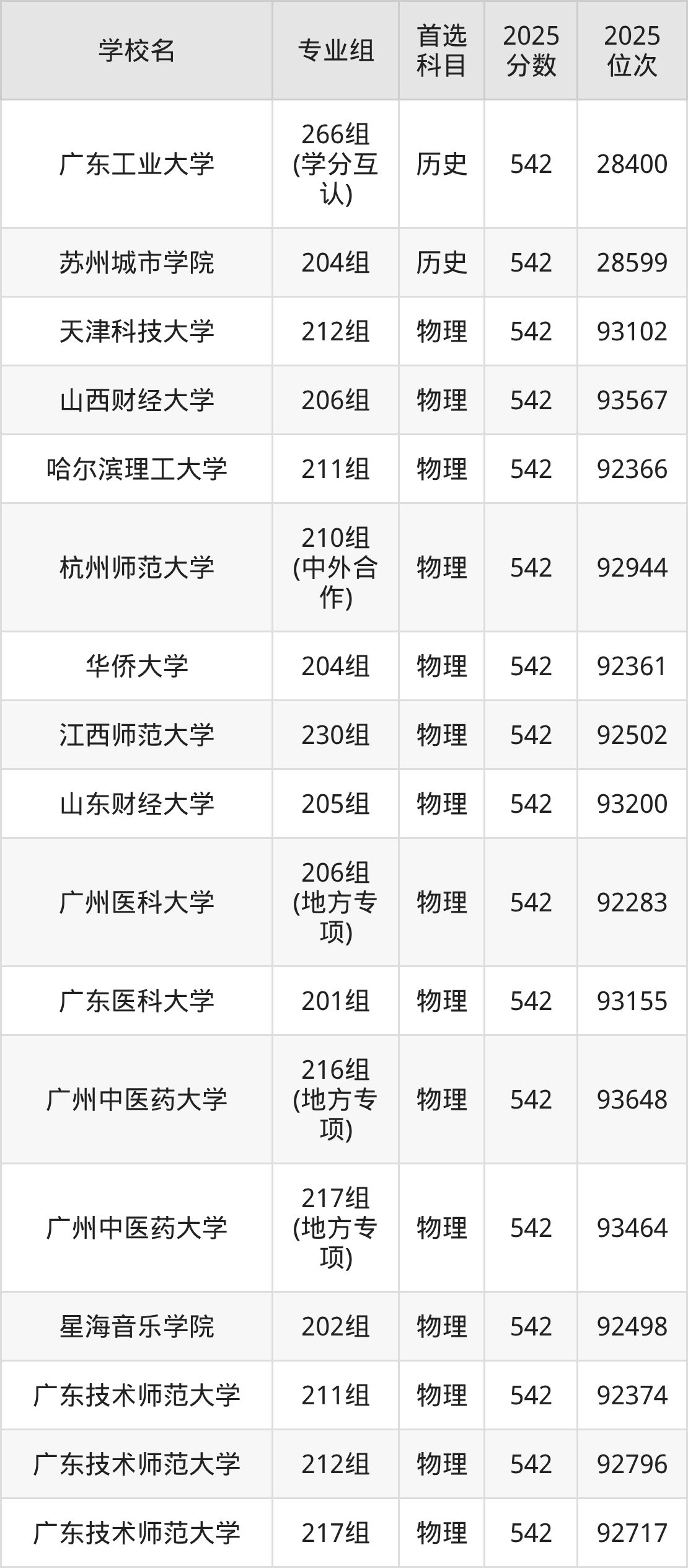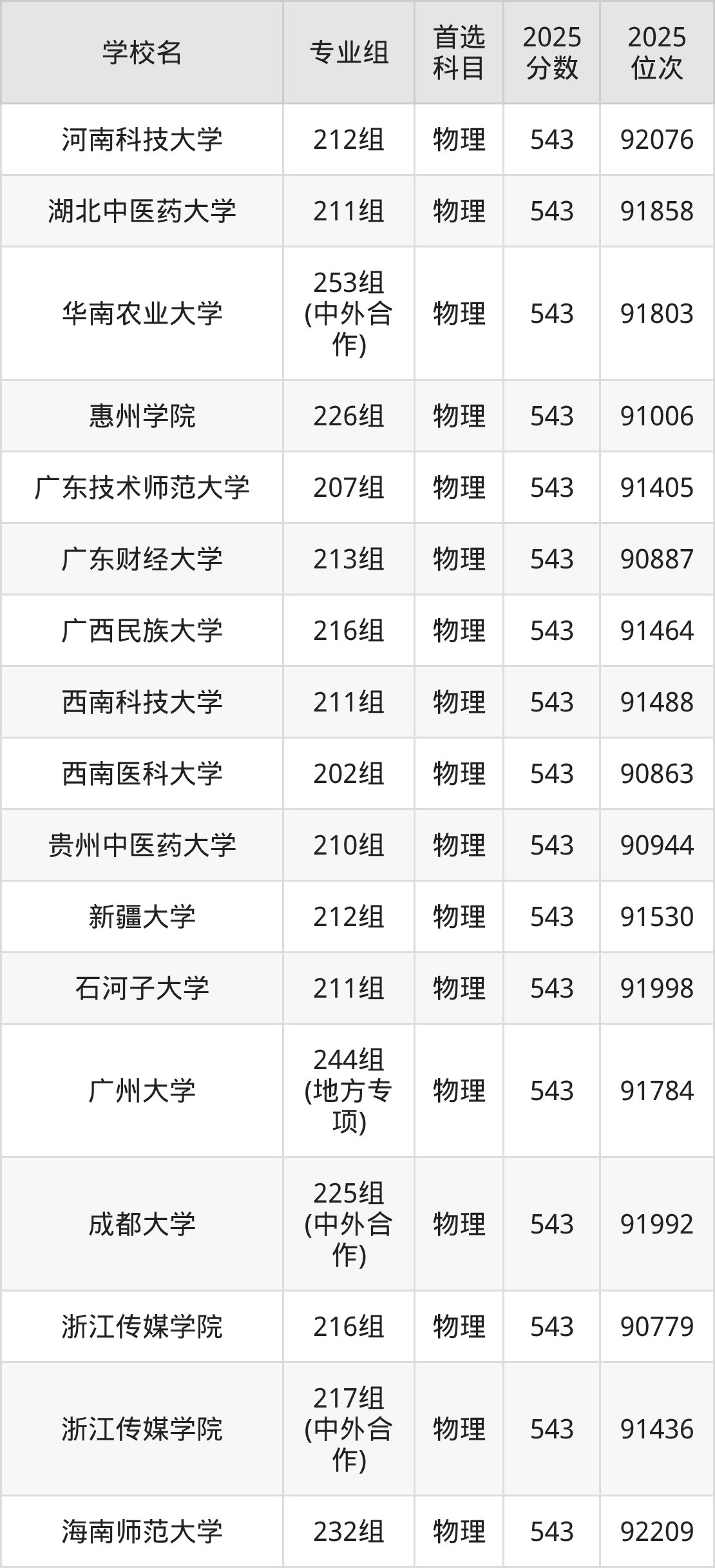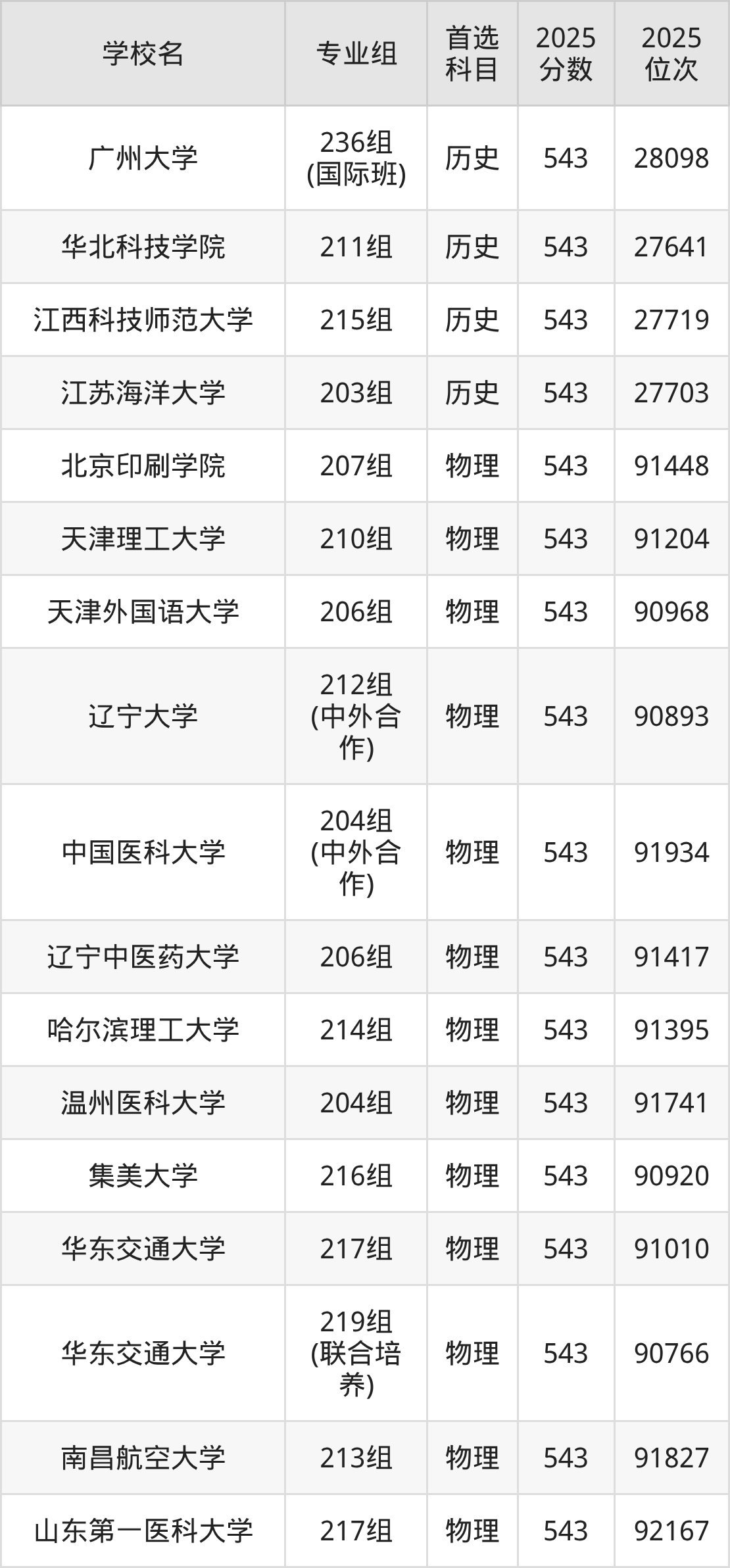 2025年在广东高考历史类录取分数线是543分的大学有东北电力大学、浙江海洋大学、江西理工大学、广州中医药大学、内江师范学院、天津城建大学、广州大学、华北科技学院、江西科技师范大学、江苏海洋大学。物理类录取分数线是543分的大学有北京印刷学院、天津理工大学、天津外国语大学、辽宁大学、中国医科大学、辽宁中医药大学、哈尔滨理工大学、温州医科大学、集美大学、华东交通大学等。