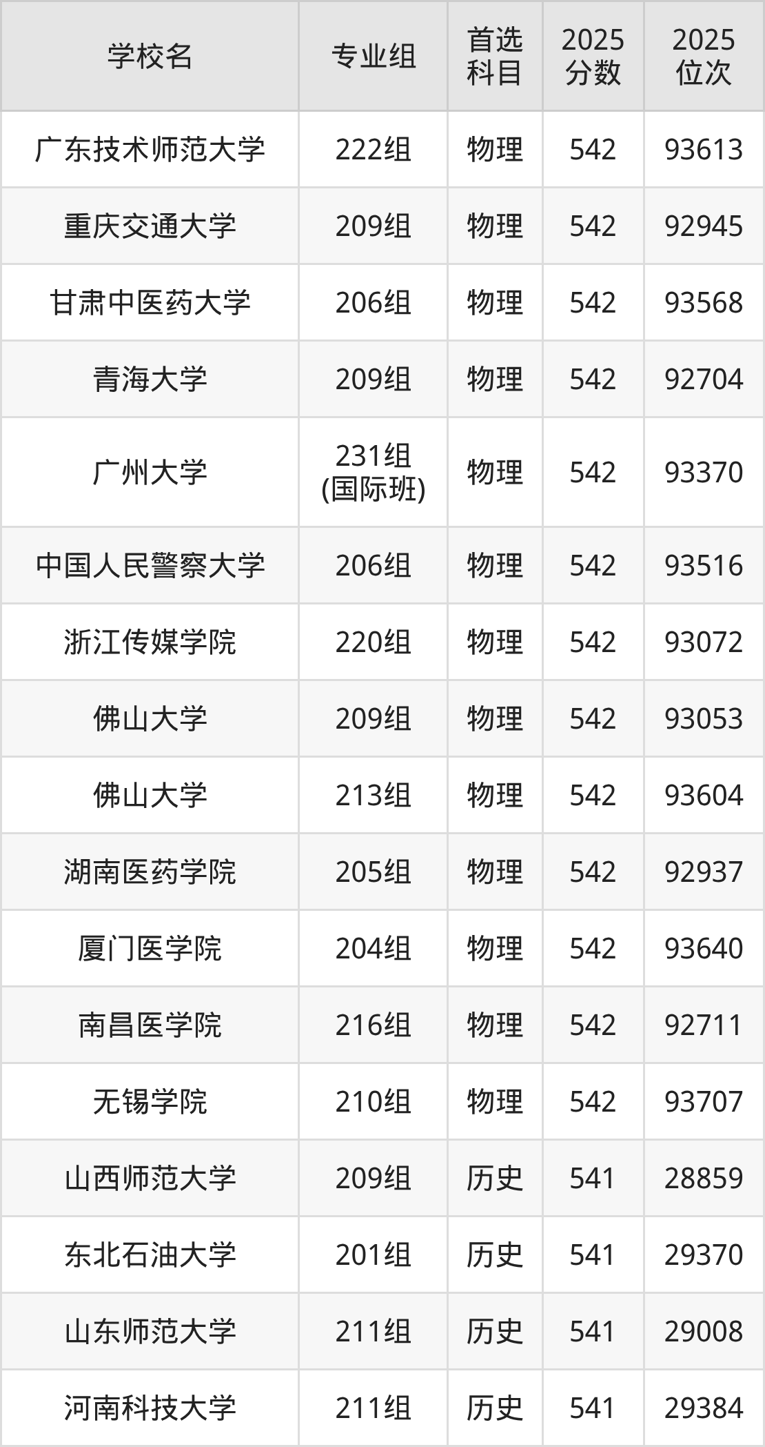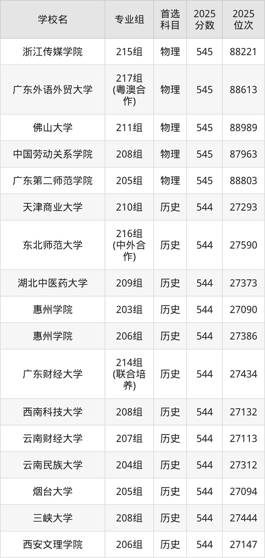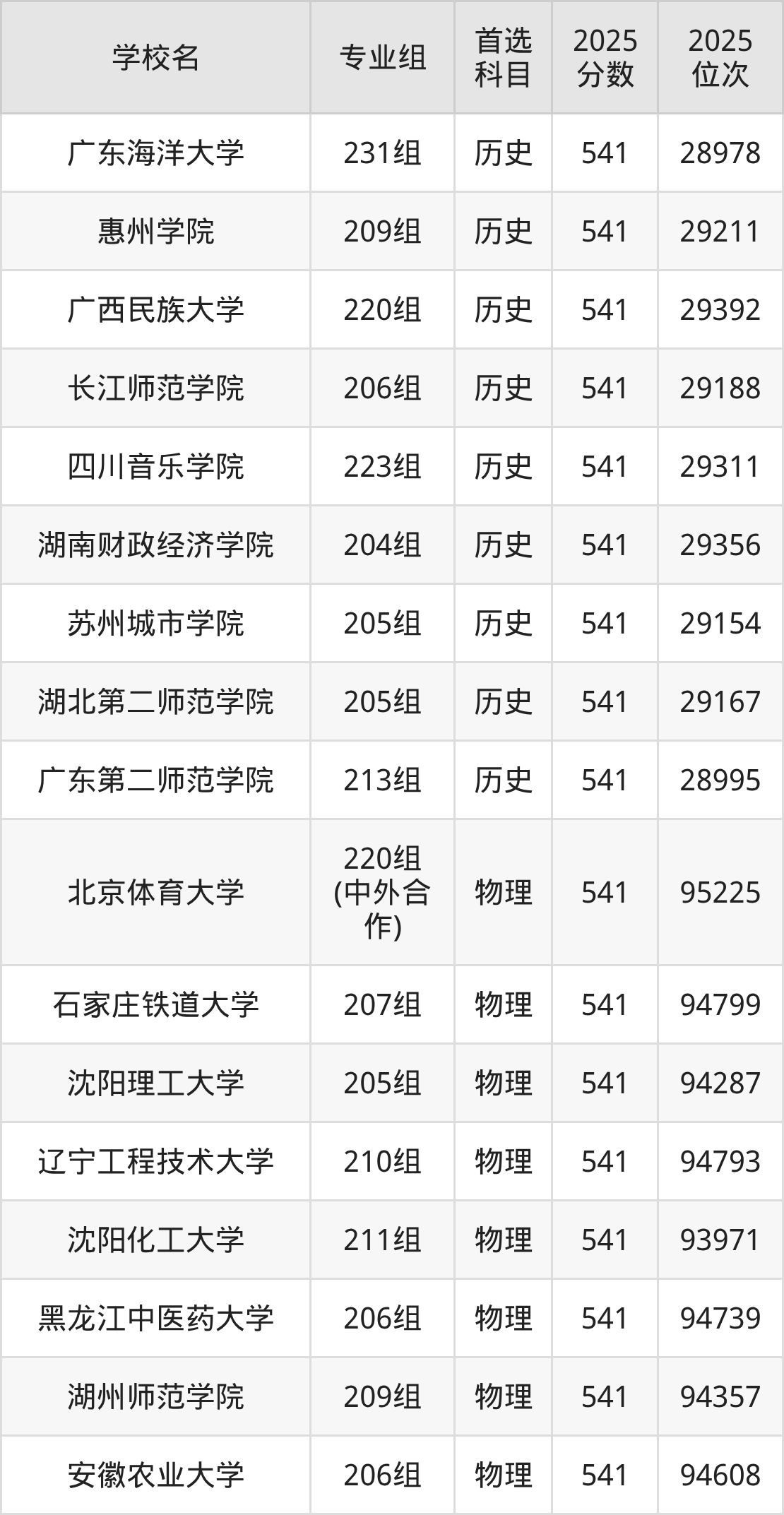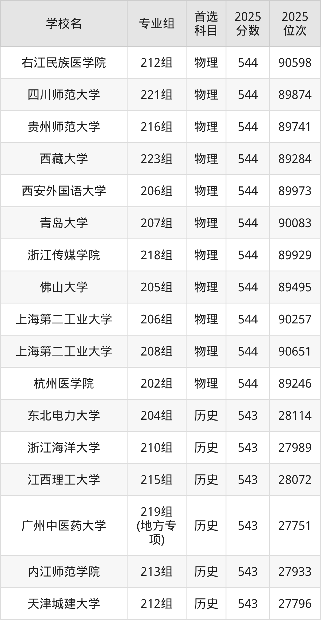 2025年在广东高考历史类录取分数线是543分的大学有东北电力大学、浙江海洋大学、江西理工大学、广州中医药大学、内江师范学院、天津城建大学、广州大学、华北科技学院、江西科技师范大学、江苏海洋大学。物理类录取分数线是543分的大学有北京印刷学院、天津理工大学、天津外国语大学、辽宁大学、中国医科大学、辽宁中医药大学、哈尔滨理工大学、温州医科大学、集美大学、华东交通大学等。