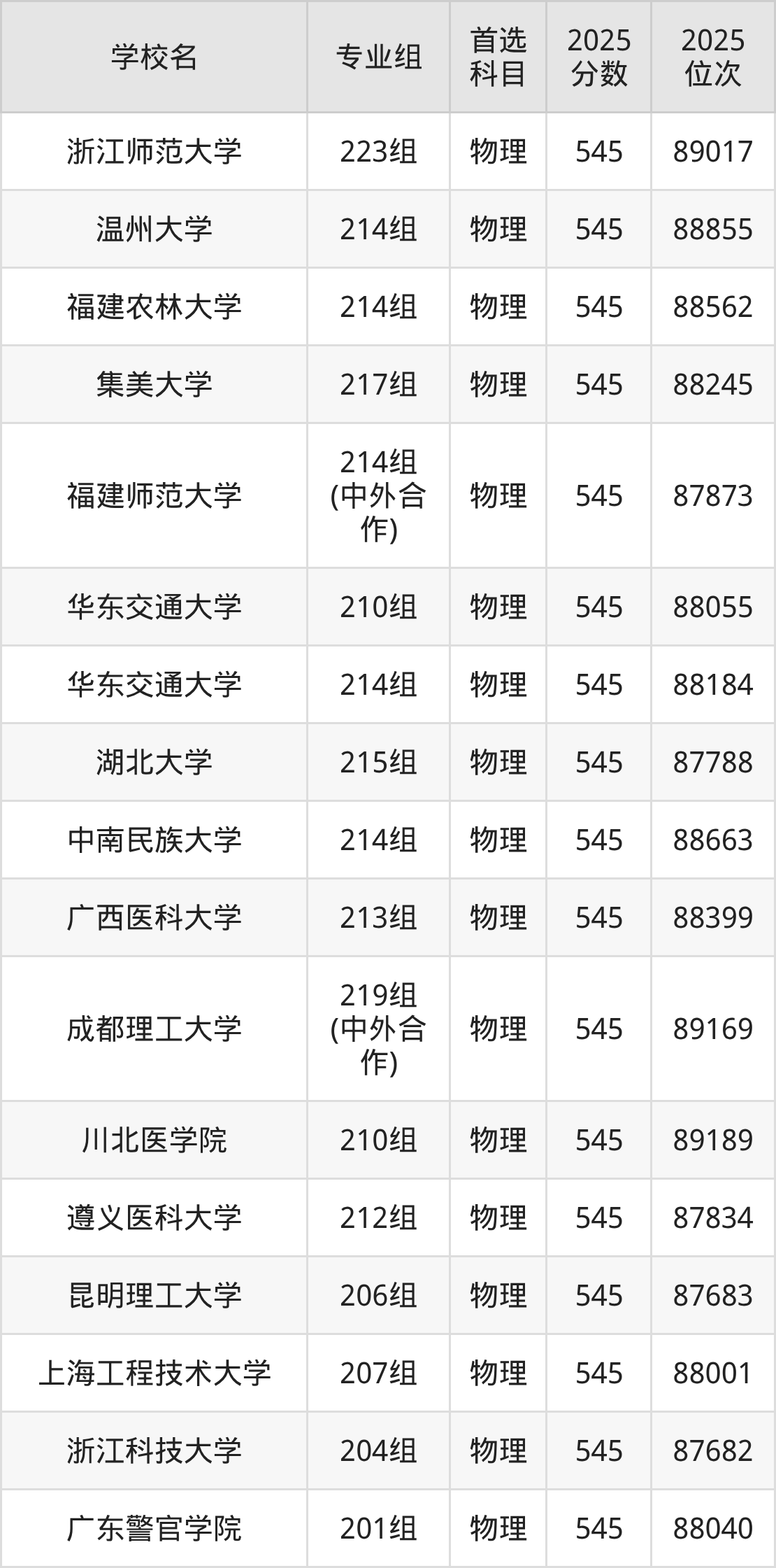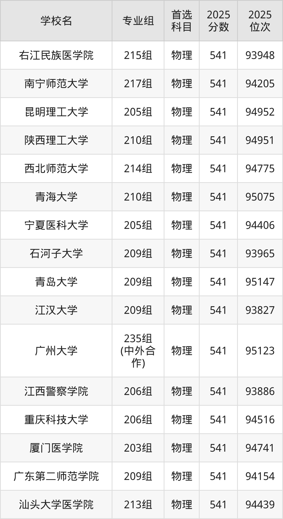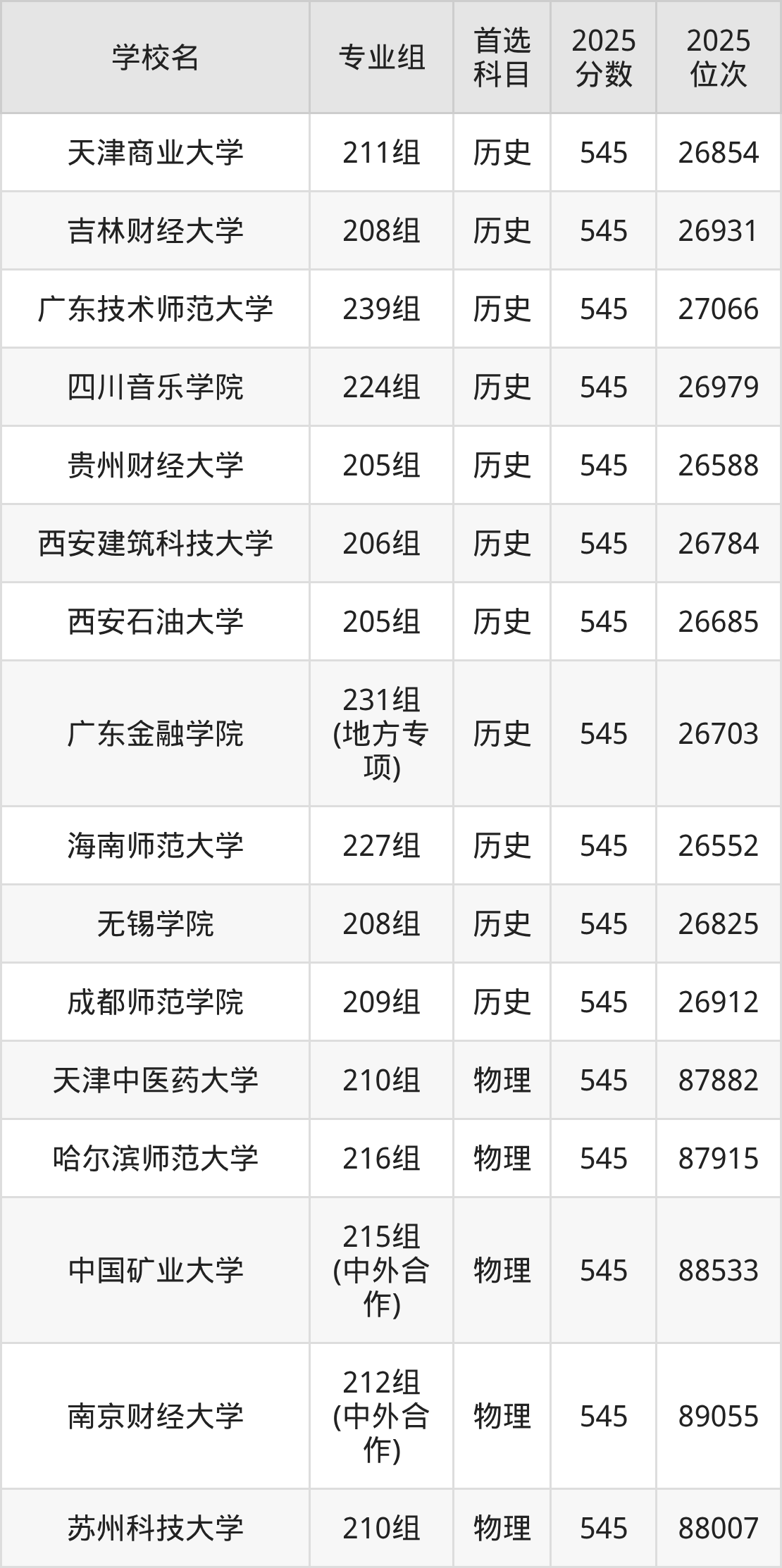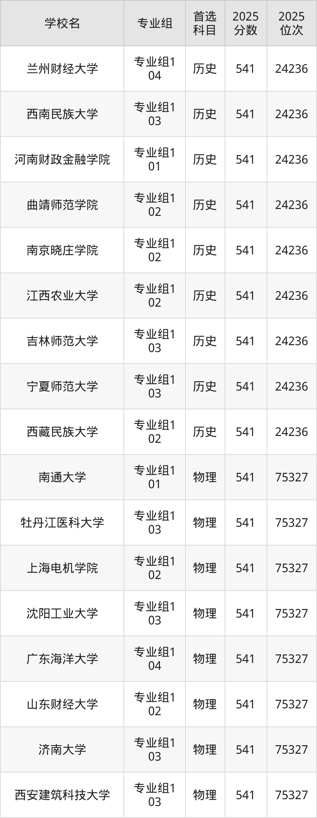 2025年在广东高考历史类录取分数线是543分的大学有东北电力大学、浙江海洋大学、江西理工大学、广州中医药大学、内江师范学院、天津城建大学、广州大学、华北科技学院、江西科技师范大学、江苏海洋大学。物理类录取分数线是543分的大学有北京印刷学院、天津理工大学、天津外国语大学、辽宁大学、中国医科大学、辽宁中医药大学、哈尔滨理工大学、温州医科大学、集美大学、华东交通大学等。