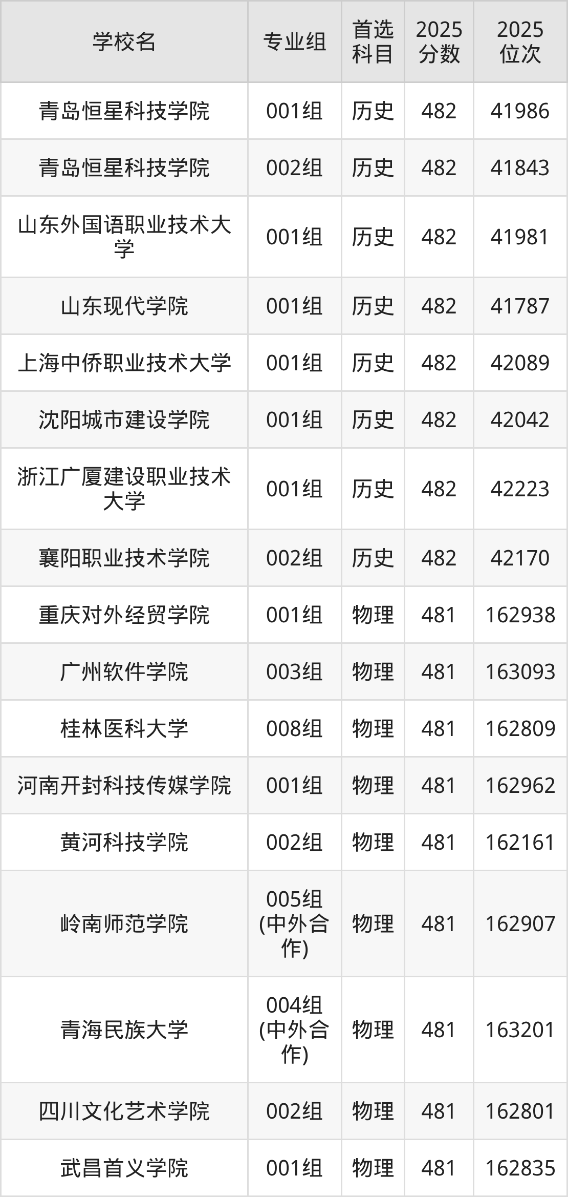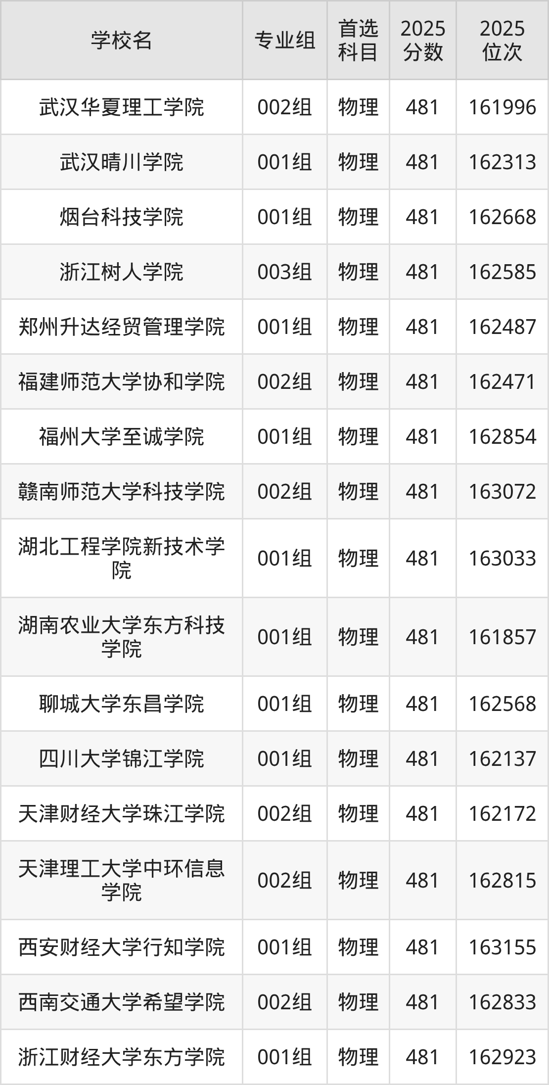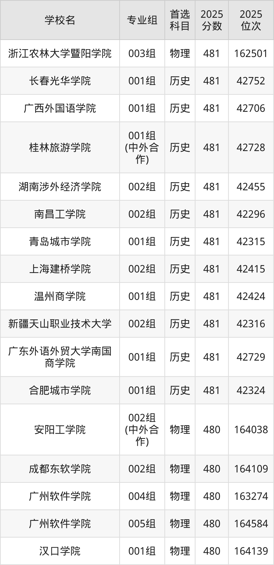 安徽高考物理类481分对应的位次排名是161857名-163201名,历史类481分对应的位次排名是42296名-42752名,因此建议2026年位次排在这附近的同学考虑这些大学。