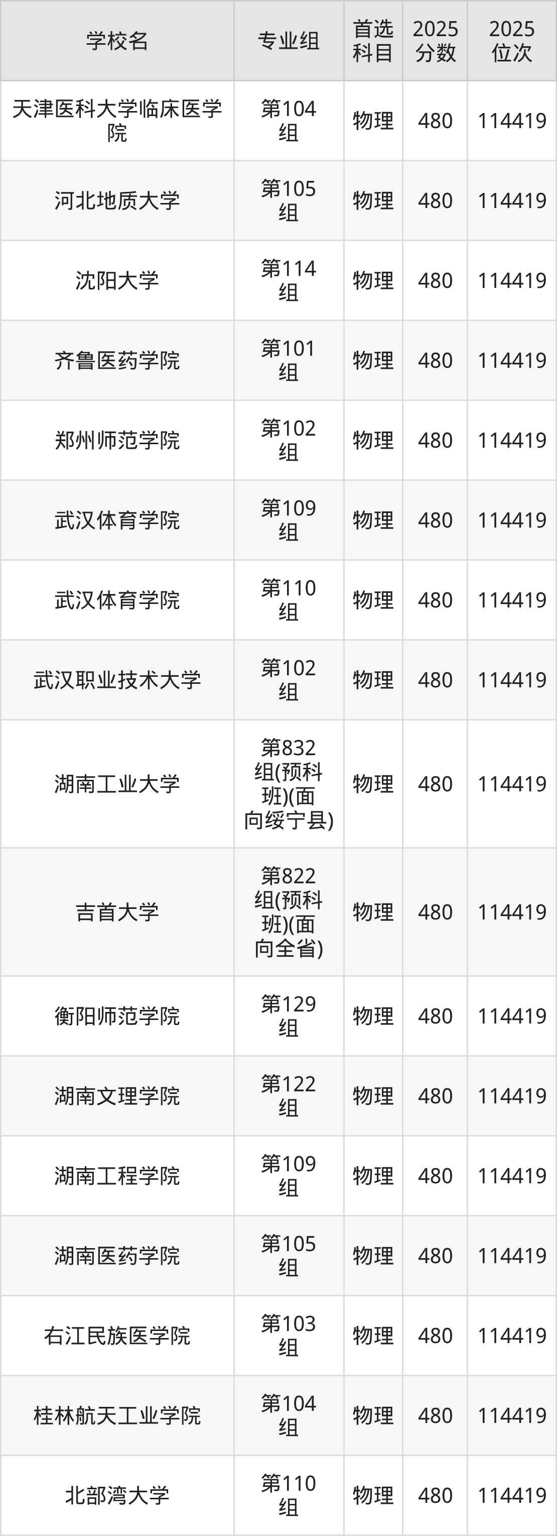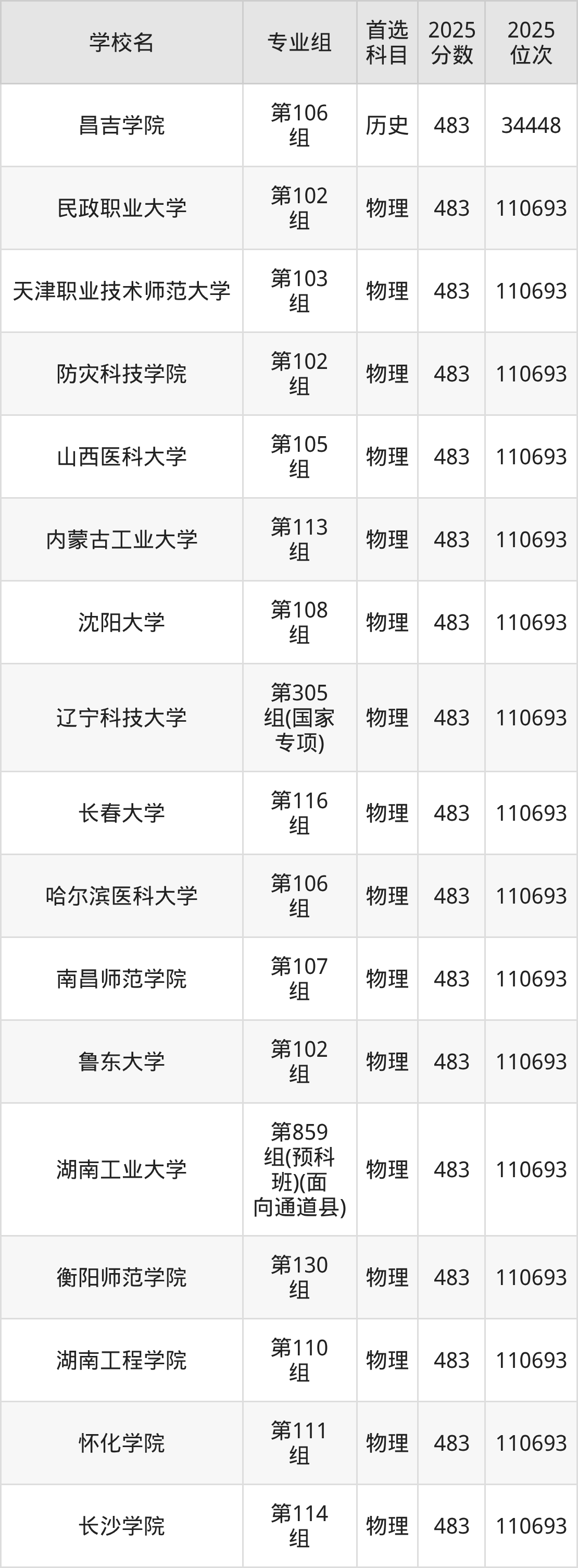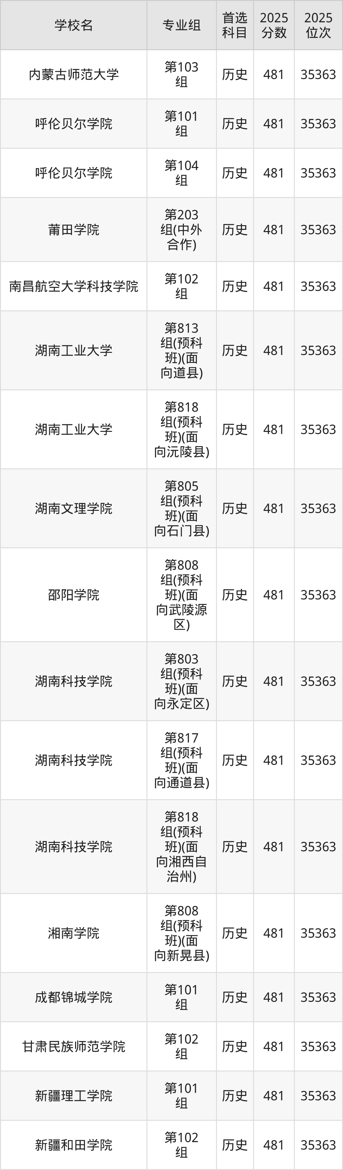 2025年在湖南高考历史类录取分数线是481分的大学有山西传媒学院、内蒙古师范大学、呼伦贝尔学院、莆田学院、南昌航空大学科技学院、湖南工业大学、湖南文理学院、邵阳学院、湖南科技学院、湘南学院等。物理类录取分数线是481分的大学有河北工程大学、山西医科大学、内蒙古工业大学、沈阳大学、沈阳建筑大学、辽宁石油化工大学、南通大学、湖州师范学院、温州肯恩大学、湖北工程学院等。