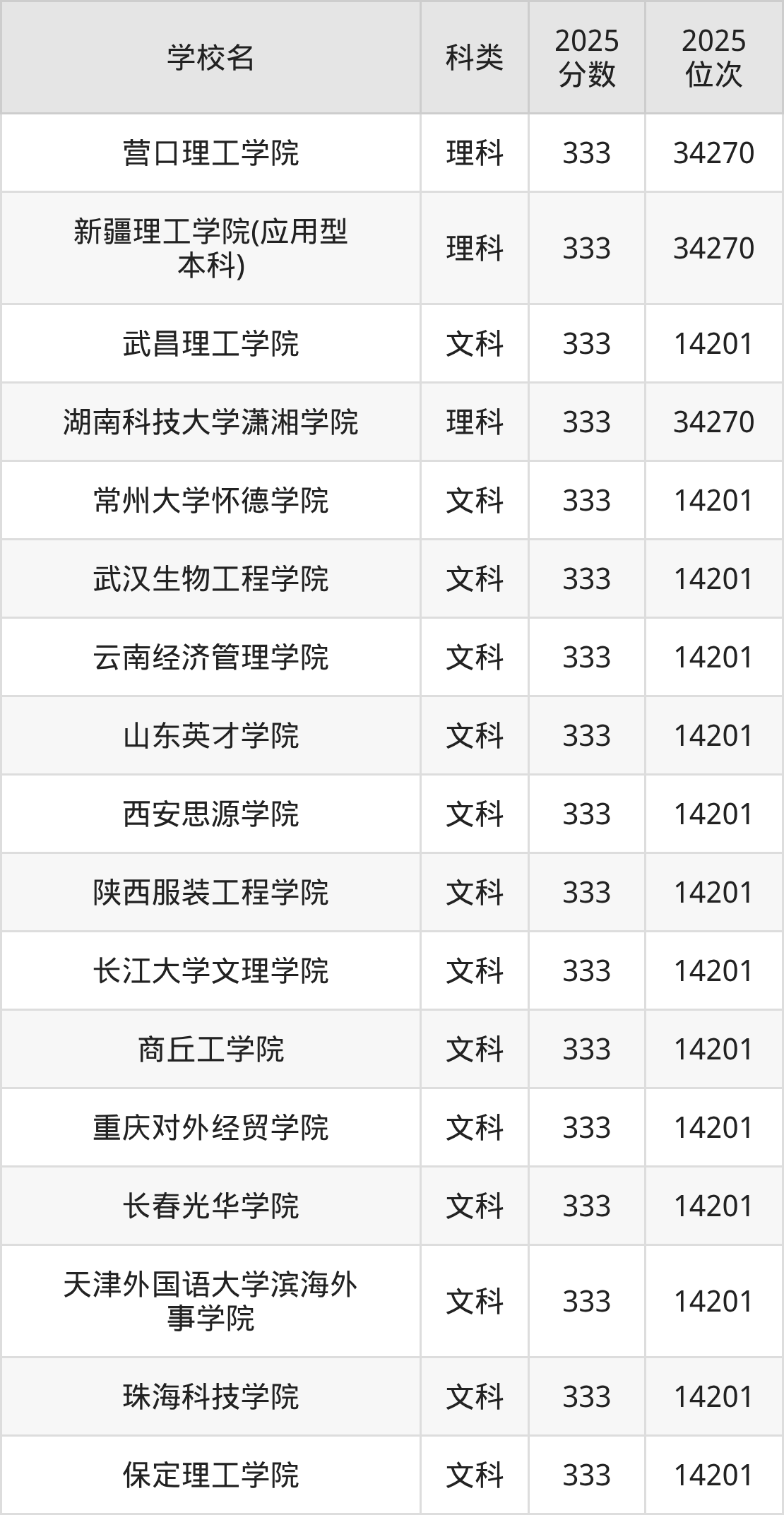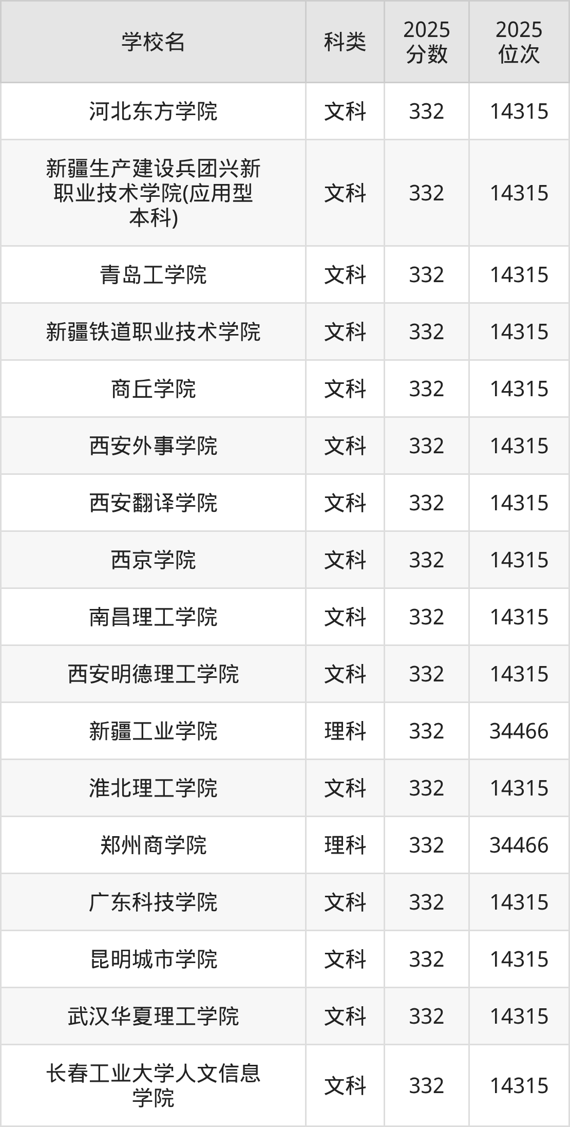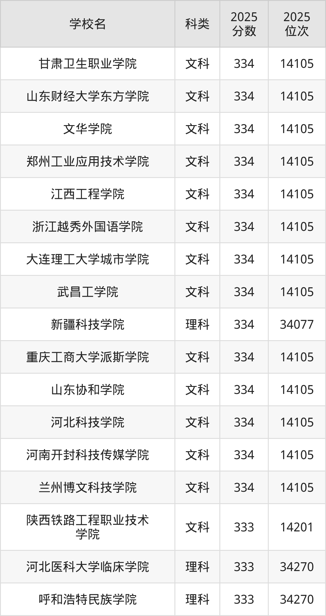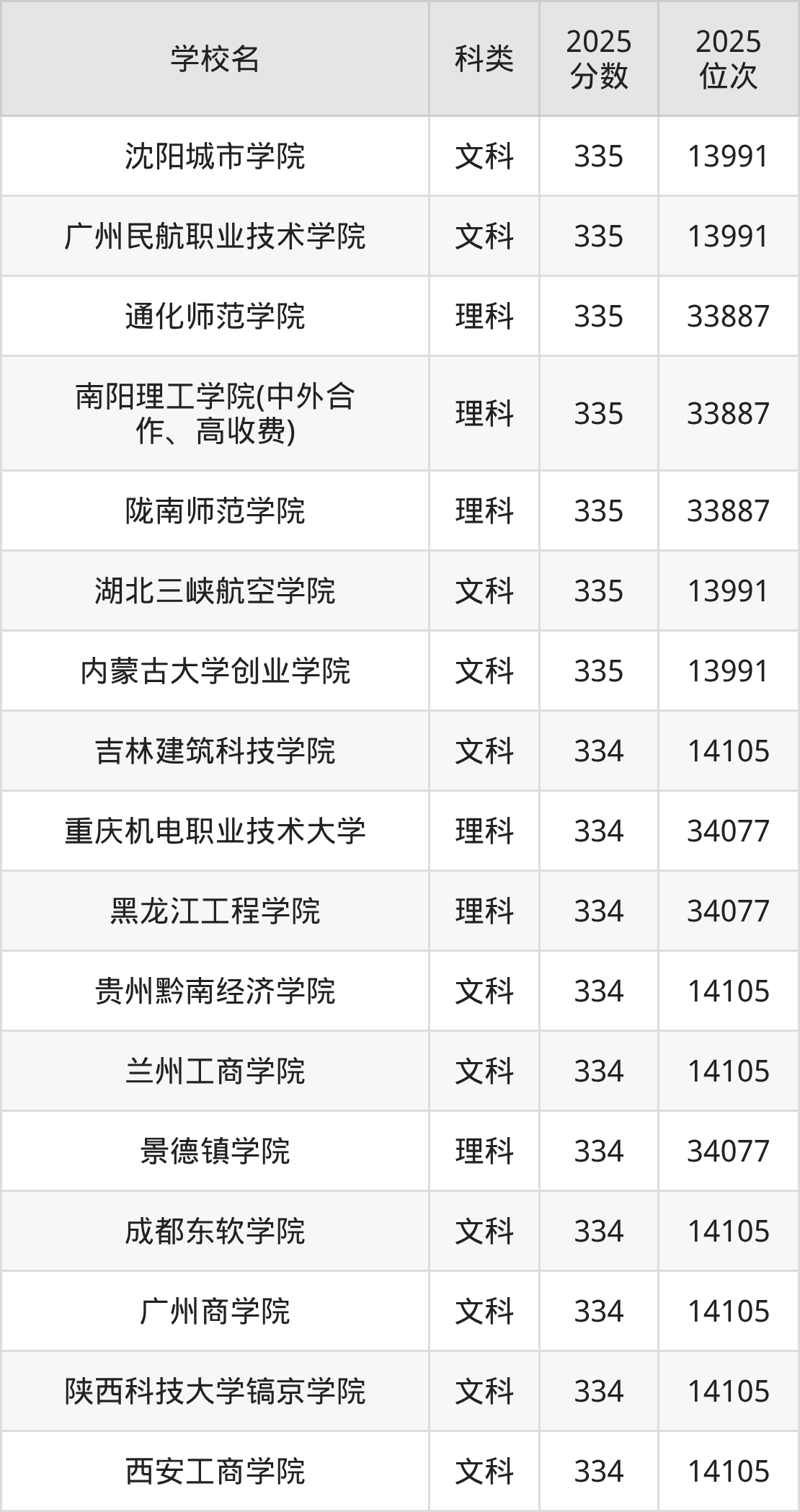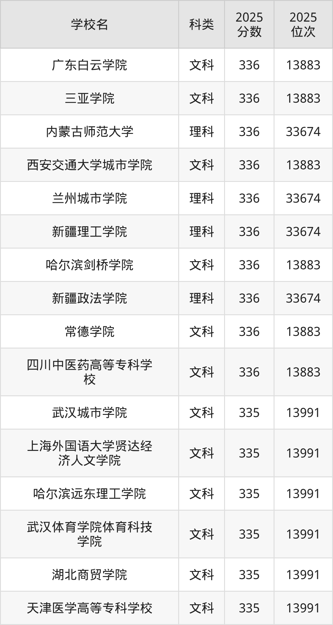 2025年在新疆高考文科录取分数线是334分的大学有吉林建筑科技学院、贵州黔南经济学院、兰州工商学院、成都东软学院、广州商学院、陕西科技大学镐京学院、西安工商学院、甘肃卫生职业学院、山东财经大学东方学院、文华学院等。理科录取分数线是334分的大学有重庆机电职业技术大学、黑龙江工程学院、景德镇学院、新疆科技学院。