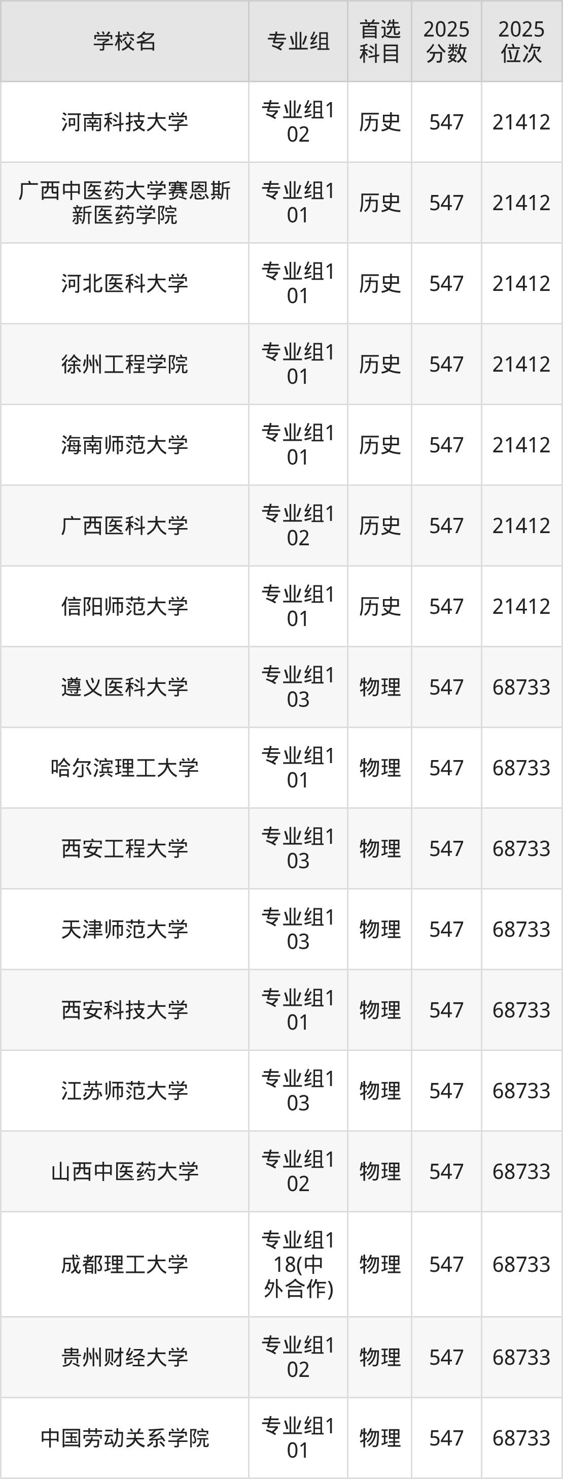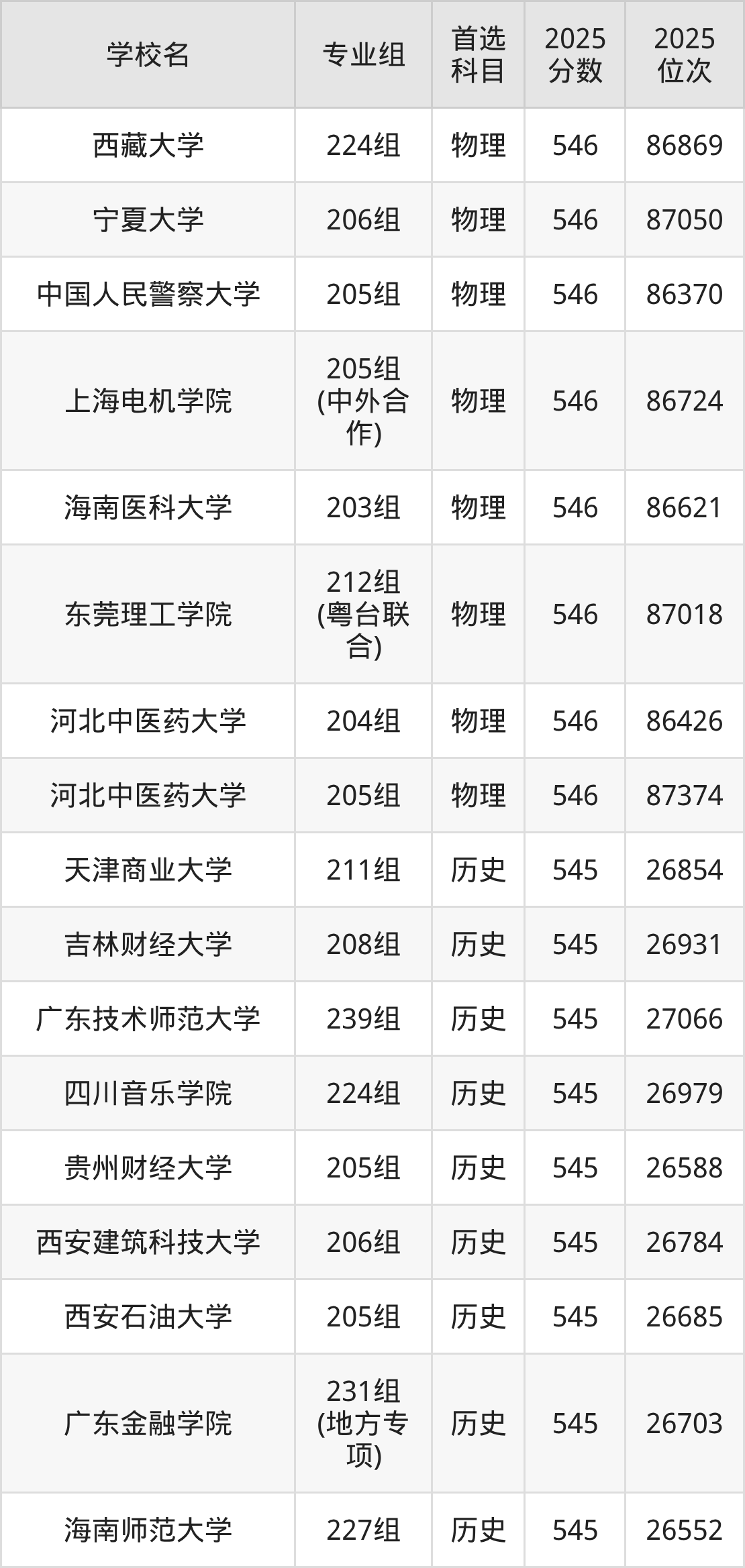 2025年在广东高考历史类录取分数线是545分的大学有天津商业大学、吉林财经大学、广东技术师范大学、四川音乐学院、贵州财经大学、西安建筑科技大学、西安石油大学、广东金融学院、海南师范大学、无锡学院等。物理类录取分数线是545分的大学有天津中医药大学、哈尔滨师范大学、中国矿业大学、南京财经大学、苏州科技大学、浙江师范大学、温州大学、福建农林大学、集美大学、福建师范大学等。