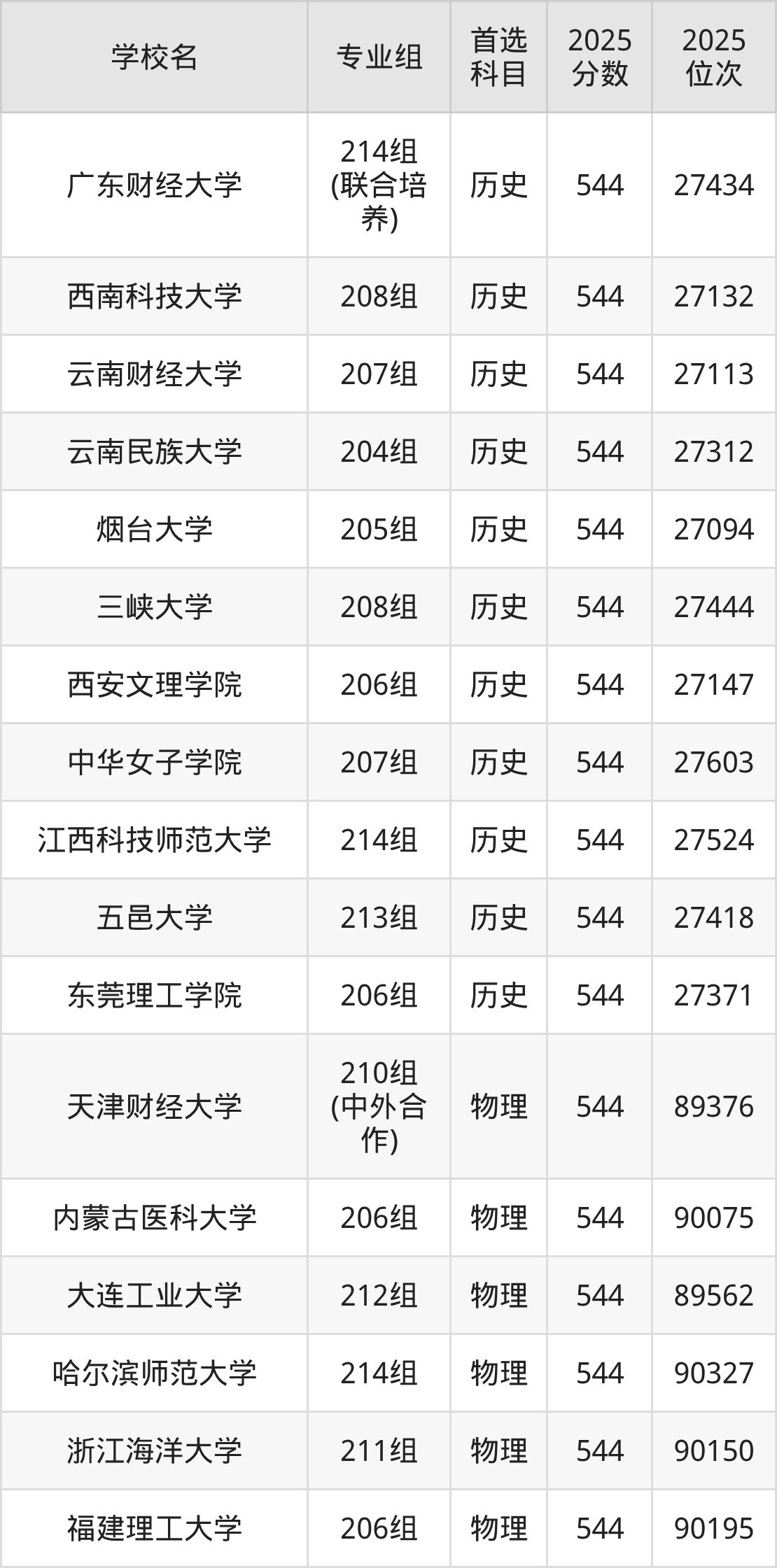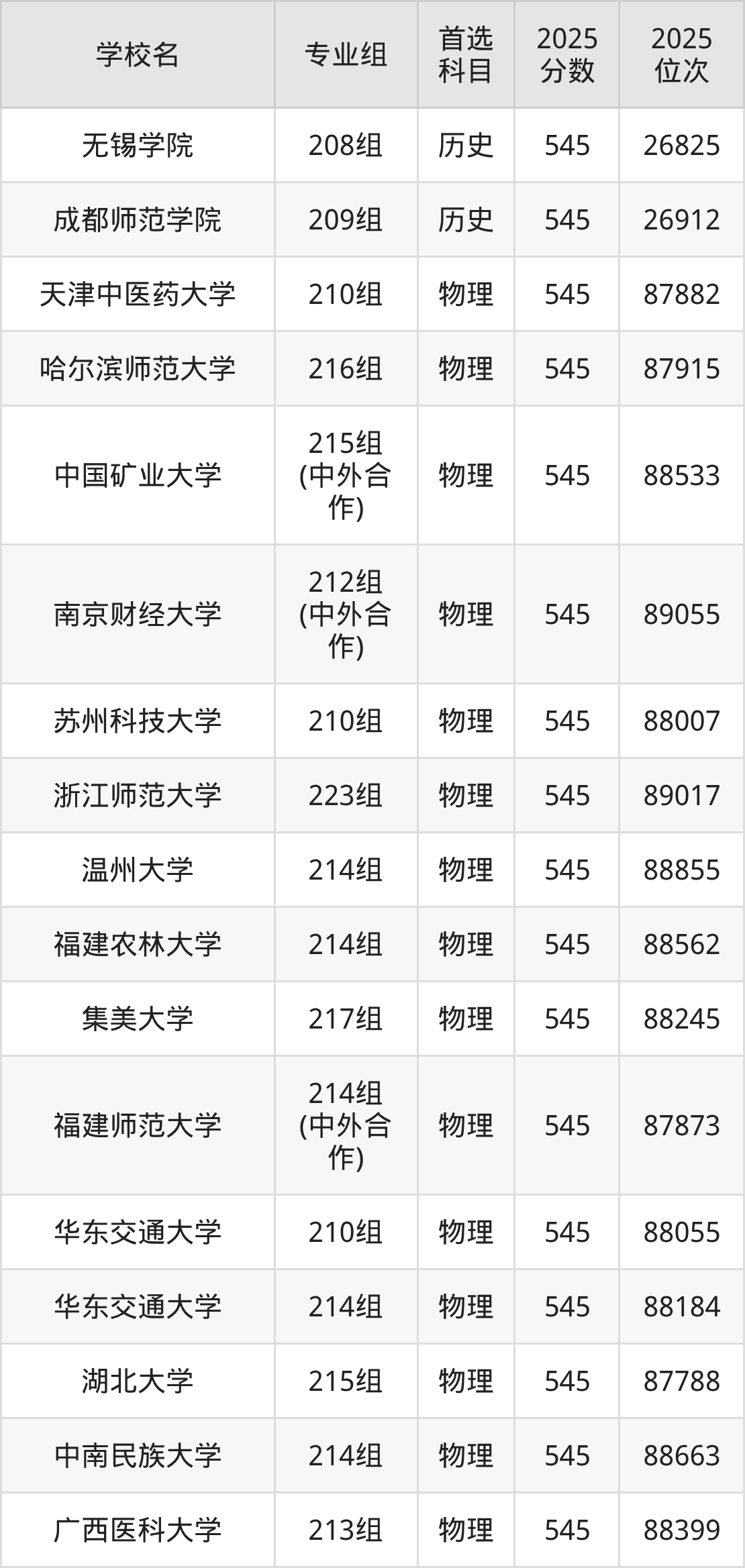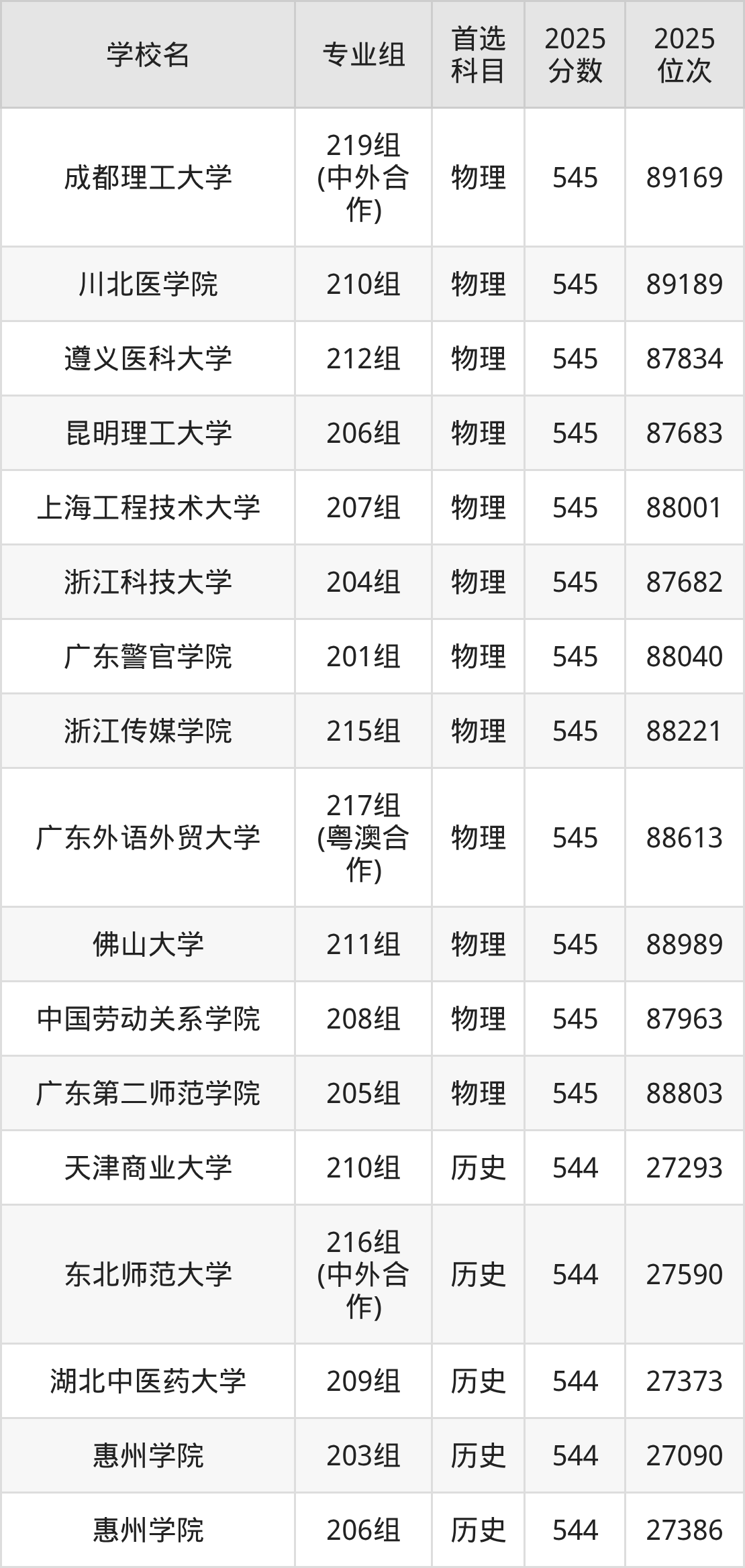 广东高考历史类545分对应的位次排名是26552名-27066名,物理类545分对应的位次排名是87682名-89189名,因此建议2026年位次排在这附近的同学考虑这些大学。