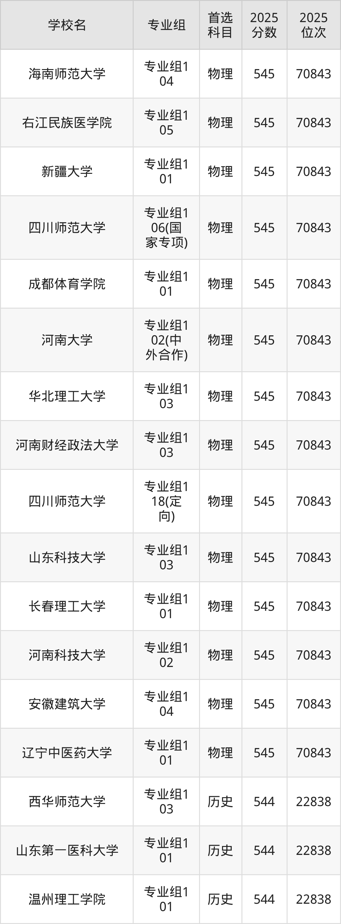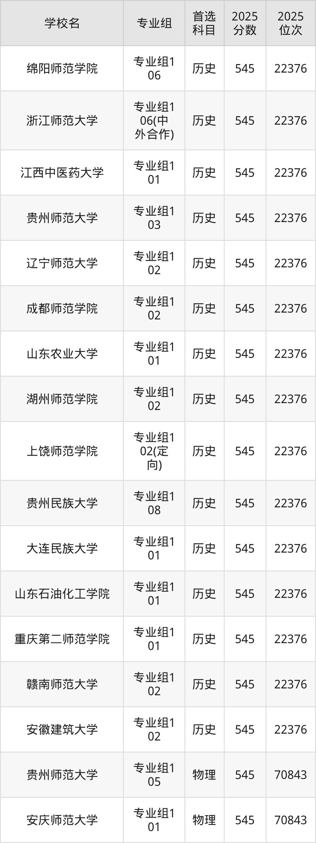 四川高考历史类545分对应的位次排名是22376名,物理类545分对应的位次排名是70843名,因此建议2026年位次排在这附近的同学考虑这些大学。