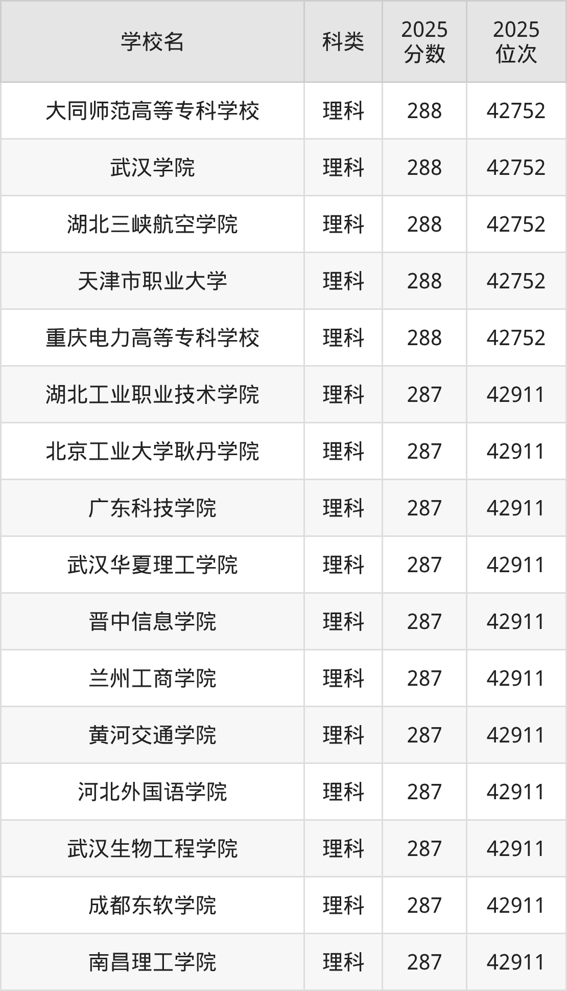 286分可以冲一冲的大学:大同师范高等专科学校288分、武汉学院288分、湖北三峡航空学院288分、天津市职业大学288分等;
