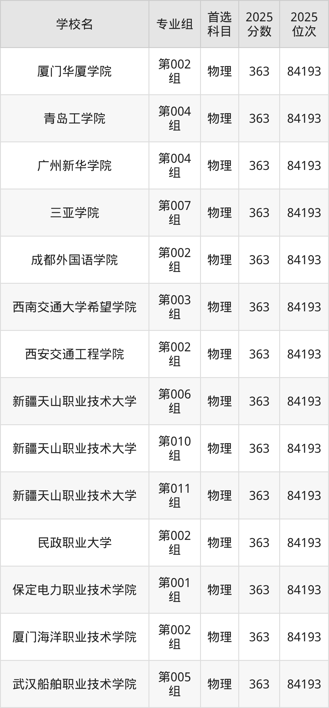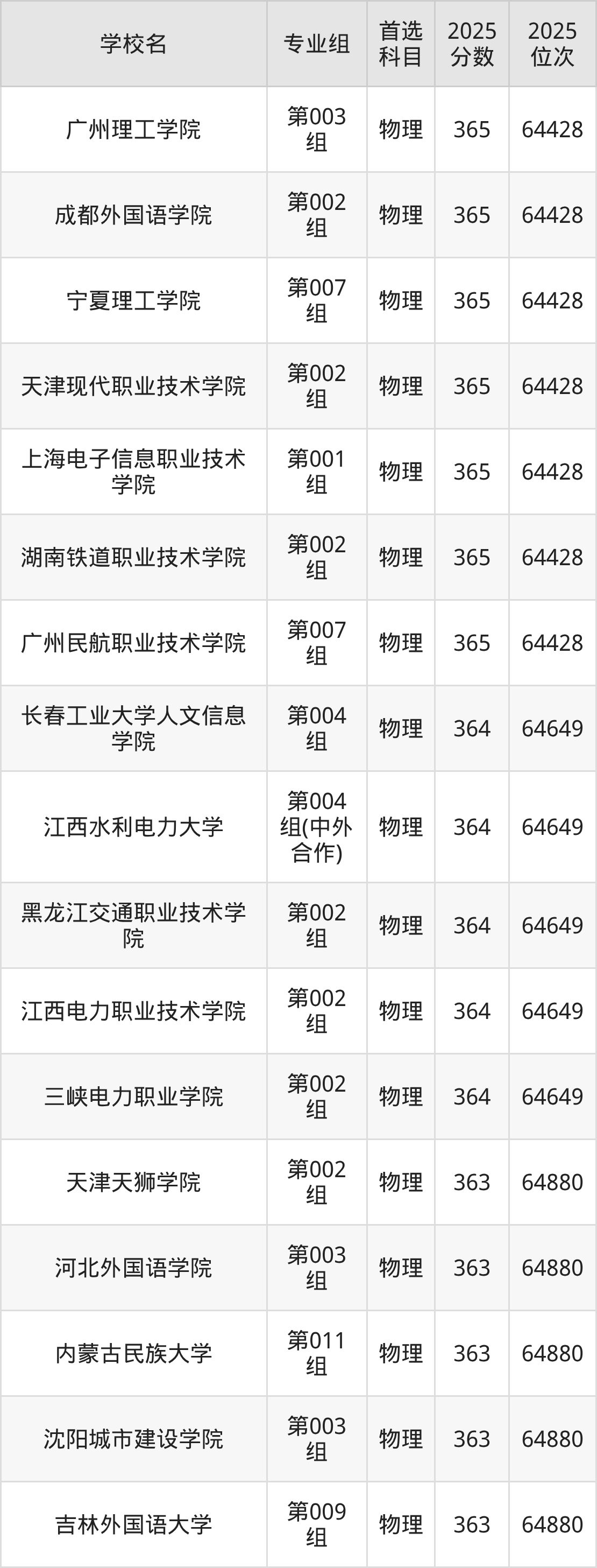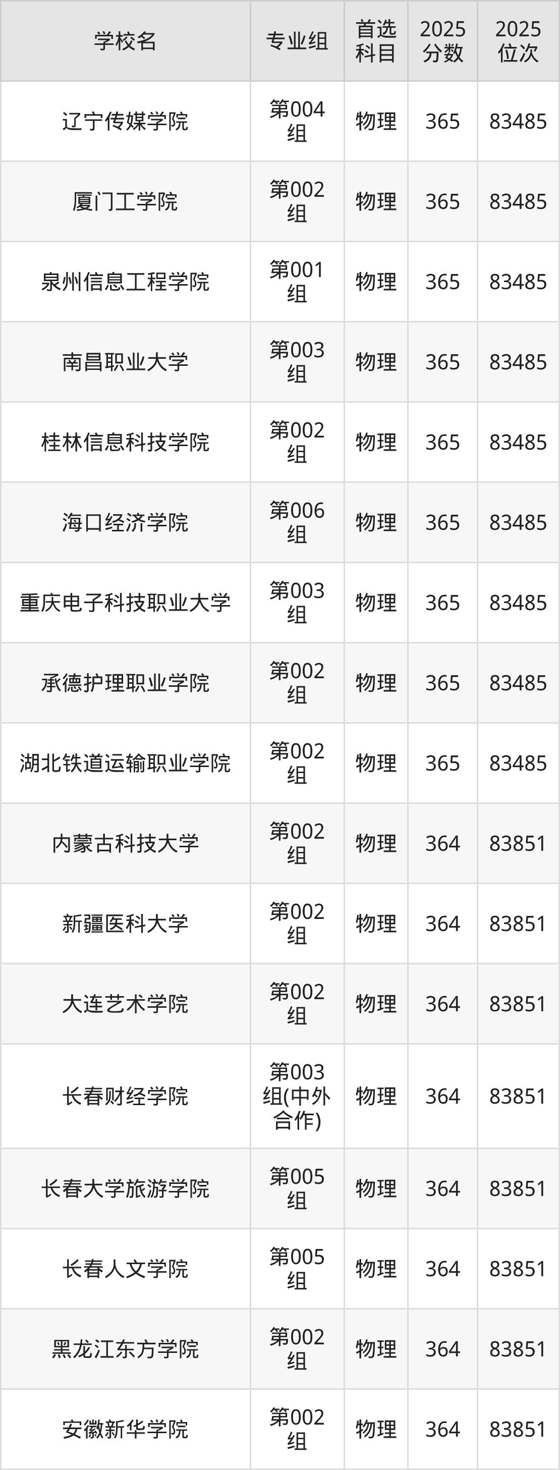 2025年在吉林高考录取分数线是365分的大学一共有9所,分别是吉林动画学院、广州城市理工学院、广州理工学院、成都外国语学院、宁夏理工学院、天津现代职业技术学院、上海电子信息职业技术学院、湖南铁道职业技术学院、广州民航职业技术学院。