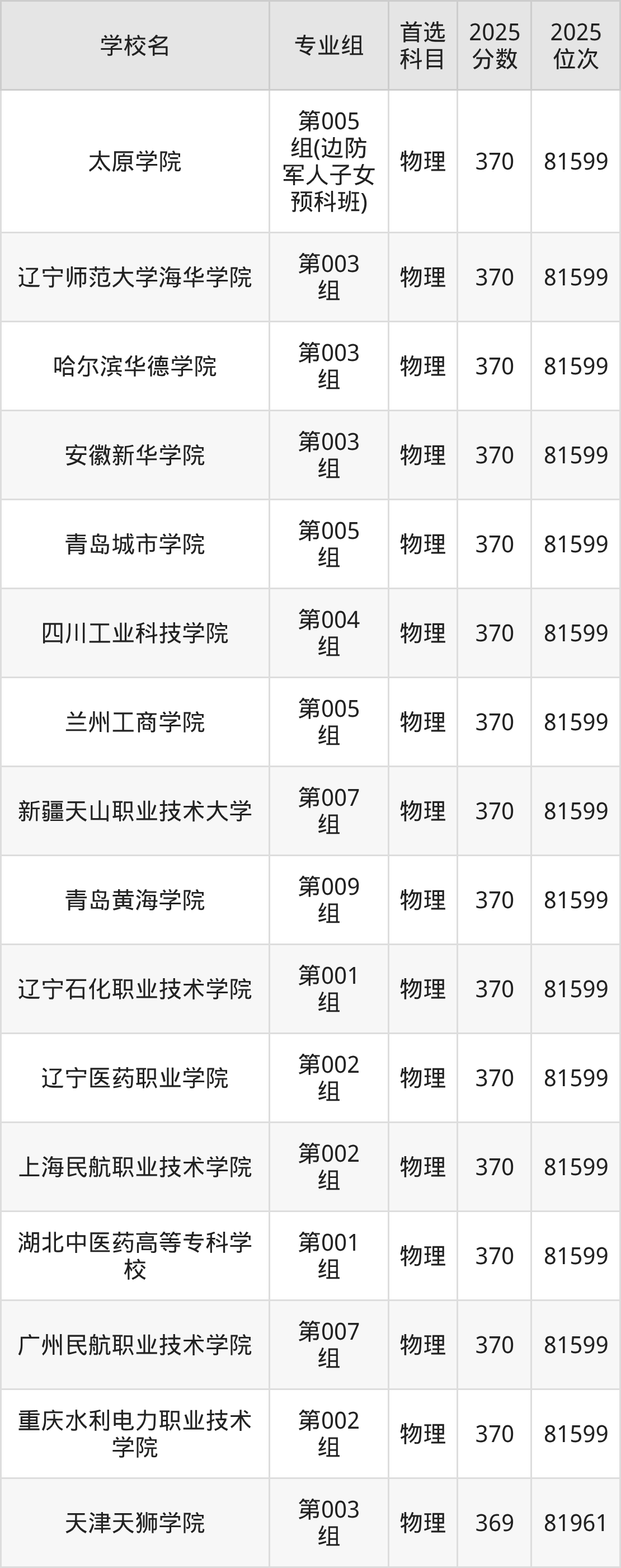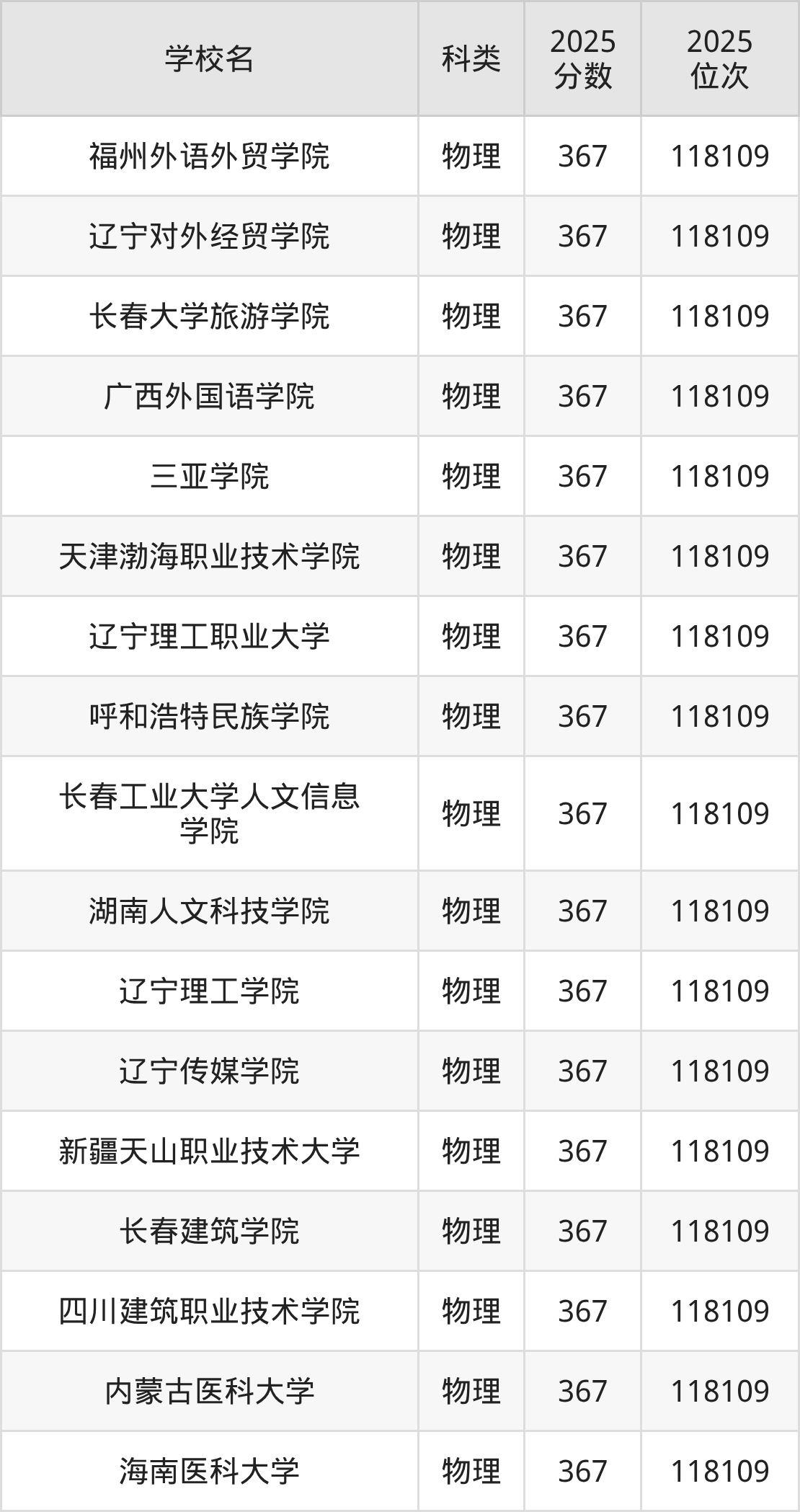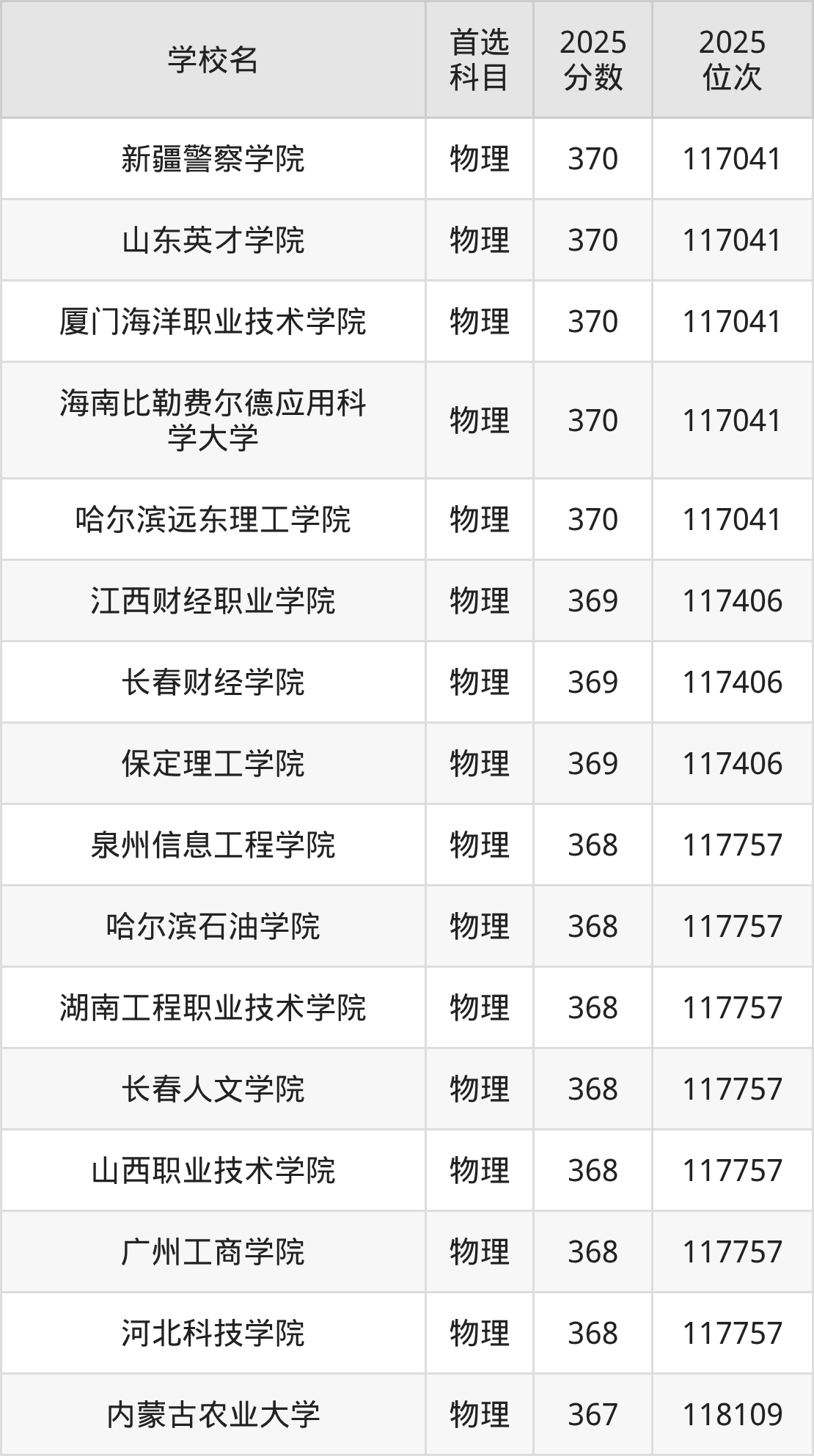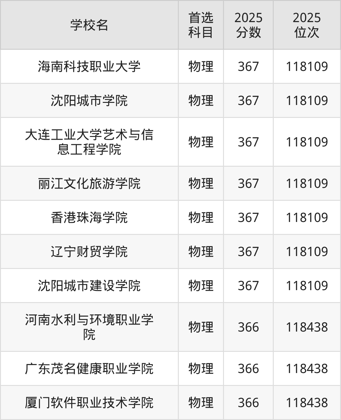 辽宁物理类368分对应的位次排名是117757名,因此建议2026年位次排在这附近的考生考虑这些大学。