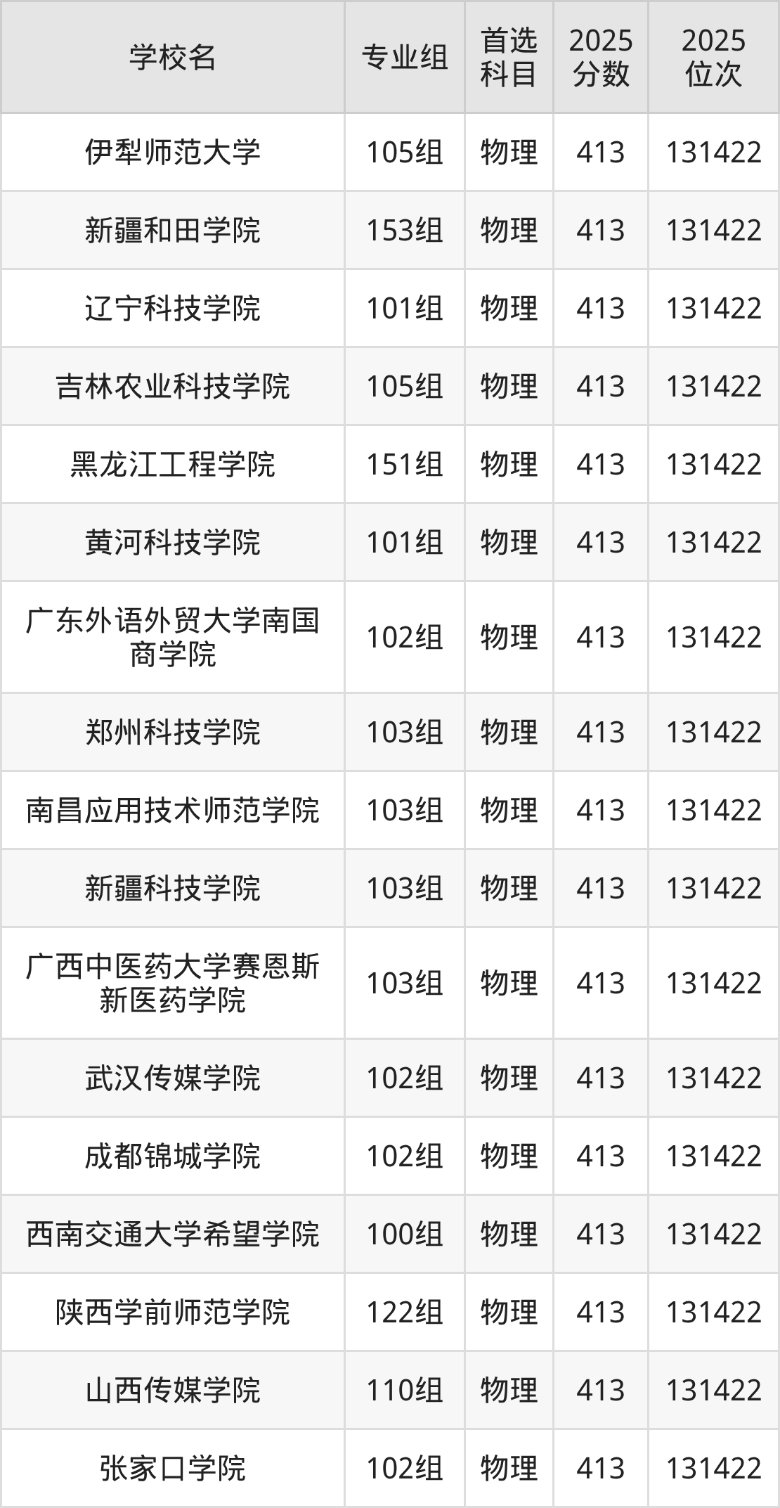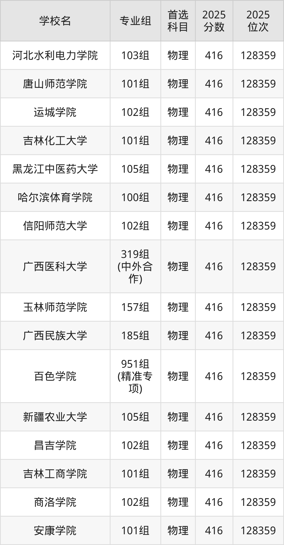 物理类414分可以冲的大学:河北水利电力学院416分、唐山师范学院416分、运城学院416分、吉林化工大学416分等;较稳妥的大学:长治医学院413分、内蒙古师范大学413分、内蒙古民族大学413分、白城师范学院413分等。