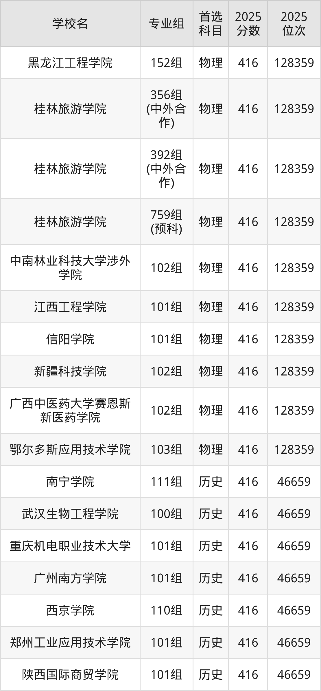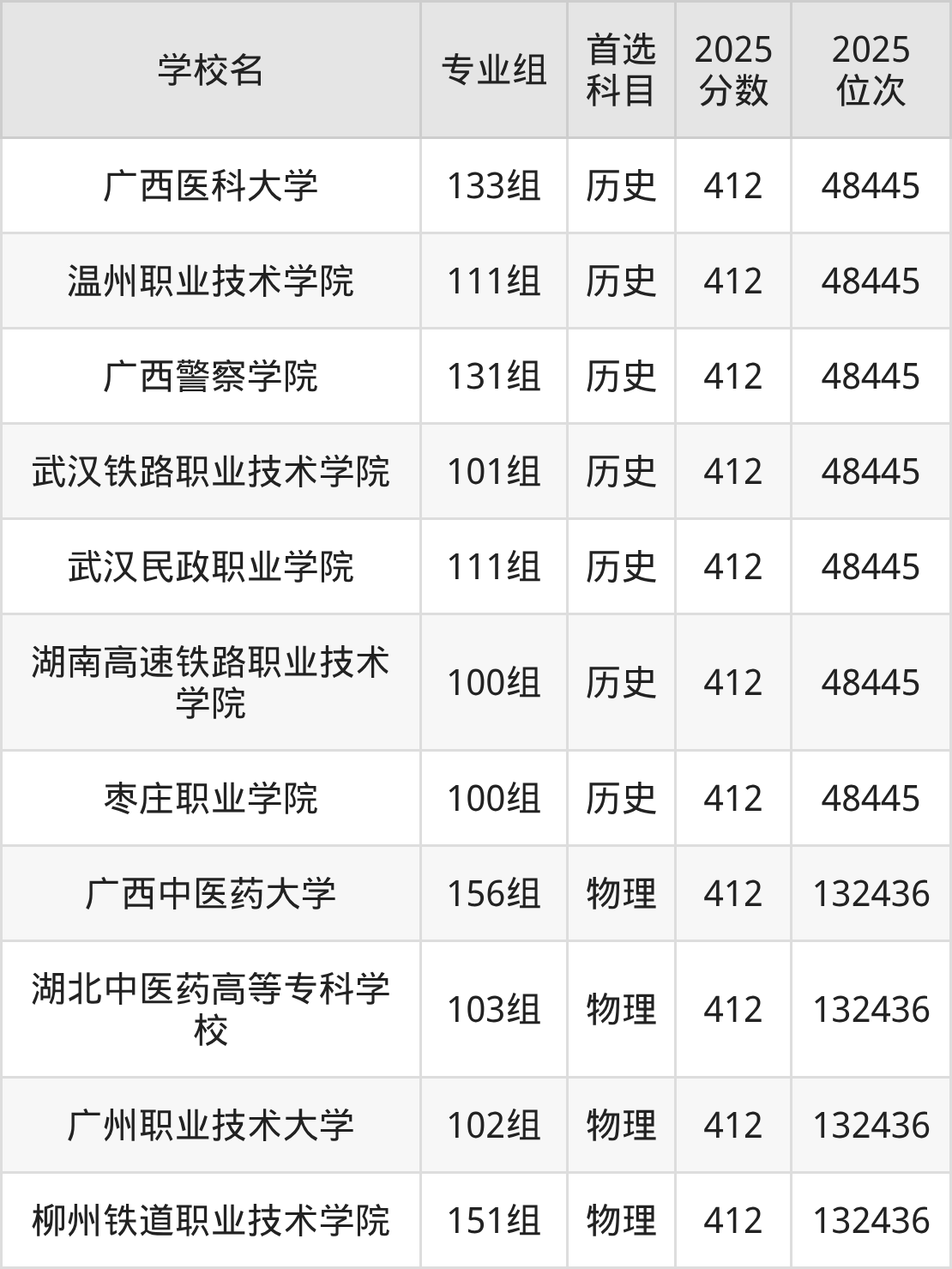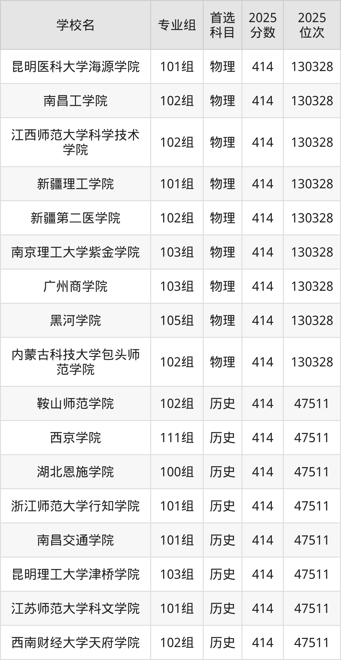 广西高考历史类414分对应的位次排名是47511名,物理类414分对应的位次排名是130328名,因此建议2026年位次排在这附近的同学考虑这些大学。