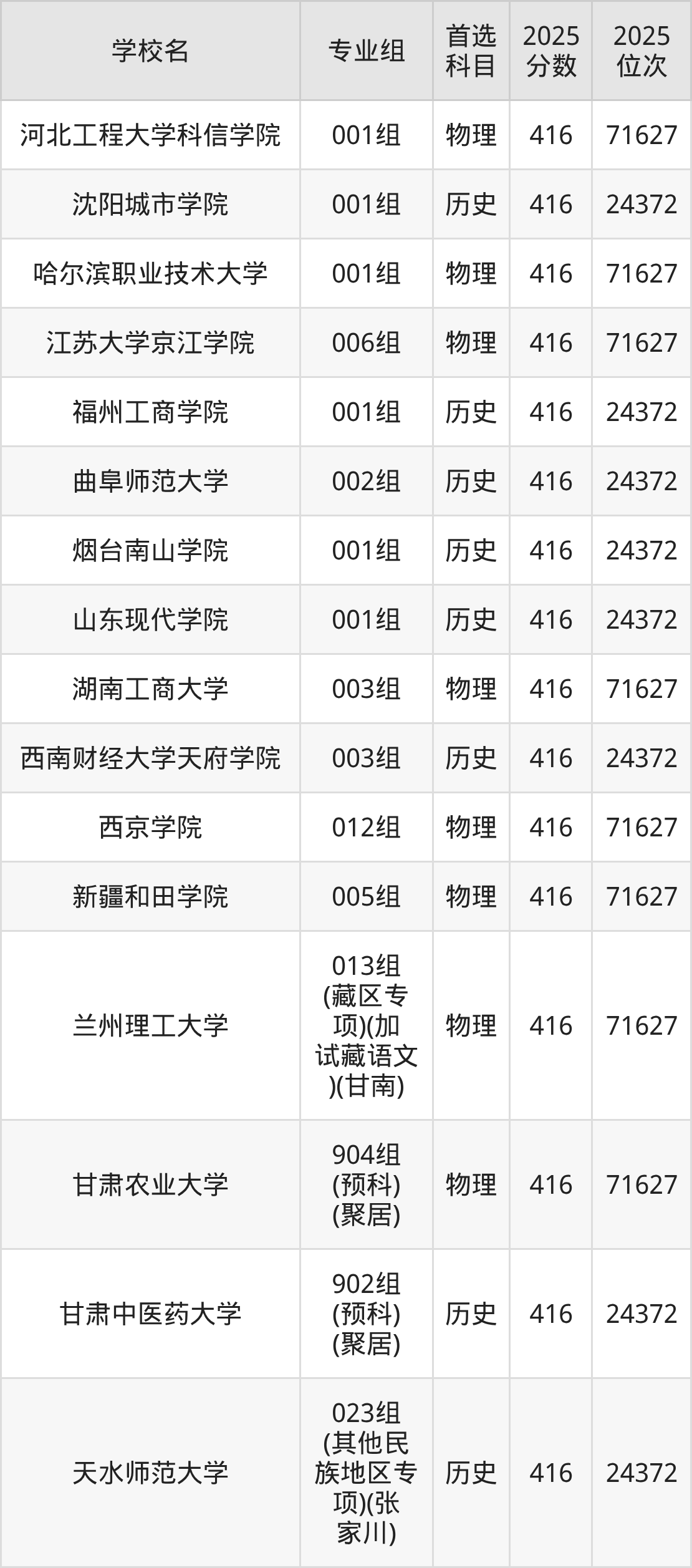 2025年在甘肃高考历史类录取分数线是414分的大学有天津天狮学院、长春大学旅游学院、哈尔滨远东理工学院、上海中侨职业技术大学、上海外国语大学贤达经济人文学院、上海师范大学天华学院、泰山科技学院、丽江文化旅游学院、西安信息职业大学、宁夏理工学院等。物理类录取分数线是414分的大学有渤海大学、沈阳城市学院、温州医科大学仁济学院、山东建筑大学、郑州科技学院、长江大学文理学院、西南财经大学天府学院、西安外事学院、西京学院、兰州交通大学等。