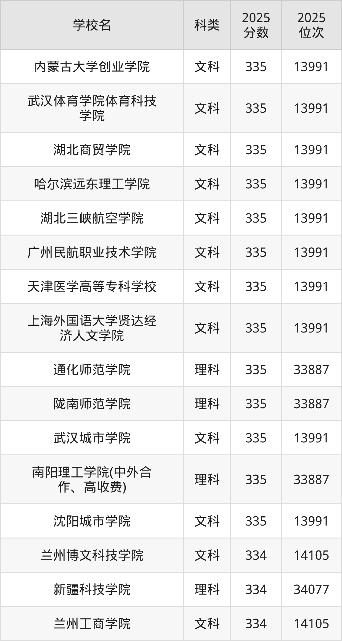 理科333分可以冲的大学:通化师范学院335分、陇南师范学院335分、南阳理工学院(中外合作、高收费)335分、新疆科技学院334分等;较稳妥的大学:新疆工业学院332分、郑州商学院332分。