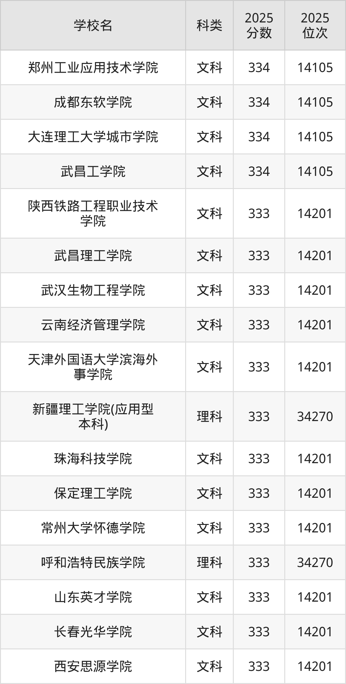 2025年在新疆高考文科录取分数线是333分的大学有陕西铁路工程职业技术学院、武昌理工学院、武汉生物工程学院、云南经济管理学院、天津外国语大学滨海外事学院、珠海科技学院、保定理工学院、常州大学怀德学院、山东英才学院、长春光华学院等。理科录取分数线是333分的大学有新疆理工学院(应用型本科)、呼和浩特民族学院、营口理工学院、湖南科技大学潇湘学院、河北医科大学临床学院。