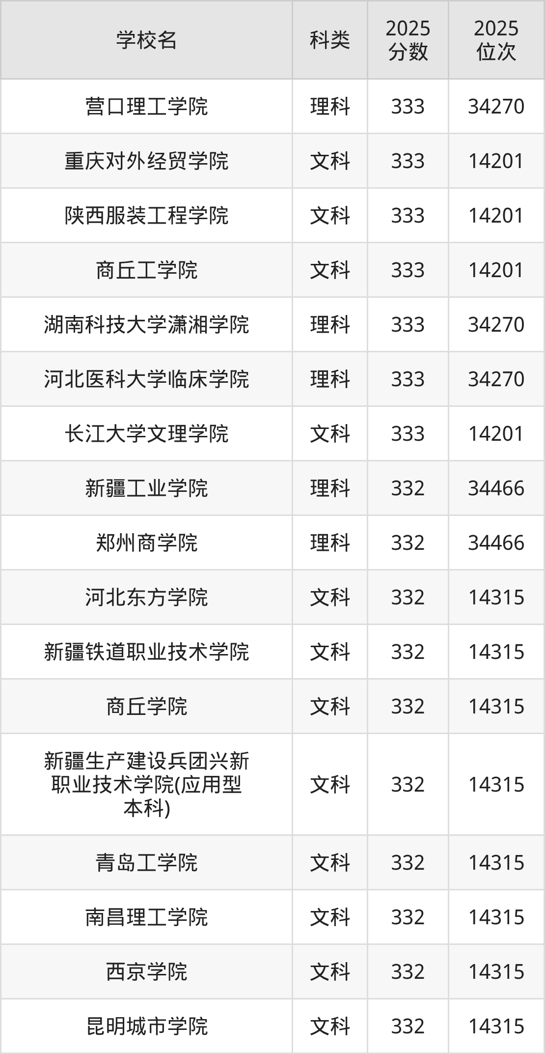 新疆高考理科333分对应的位次排名是34270名,文科333分对应的位次排名是14201名,因此建议2026年位次排在这附近的同学考虑这些大学。