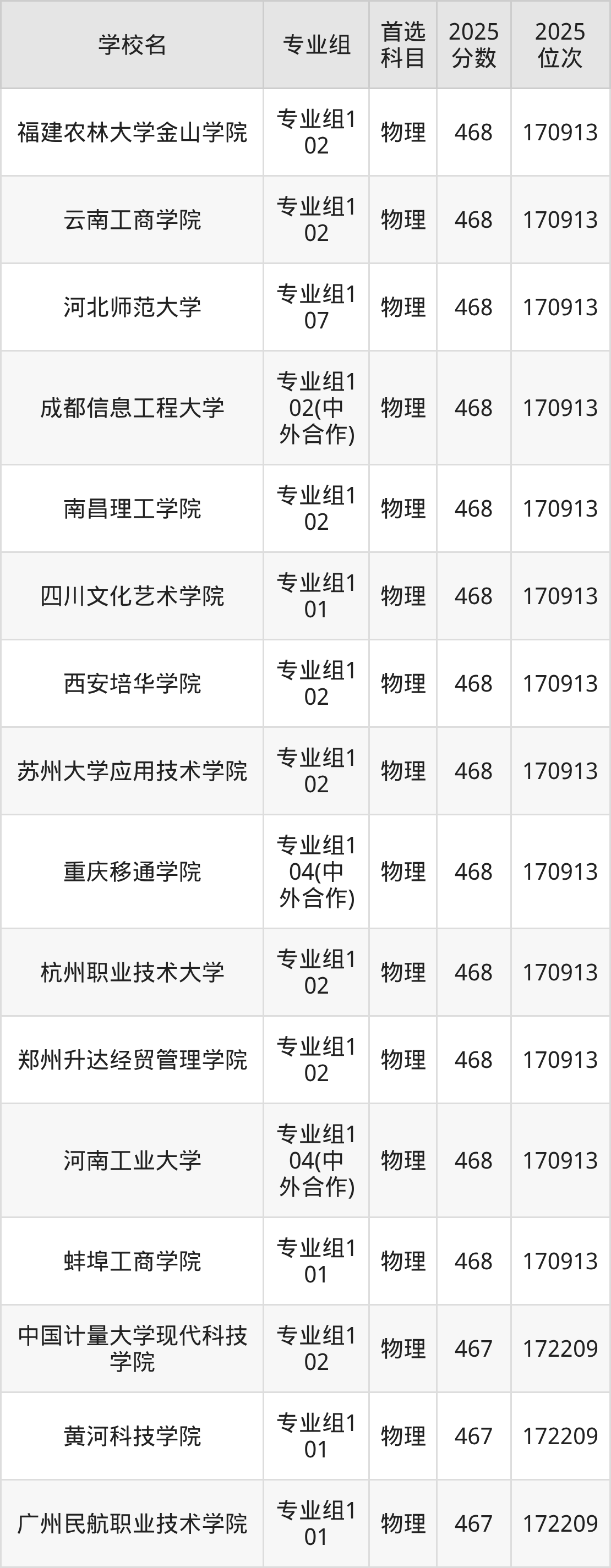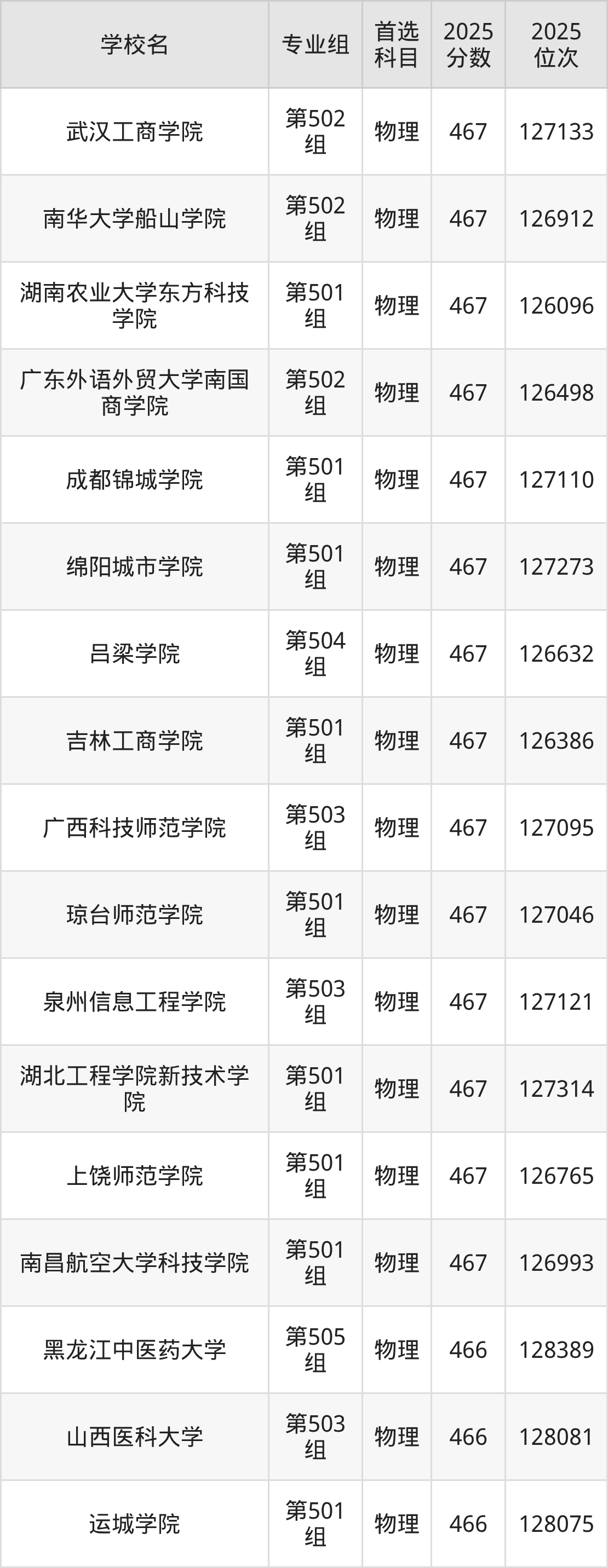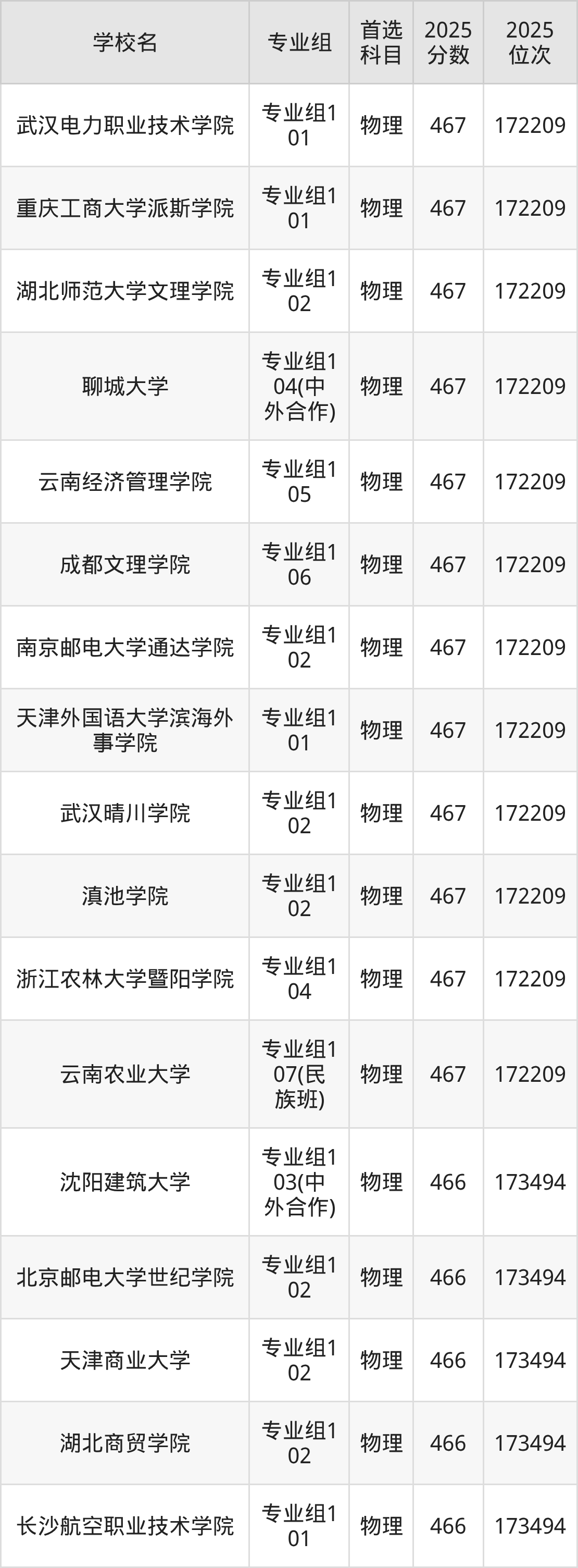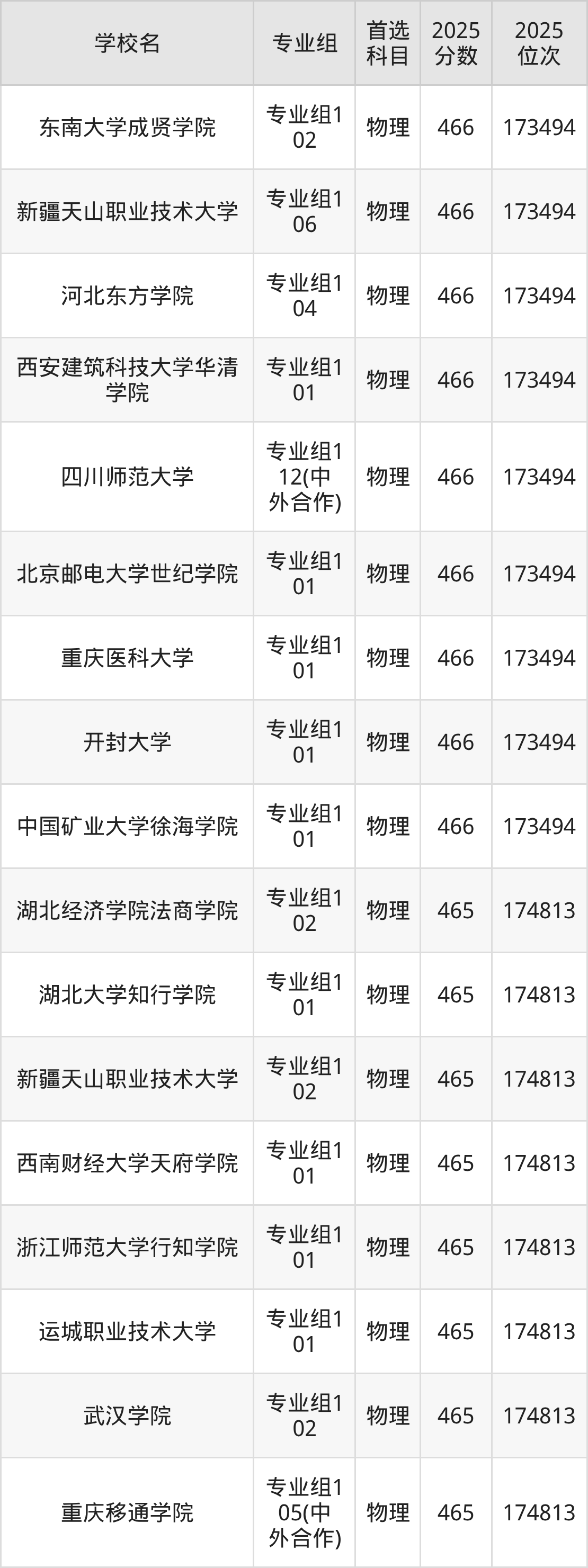 四川物理类466分对应的位次排名是173494名,因此建议2026年位次排在这附近的考生考虑这些大学。
