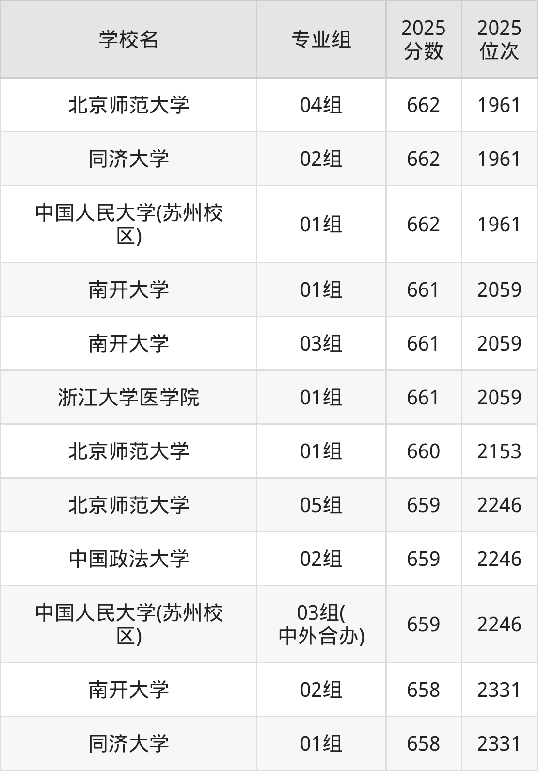 660分可以冲一冲的大学:北京师范大学662分、同济大学662分、中国人民大学(苏州校区)662分、南开大学661分等;