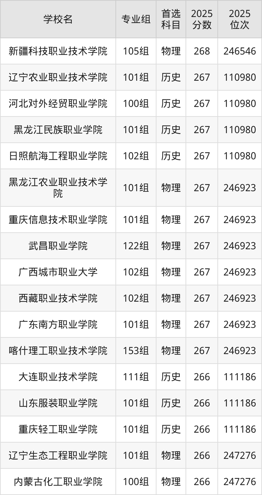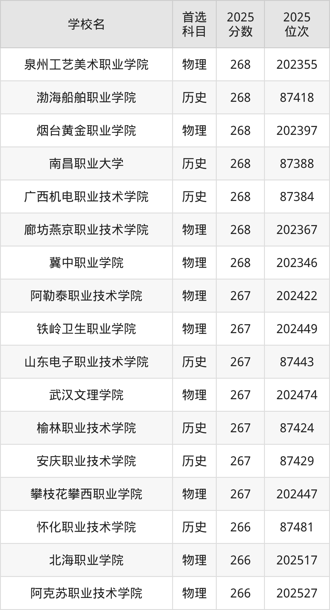 2025年在广西高考历史类录取分数线是268分的大学有武汉光谷职业学院。物理类录取分数线是268分的大学有广西科技职业学院、新疆科技职业技术学院。