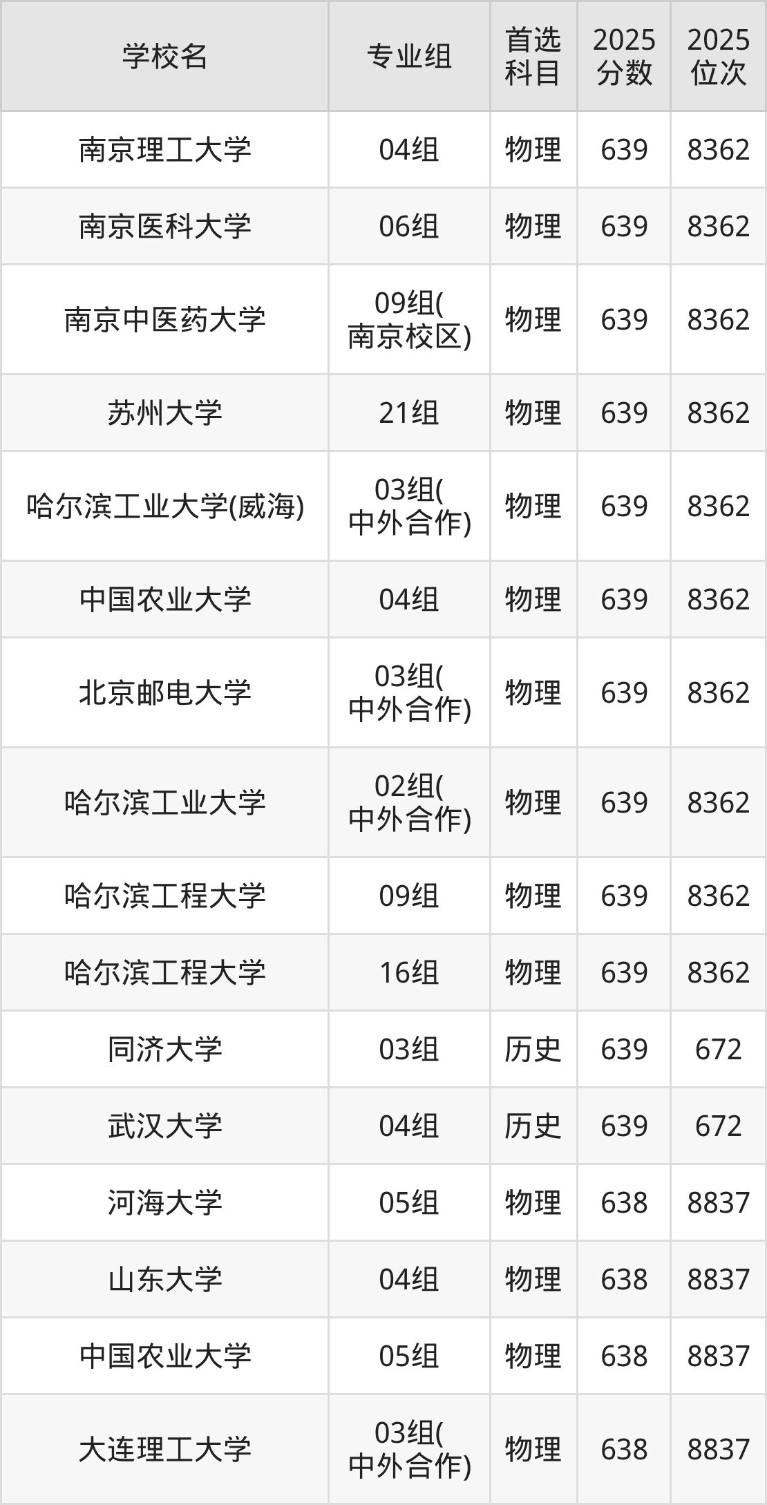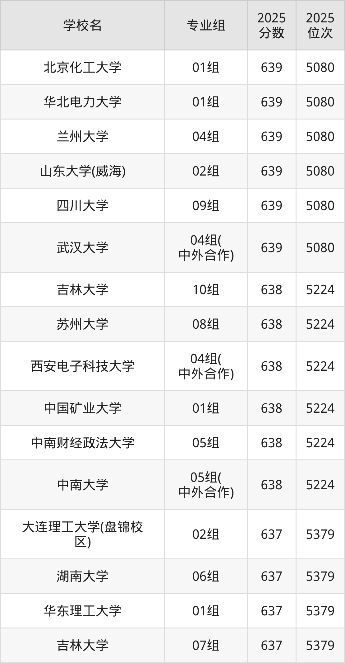 637分可以冲一冲的大学:北京化工大学639分、华北电力大学639分、兰州大学639分、山东大学(威海)639分等;