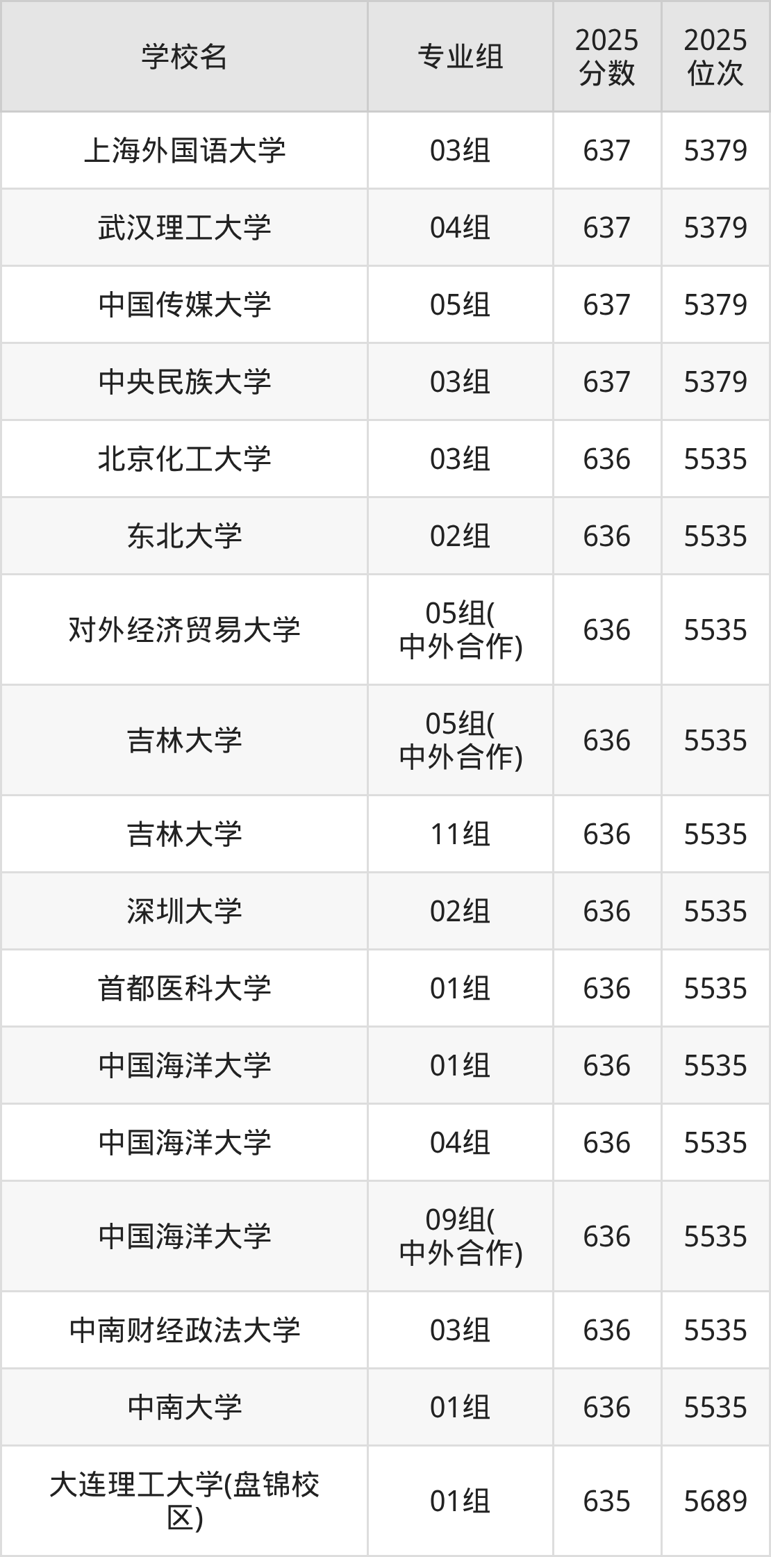 2025年在天津高考录取分数线是637分的大学一共有8所,分别是大连理工大学(盘锦校区)、湖南大学、华东理工大学、吉林大学、上海外国语大学、武汉理工大学、中国传媒大学、中央民族大学。