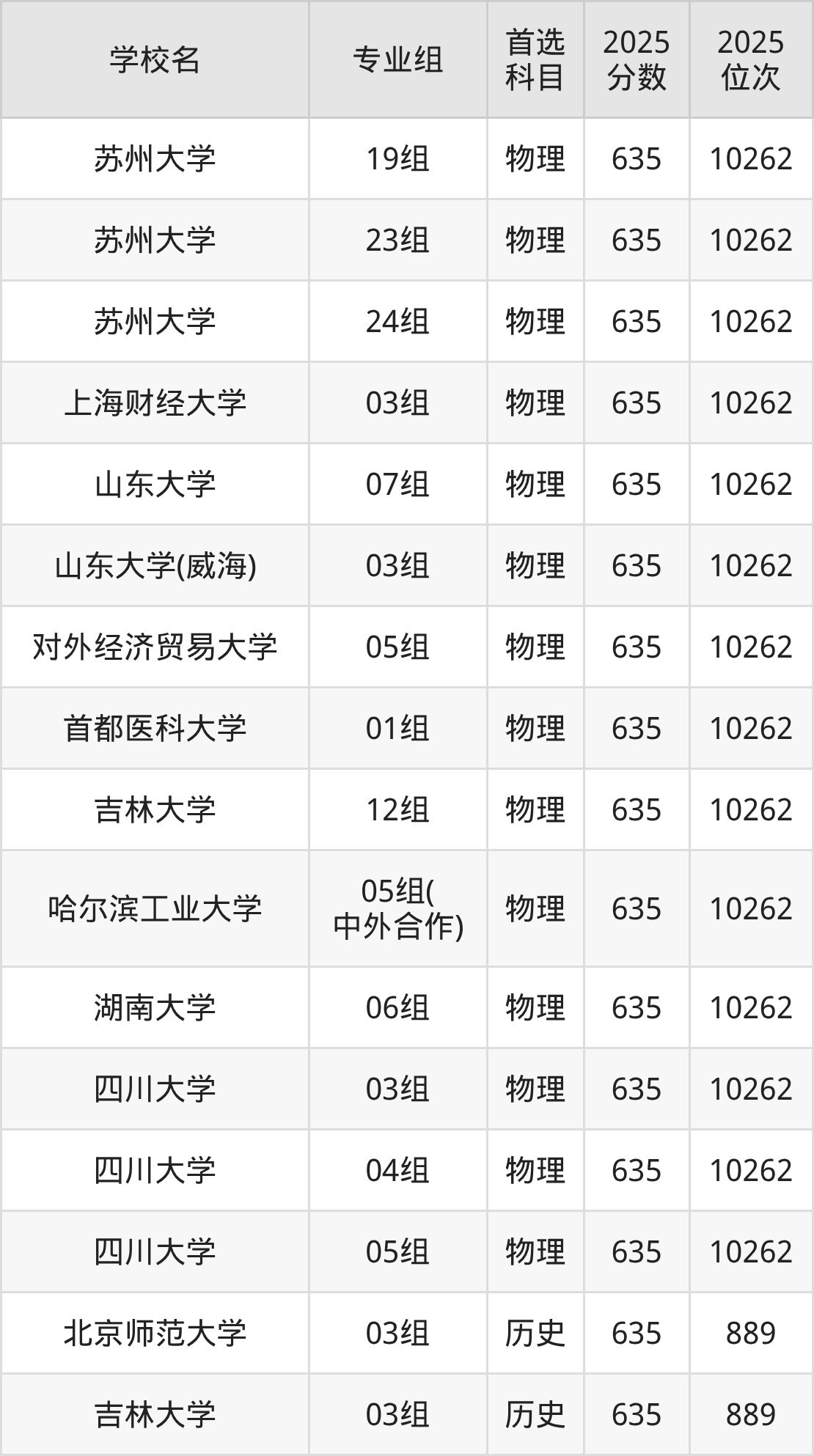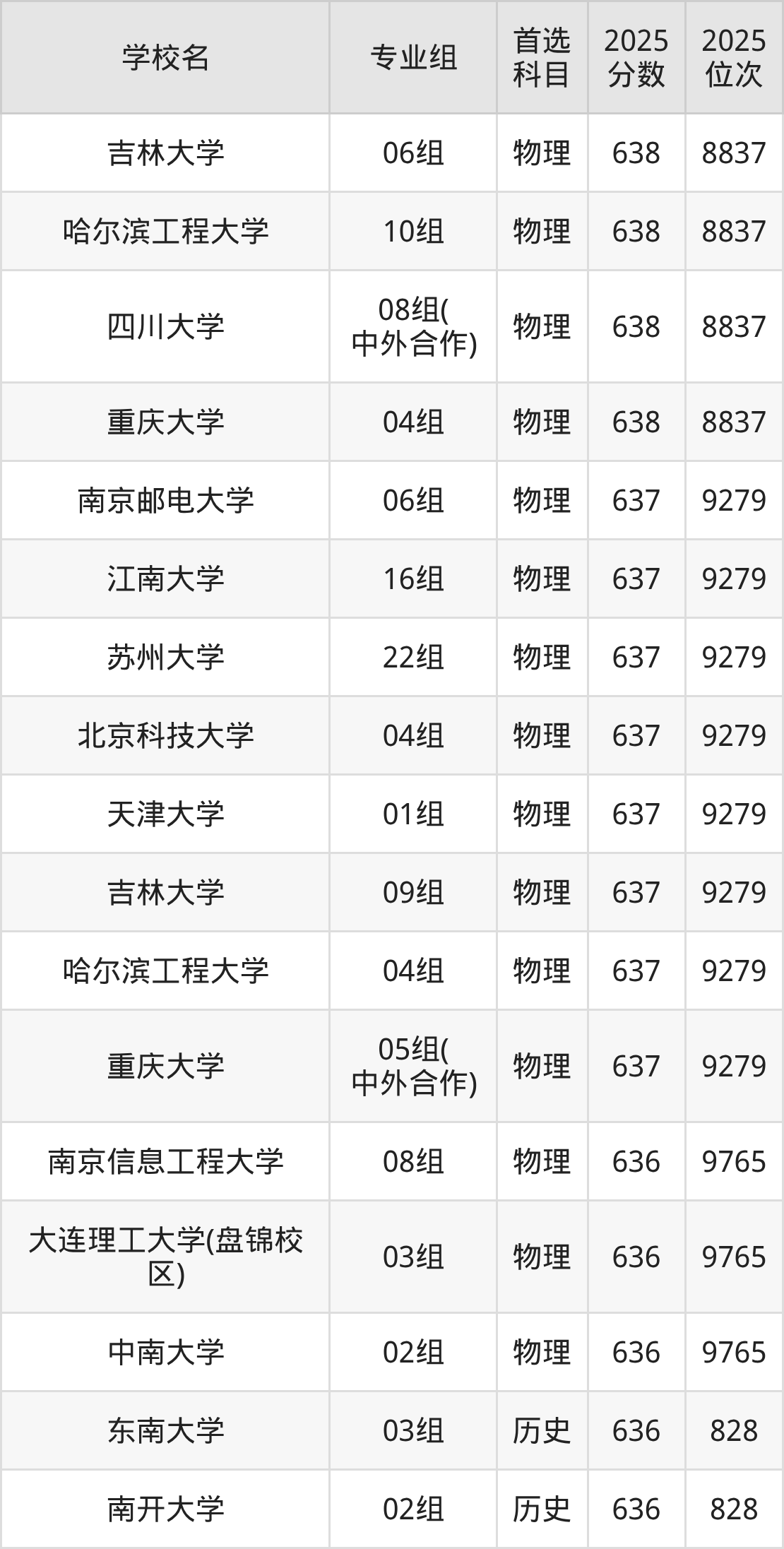 历史类637分可以冲的大学:同济大学639分、武汉大学639分;较稳妥的大学:东南大学636分、南开大学636分、北京师范大学635分、吉林大学635分等。