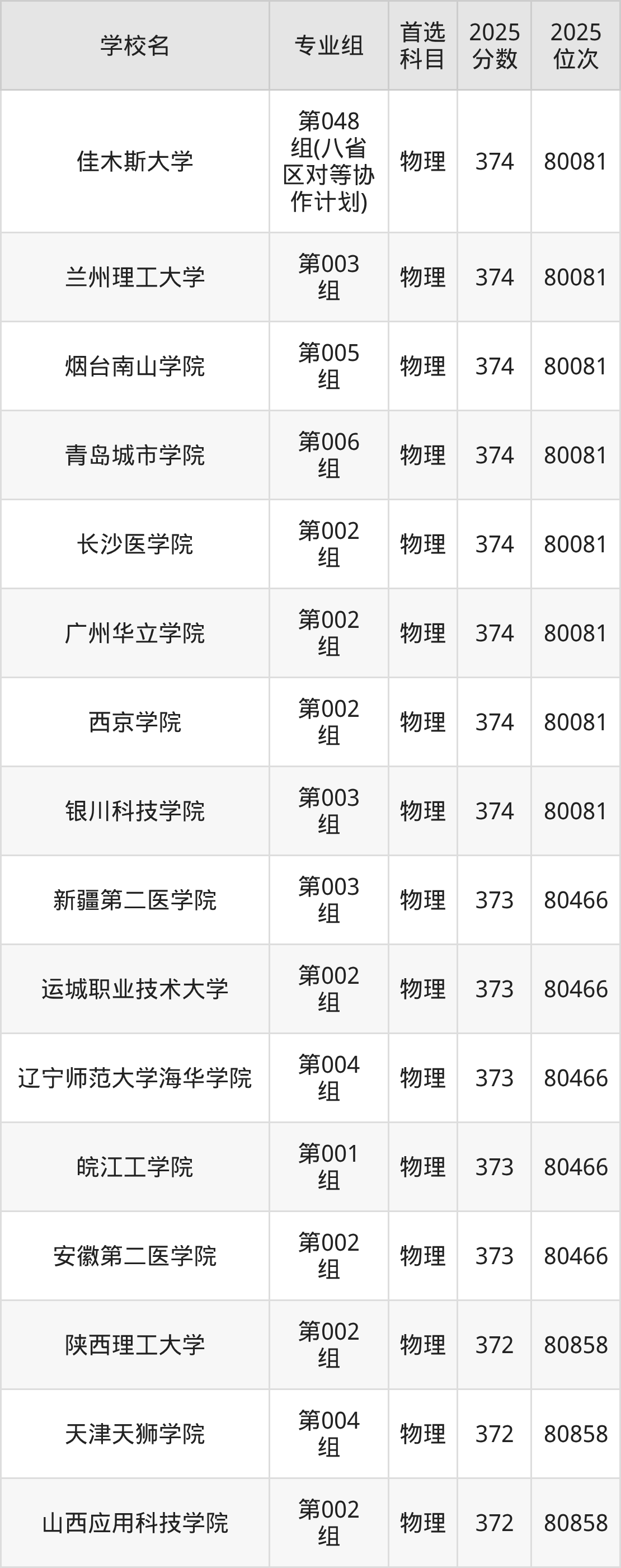 372分可以冲一冲的大学:佳木斯大学374分、兰州理工大学374分、烟台南山学院374分、青岛城市学院374分等;