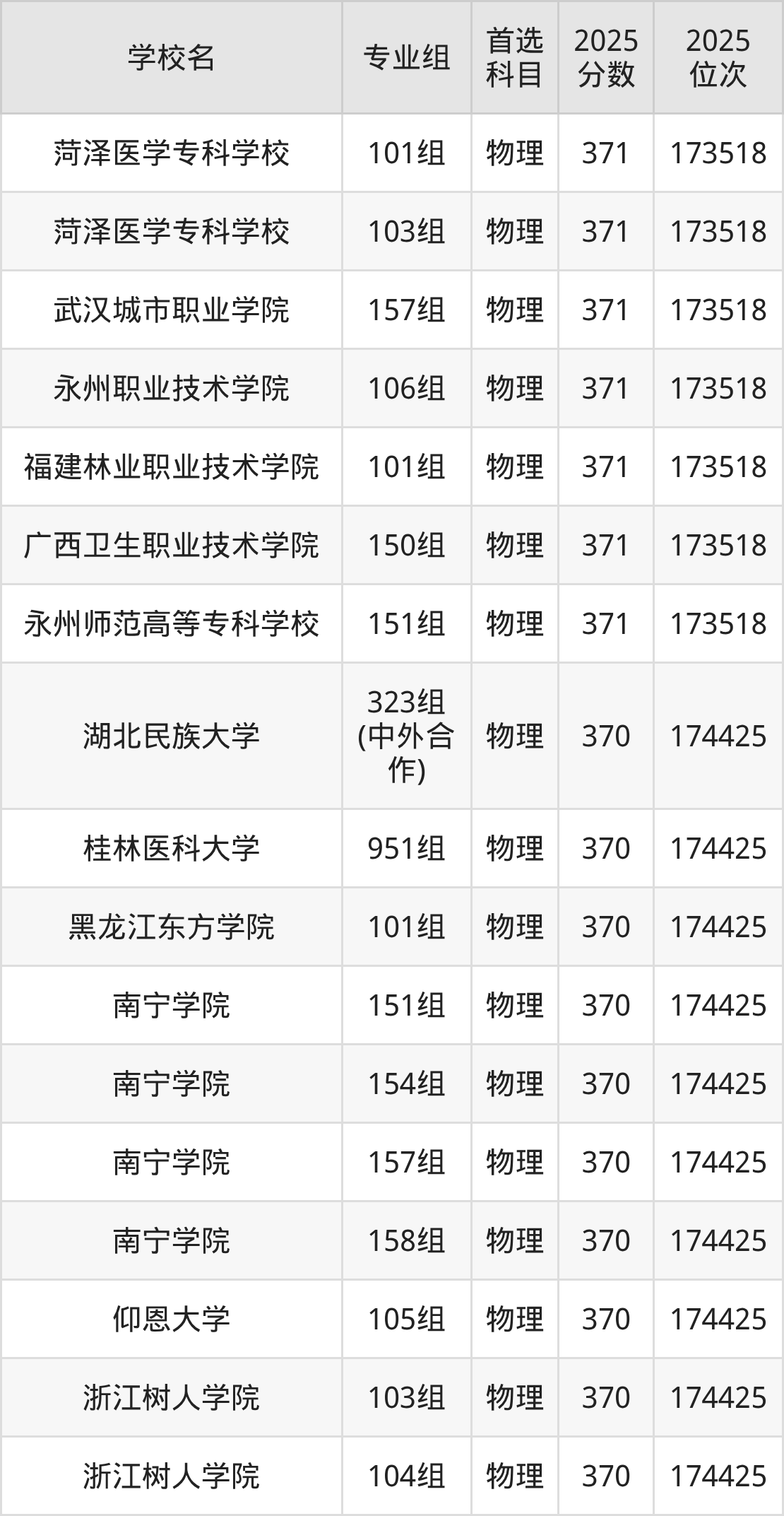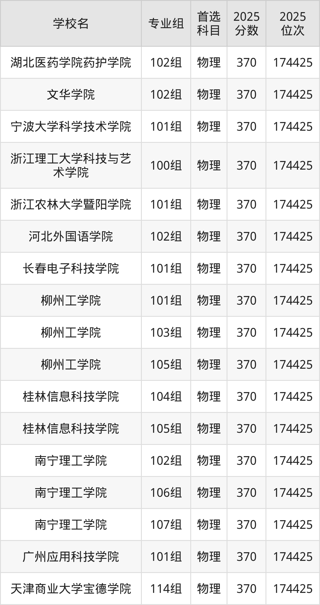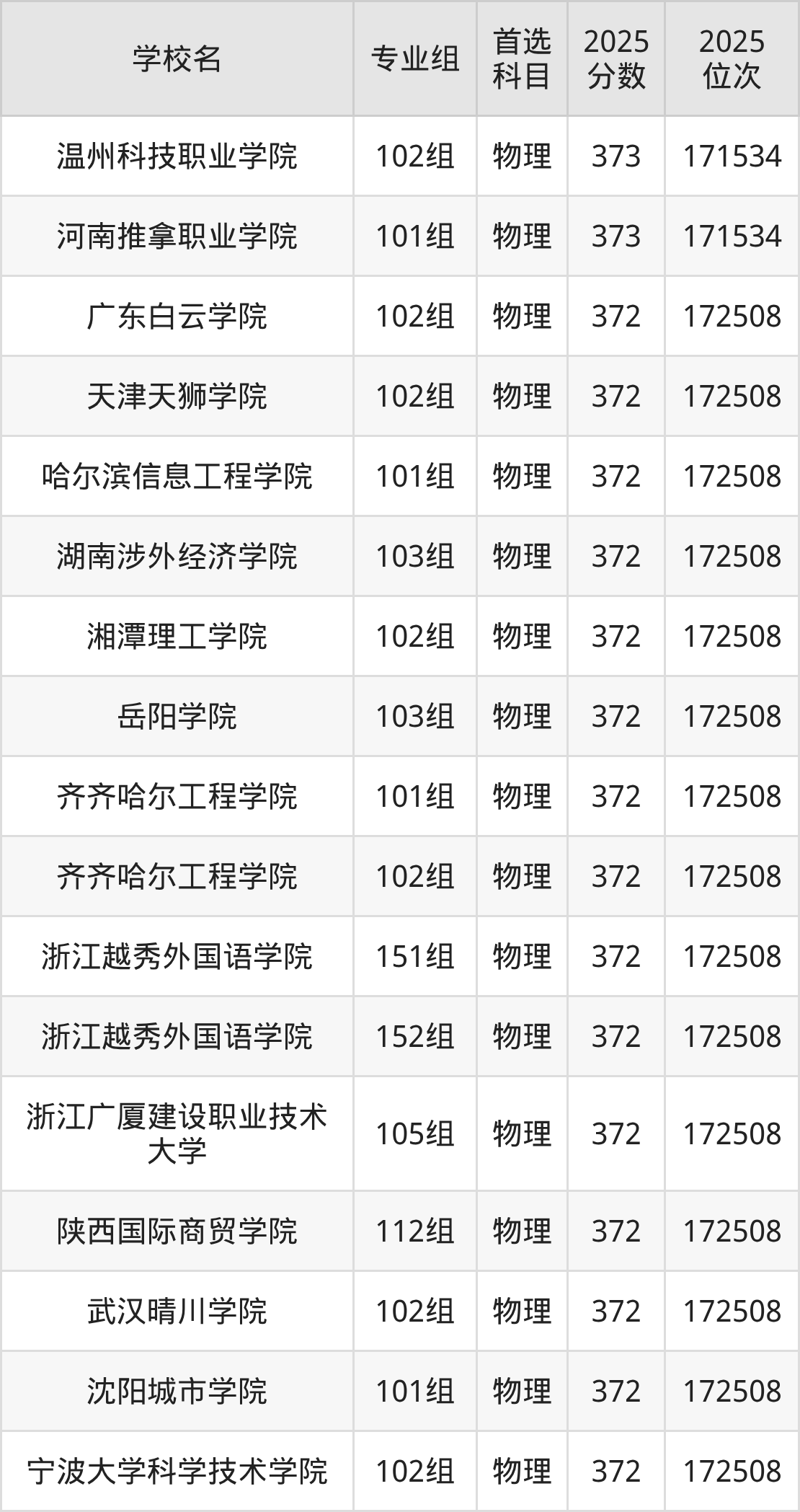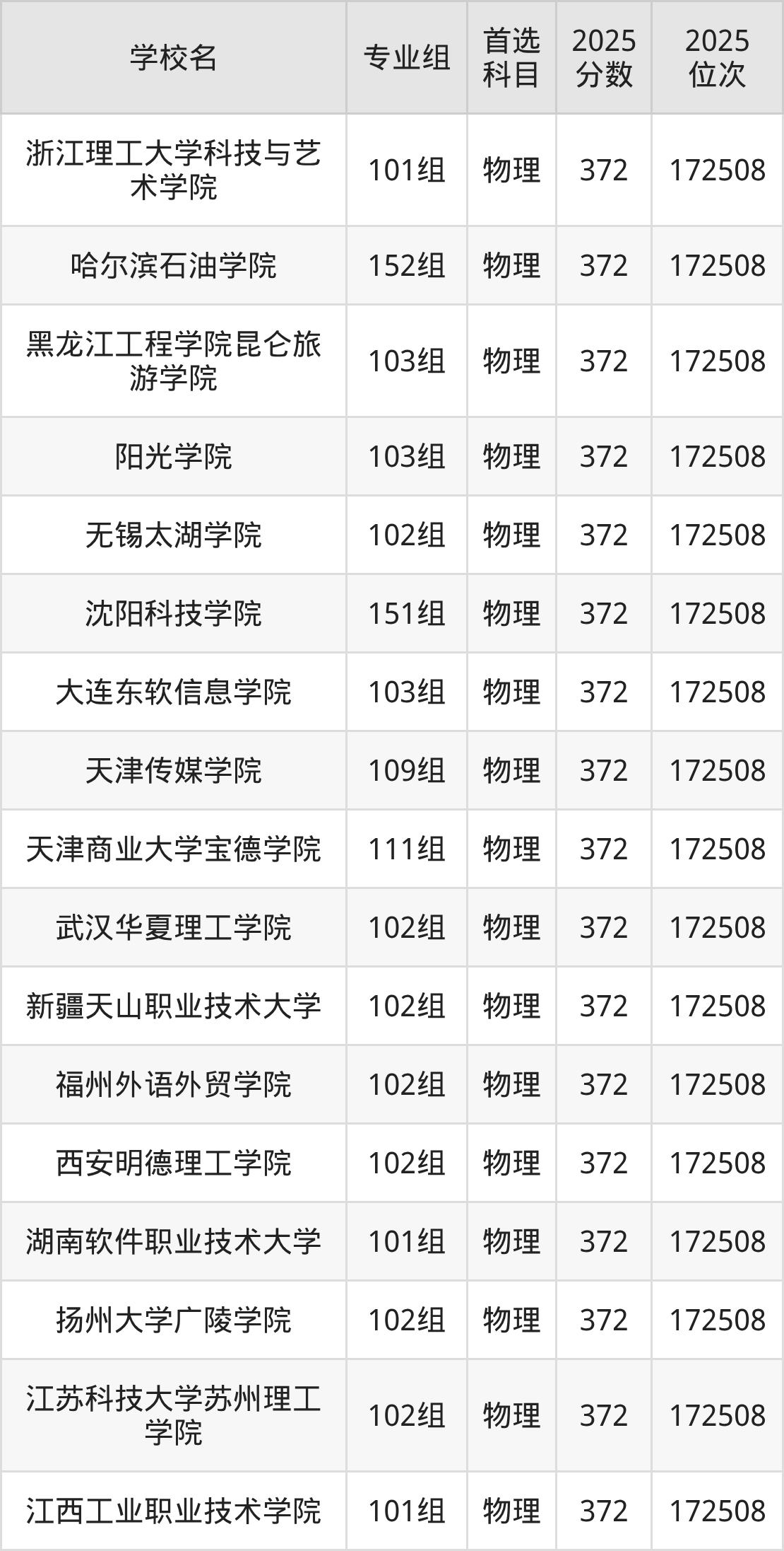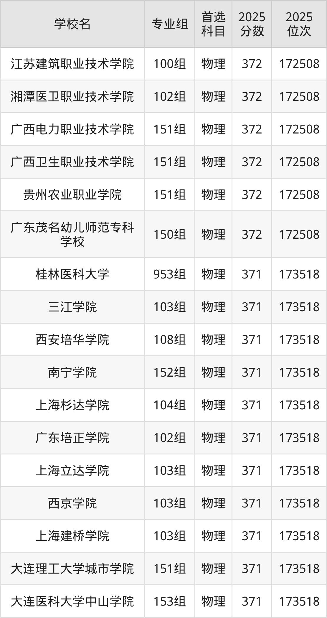 广西物理类372分对应的位次排名是172508名,因此建议2026年位次排在这附近的考生考虑这些大学。