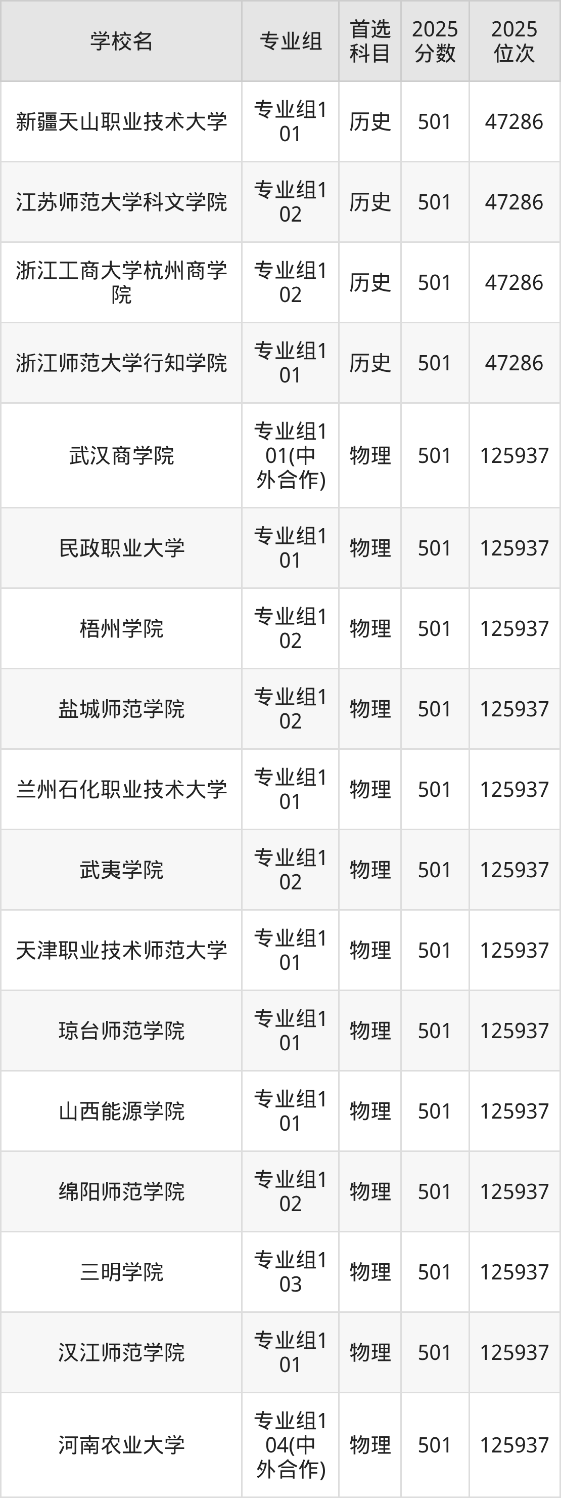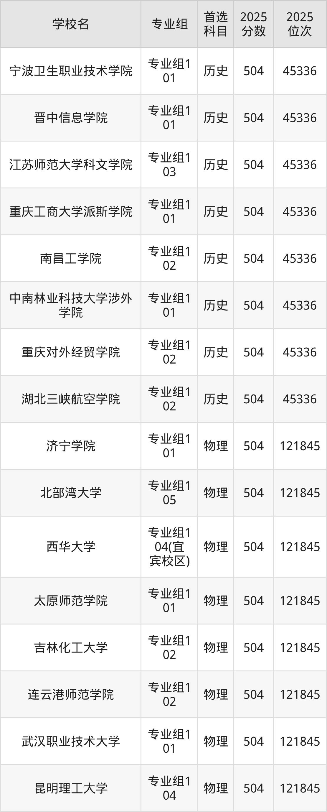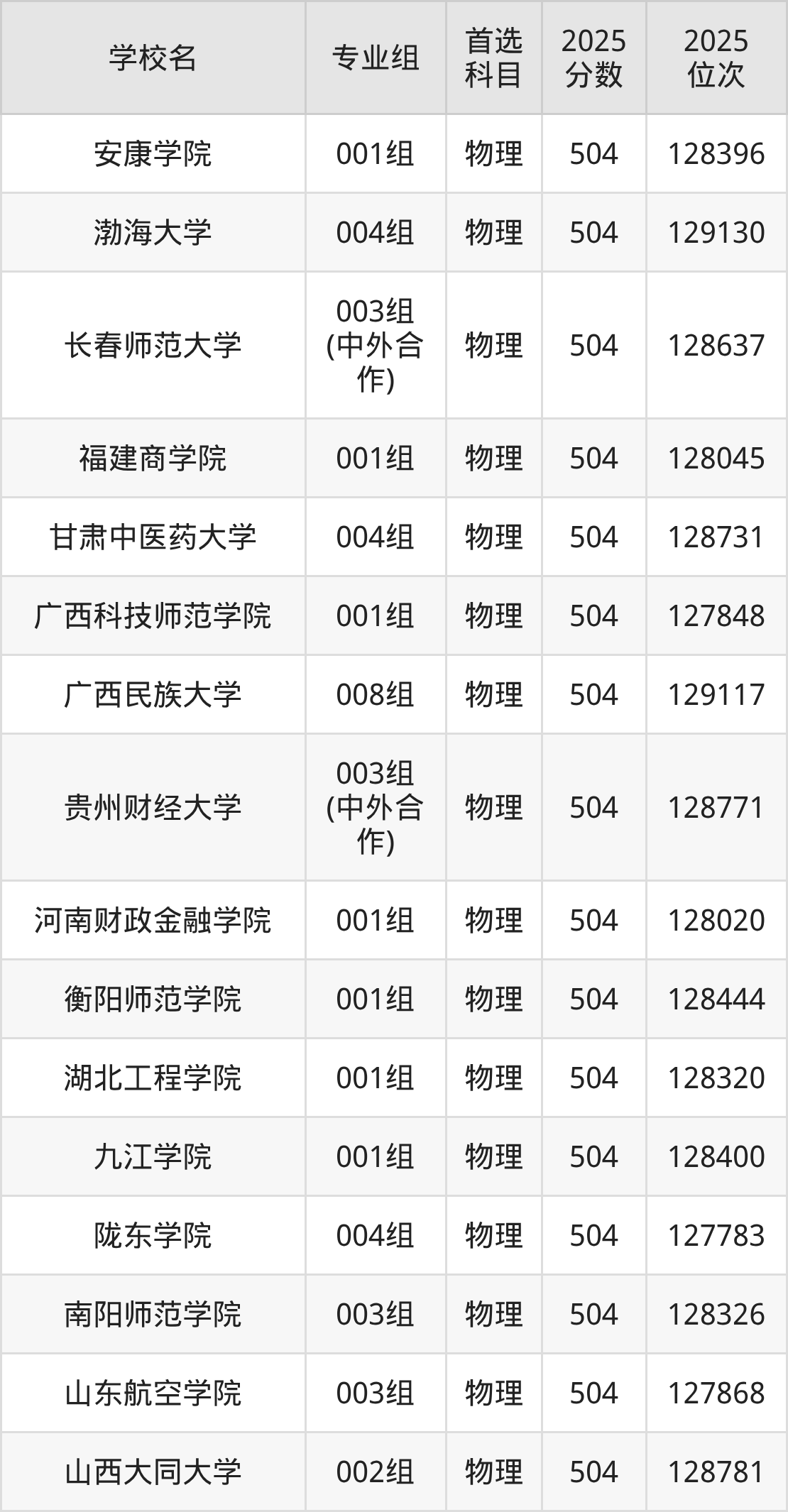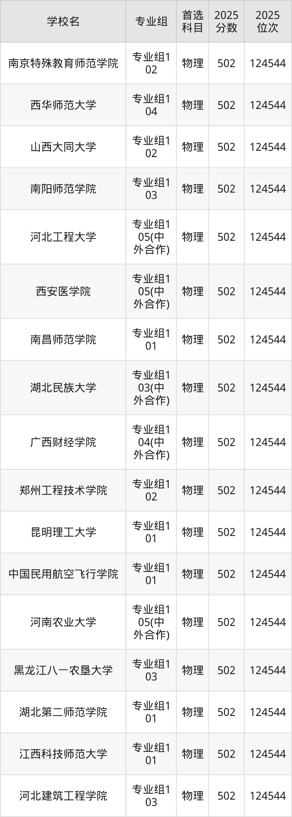 物理类502分可以冲的大学:济宁学院504分、北部湾大学504分、西华大学504分、太原师范学院504分等;较稳妥的大学:武汉商学院501分、民政职业大学501分、梧州学院501分、盐城师范学院501分等。