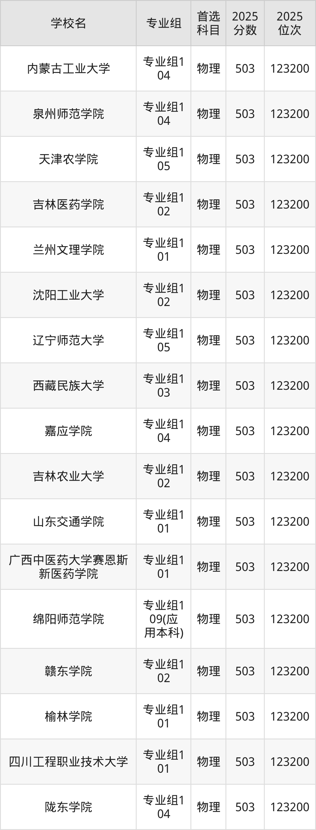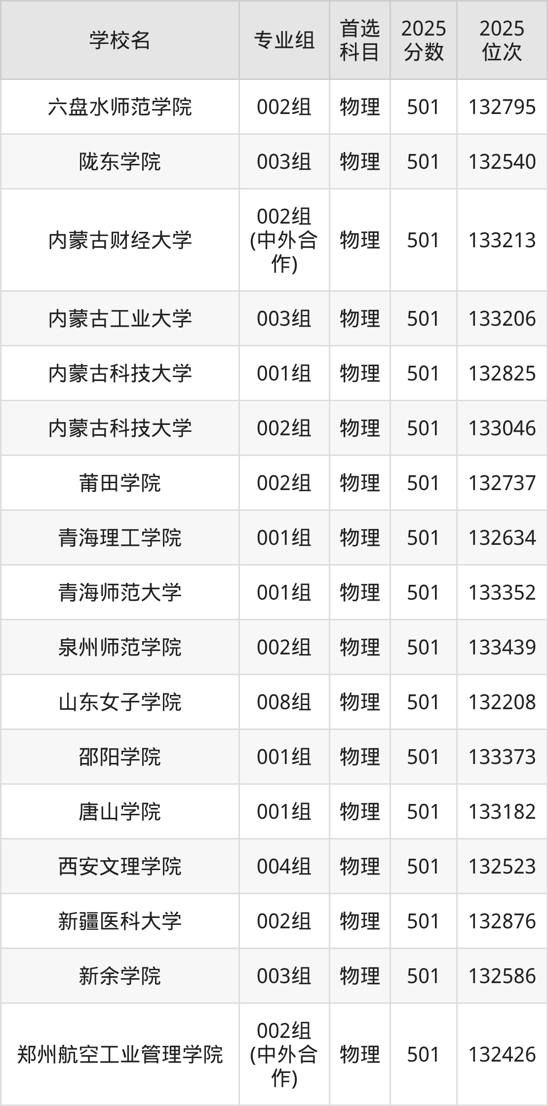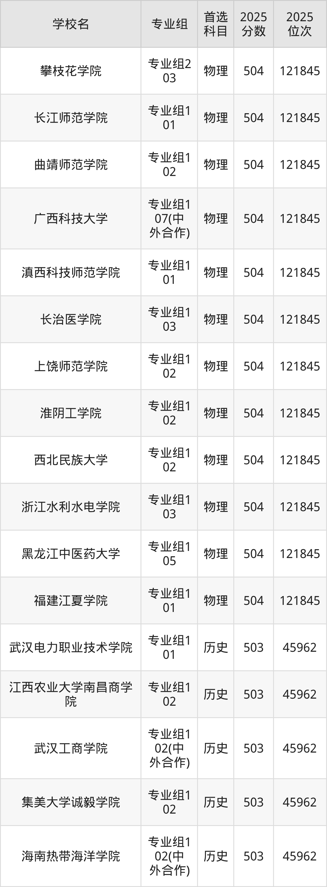 物理类502分可以冲的大学:济宁学院504分、北部湾大学504分、西华大学504分、太原师范学院504分等;较稳妥的大学:武汉商学院501分、民政职业大学501分、梧州学院501分、盐城师范学院501分等。