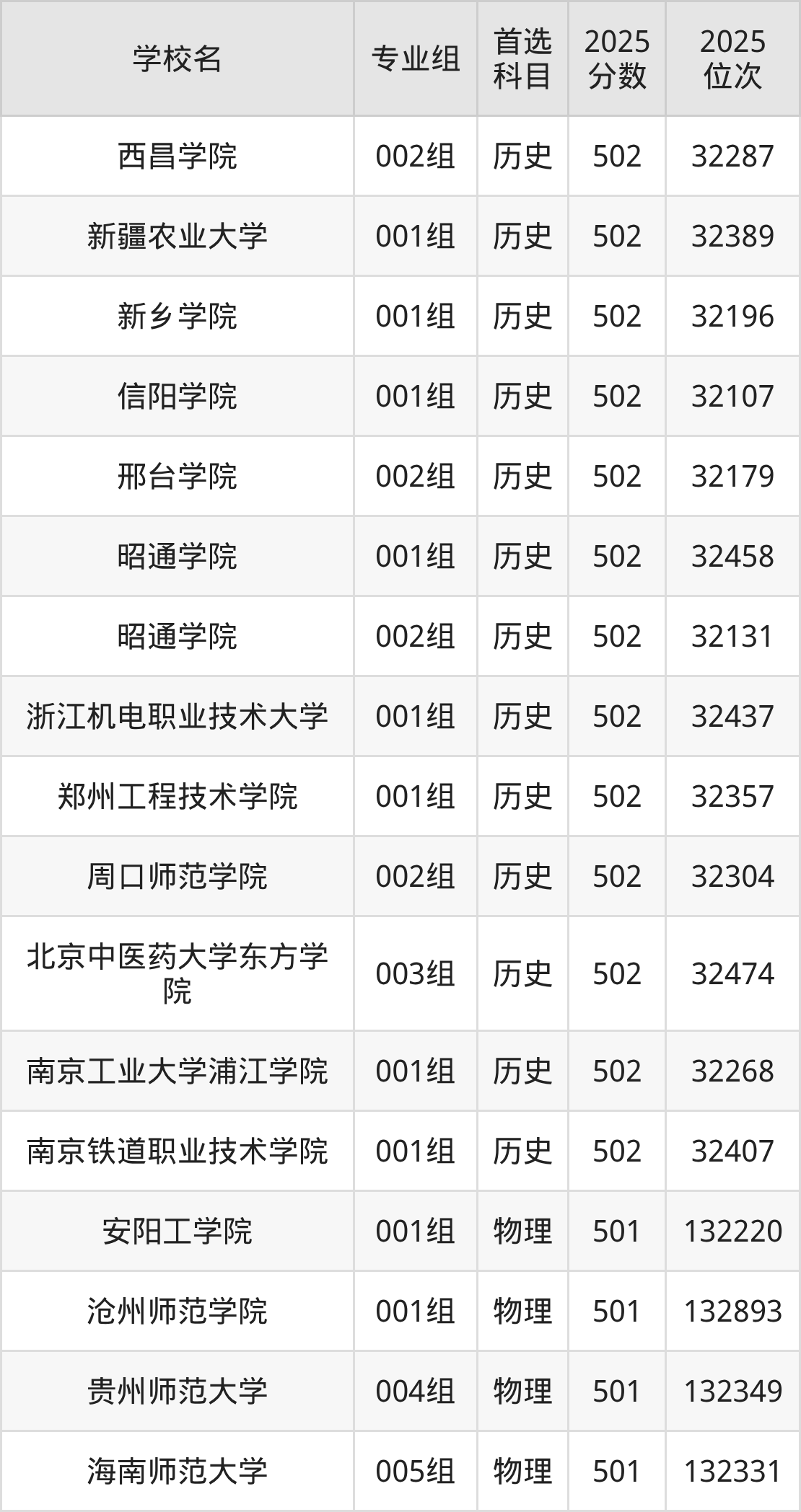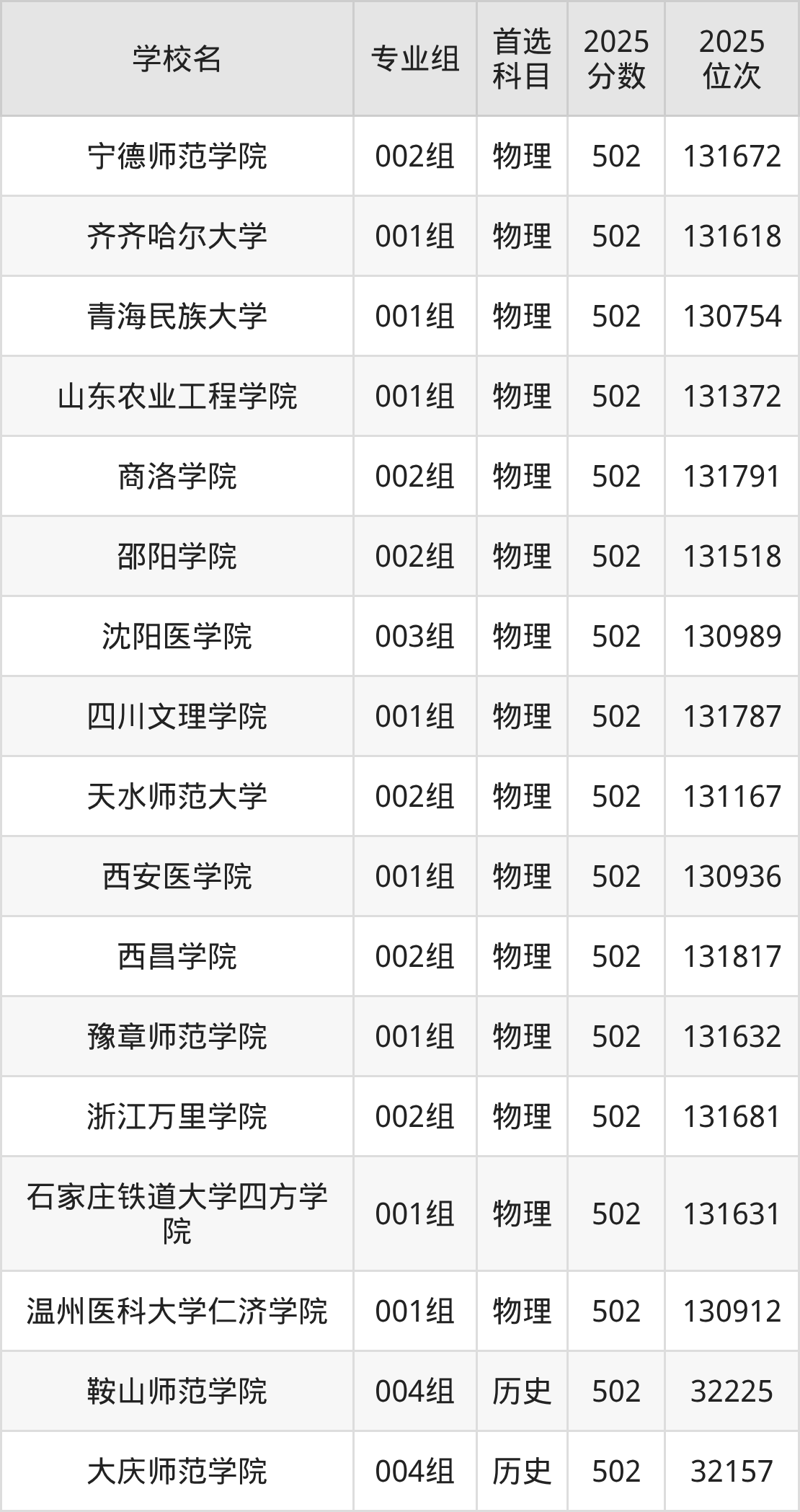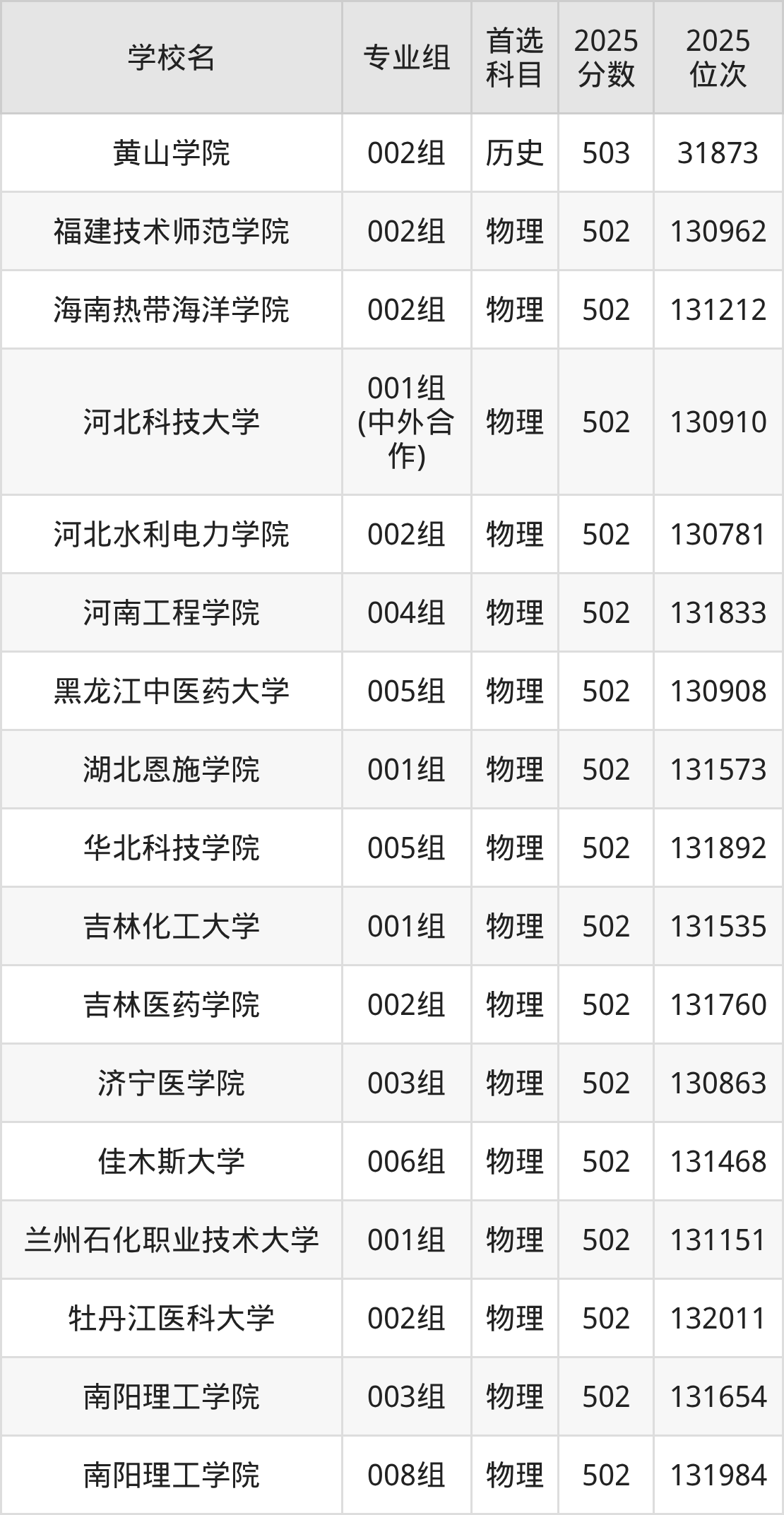 安徽高考物理类502分对应的位次排名是130754名-132011名,历史类502分对应的位次排名是32053名-32518名,因此建议2026年位次排在这附近的同学考虑这些大学。