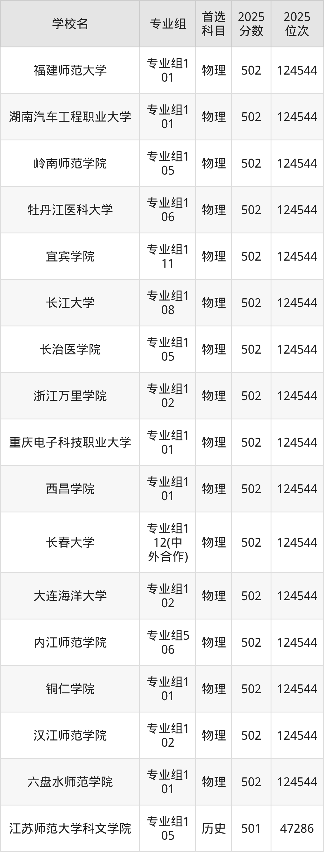四川高考历史类502分对应的位次排名是46606名,物理类502分对应的位次排名是124544名,因此建议2026年位次排在这附近的同学考虑这些大学。