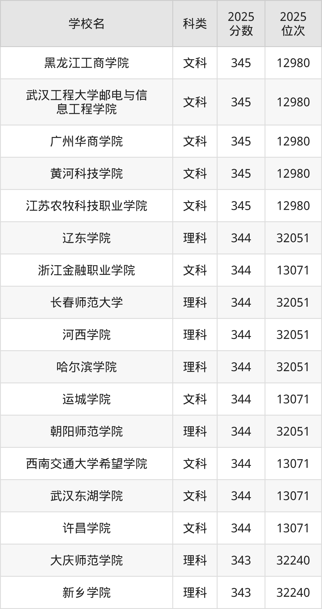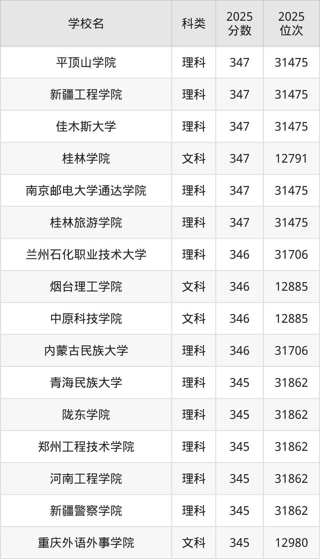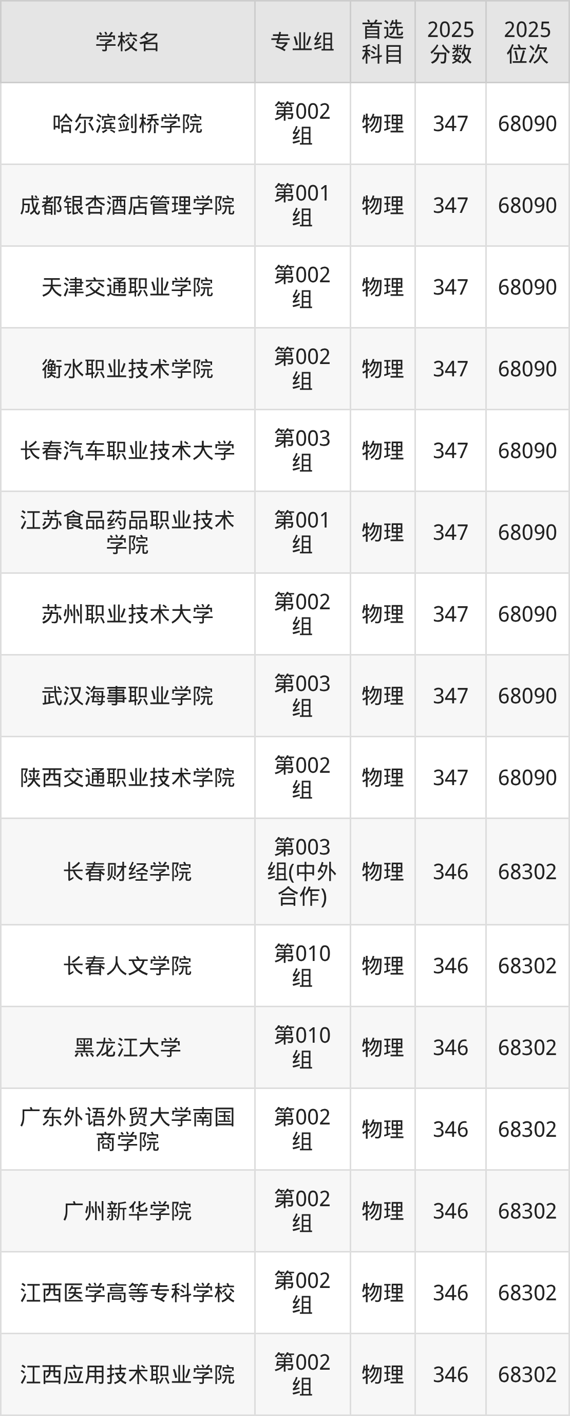 345分可以冲一冲的大学:哈尔滨剑桥学院347分、成都银杏酒店管理学院347分、天津交通职业学院347分、衡水职业技术学院347分等;