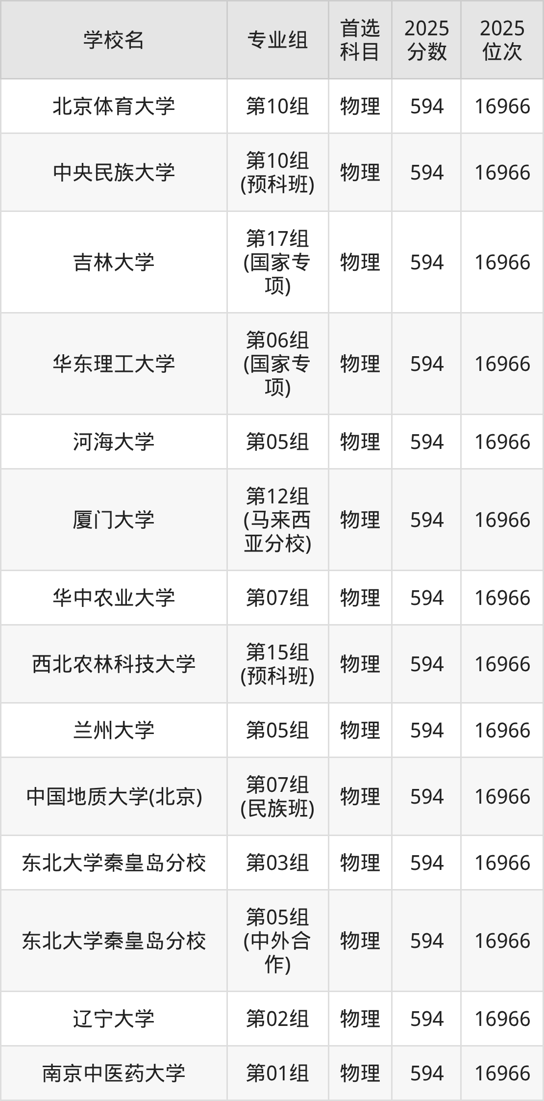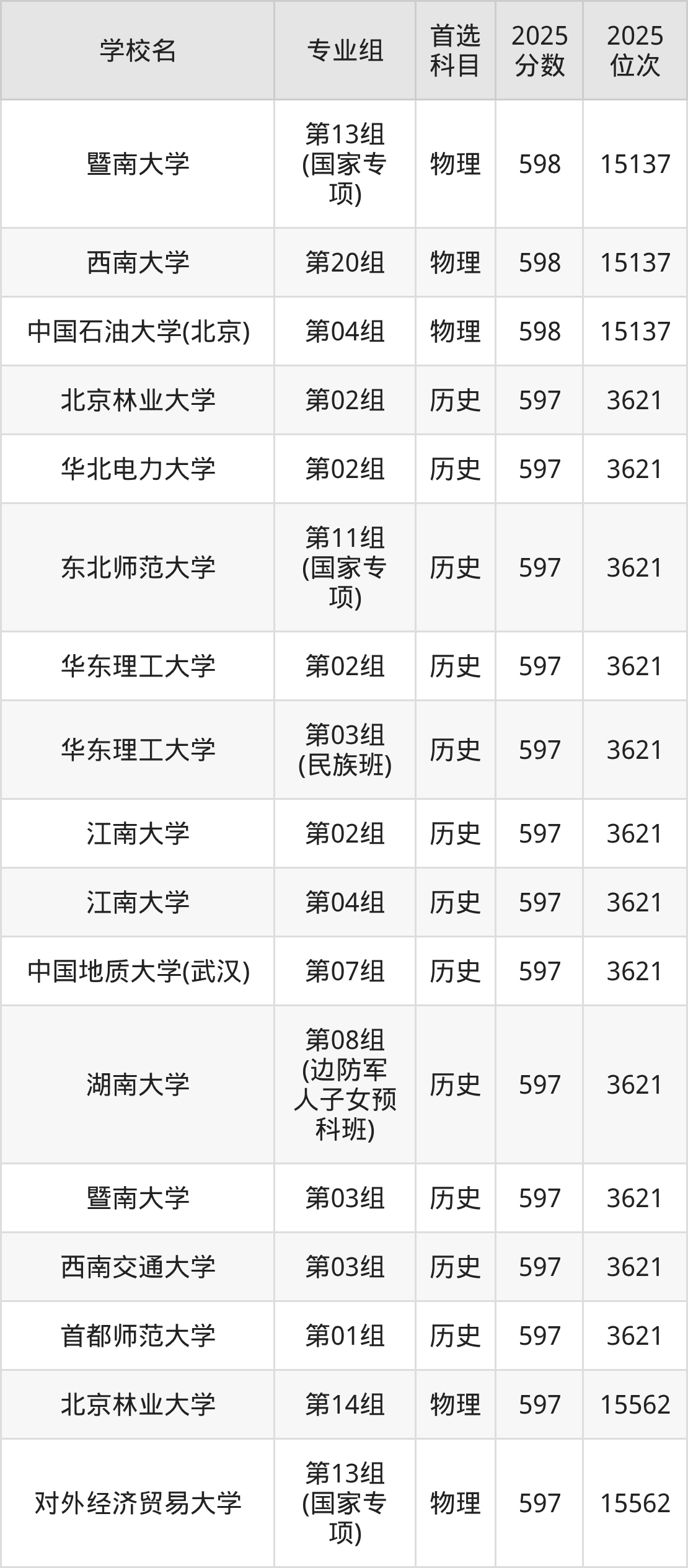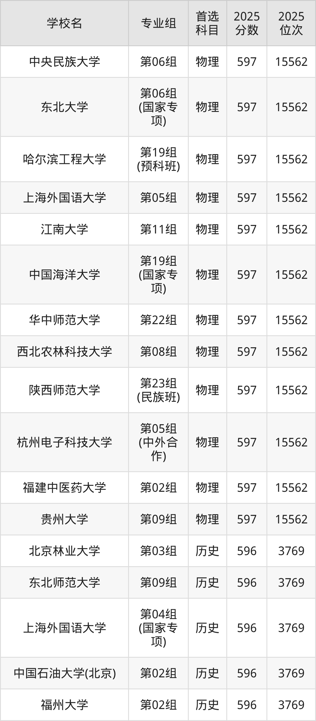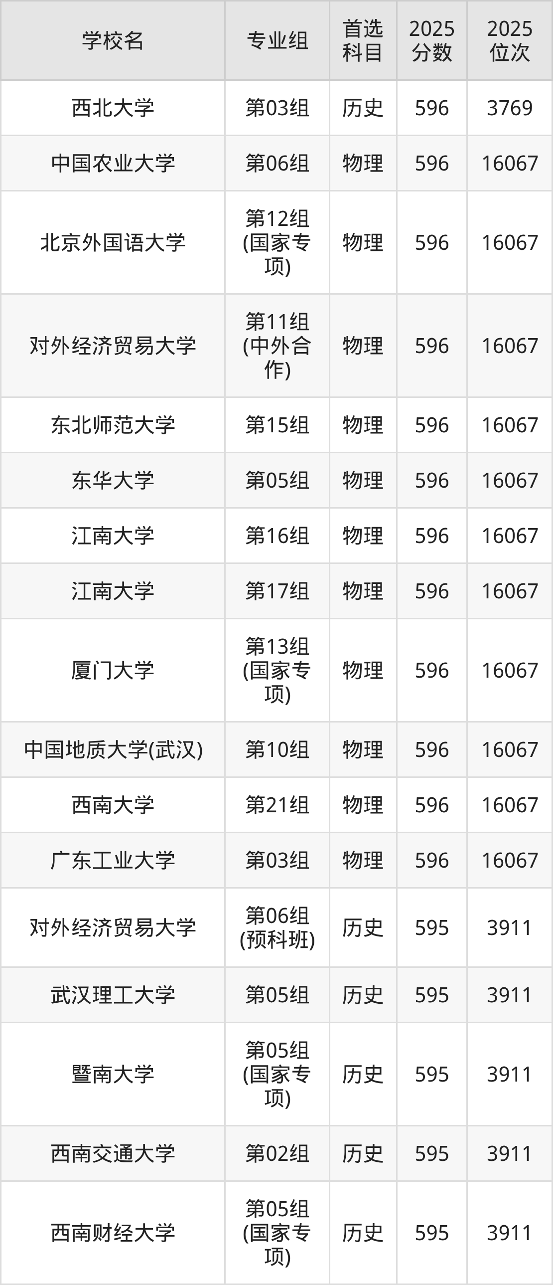 2025年在湖北高考历史类录取分数线是596分的大学有北京林业大学、东北师范大学、上海外国语大学、中国石油大学(北京)、福州大学、西北大学。物理类录取分数线是596分的大学有中国农业大学、北京外国语大学、对外经济贸易大学、东北师范大学、东华大学、江南大学、厦门大学、中国地质大学(武汉)、西南大学、广东工业大学。