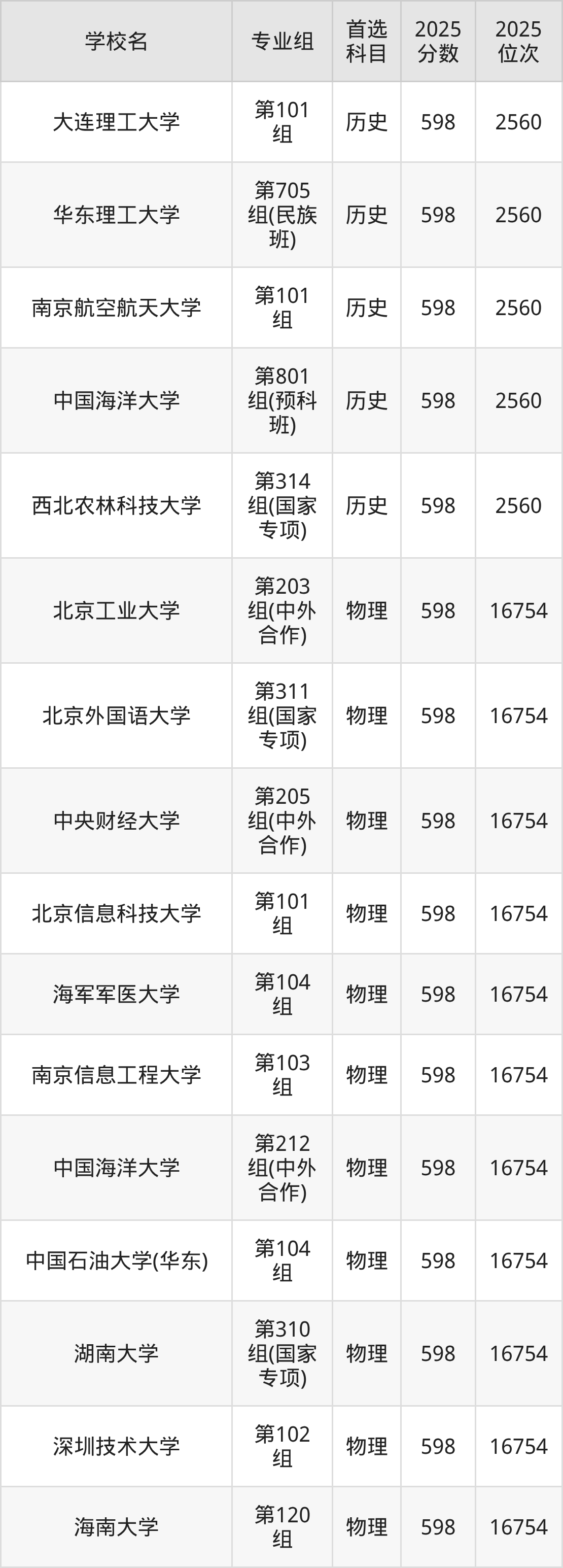 历史类596分可以冲的大学:大连理工大学598分、华东理工大学598分、南京航空航天大学598分、中国海洋大学598分等;较稳妥的大学:中国农业大学595分、北京林业大学595分、北京中医药大学595分、对外经济贸易大学595分等。