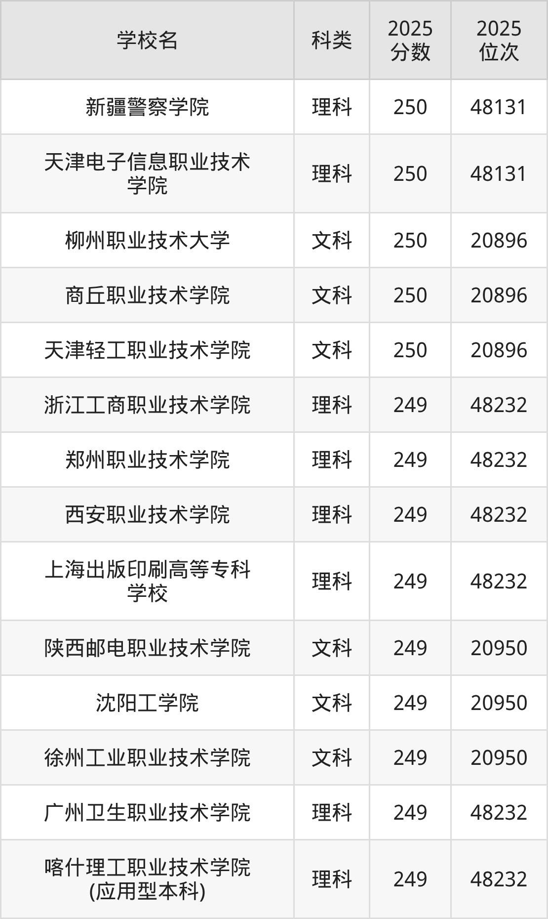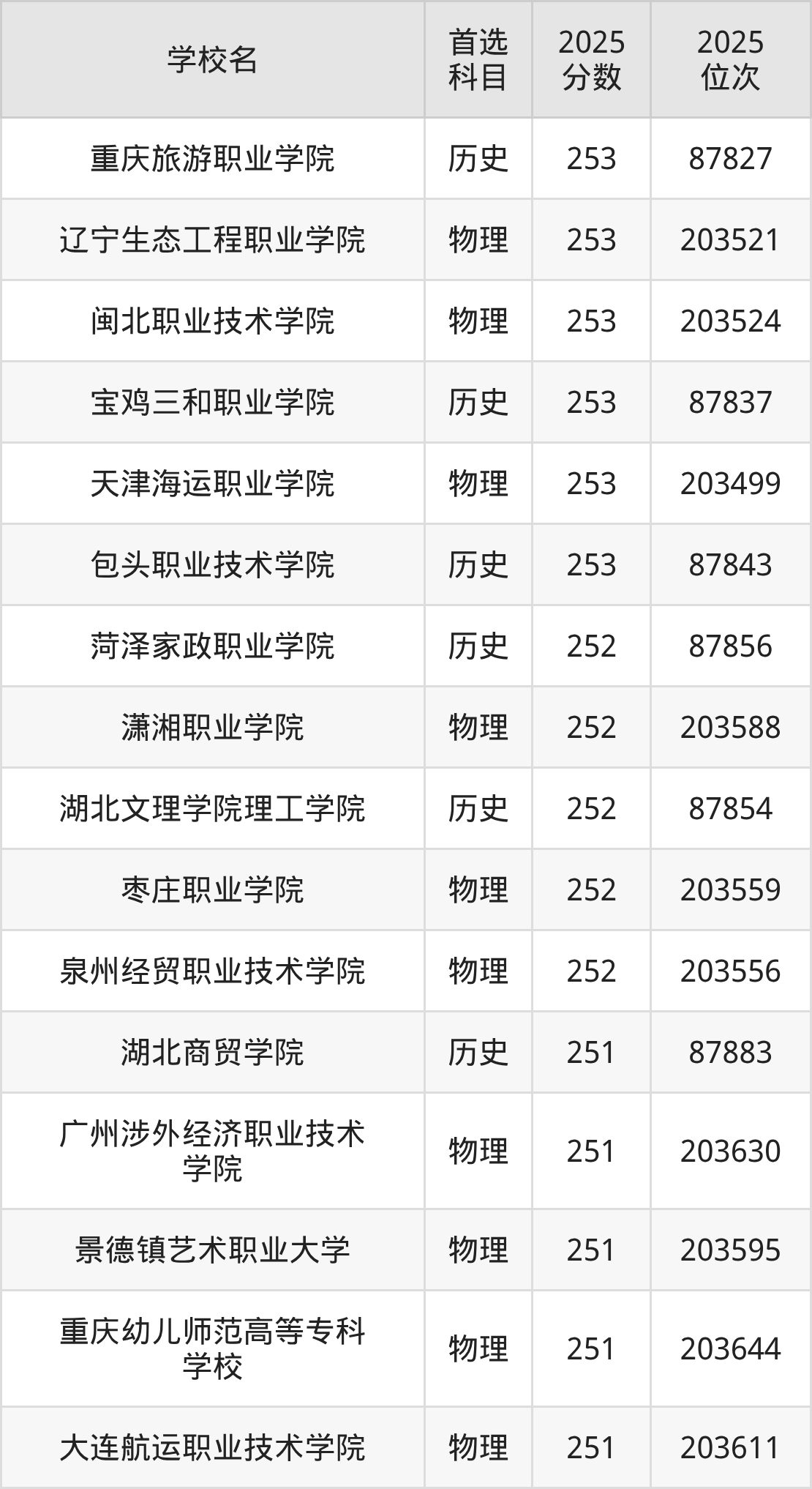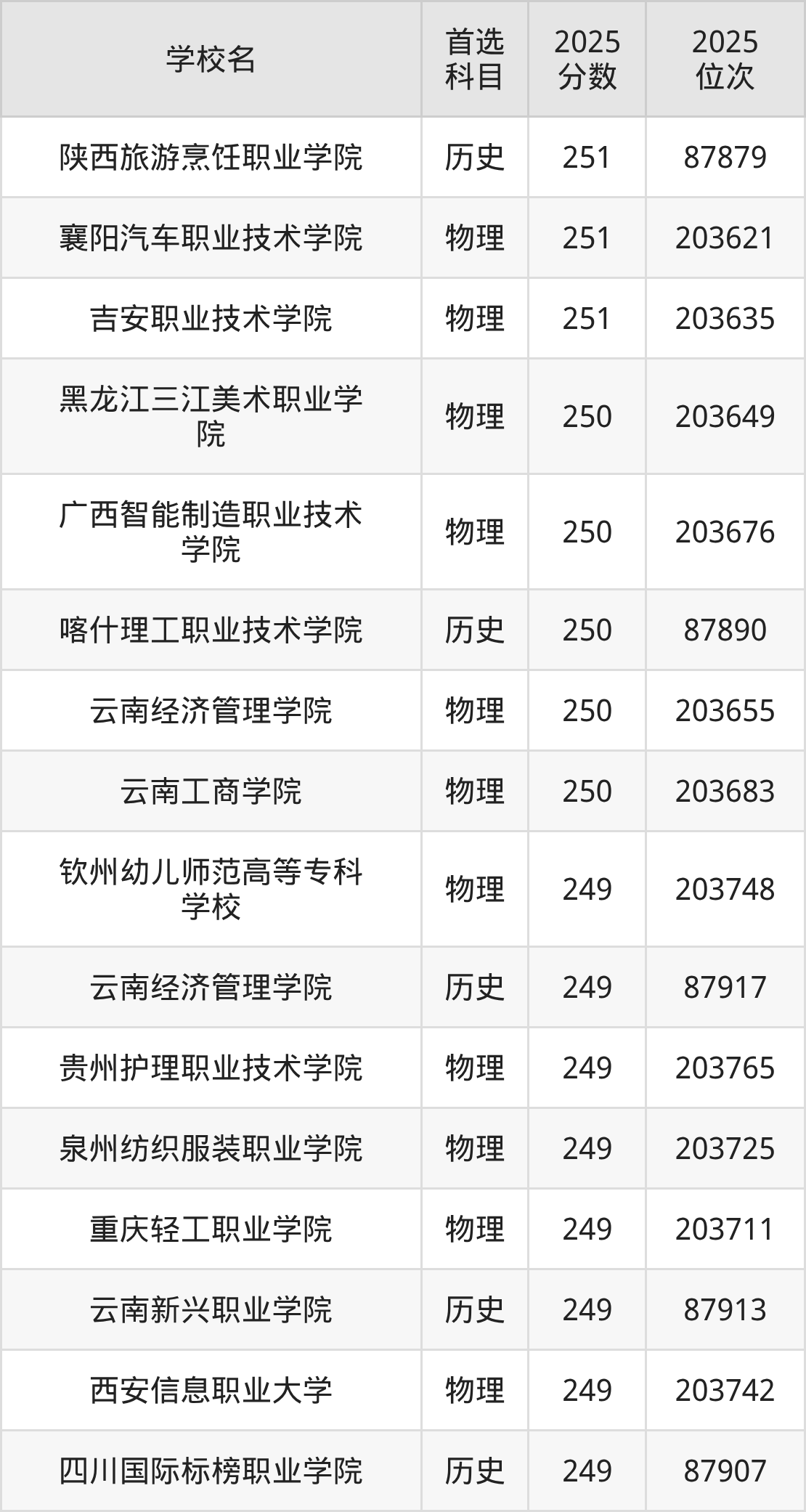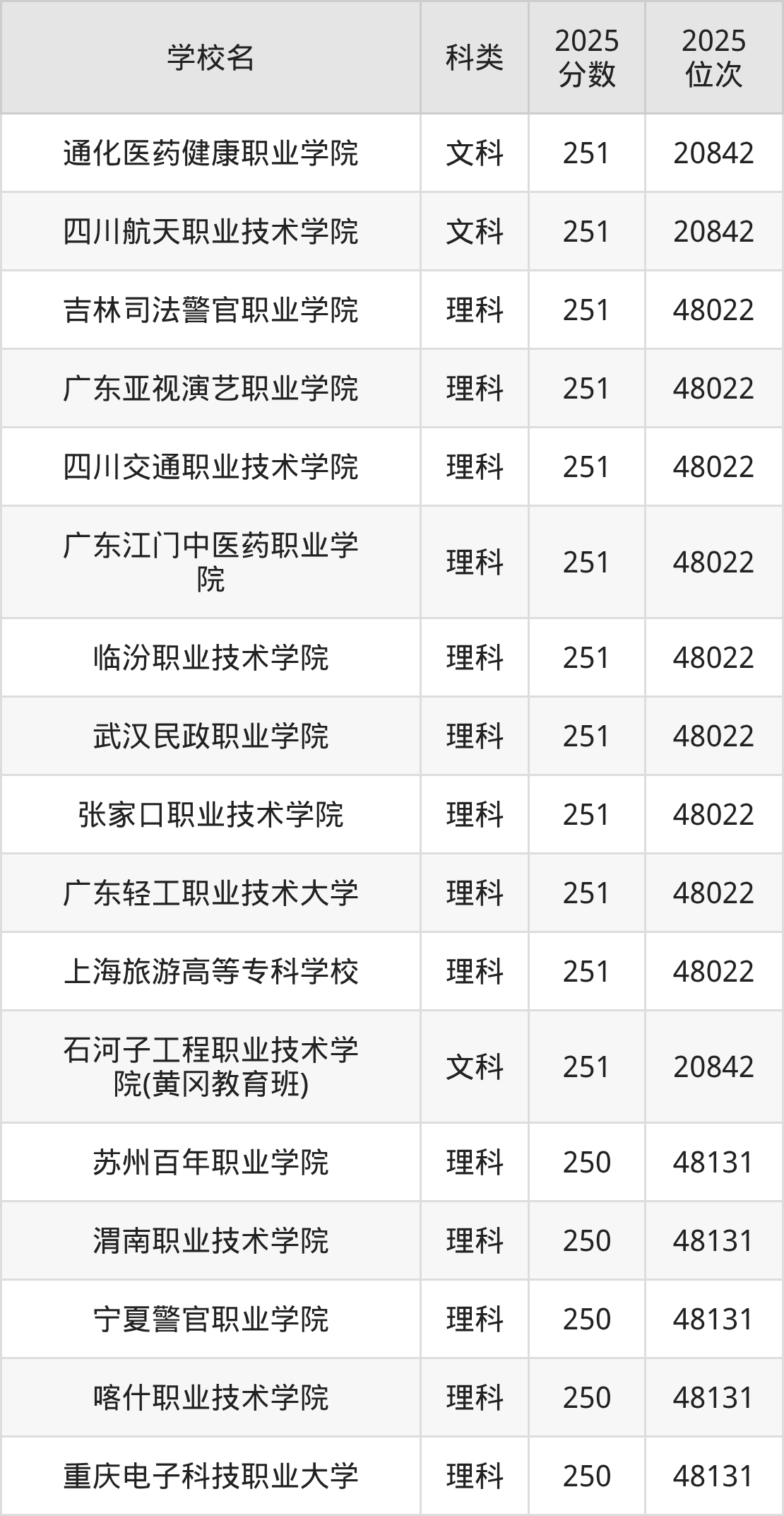 下面老师将以上文整理的其中两个省份为例,为大家具体展示251分左右能上的专科大学名单。