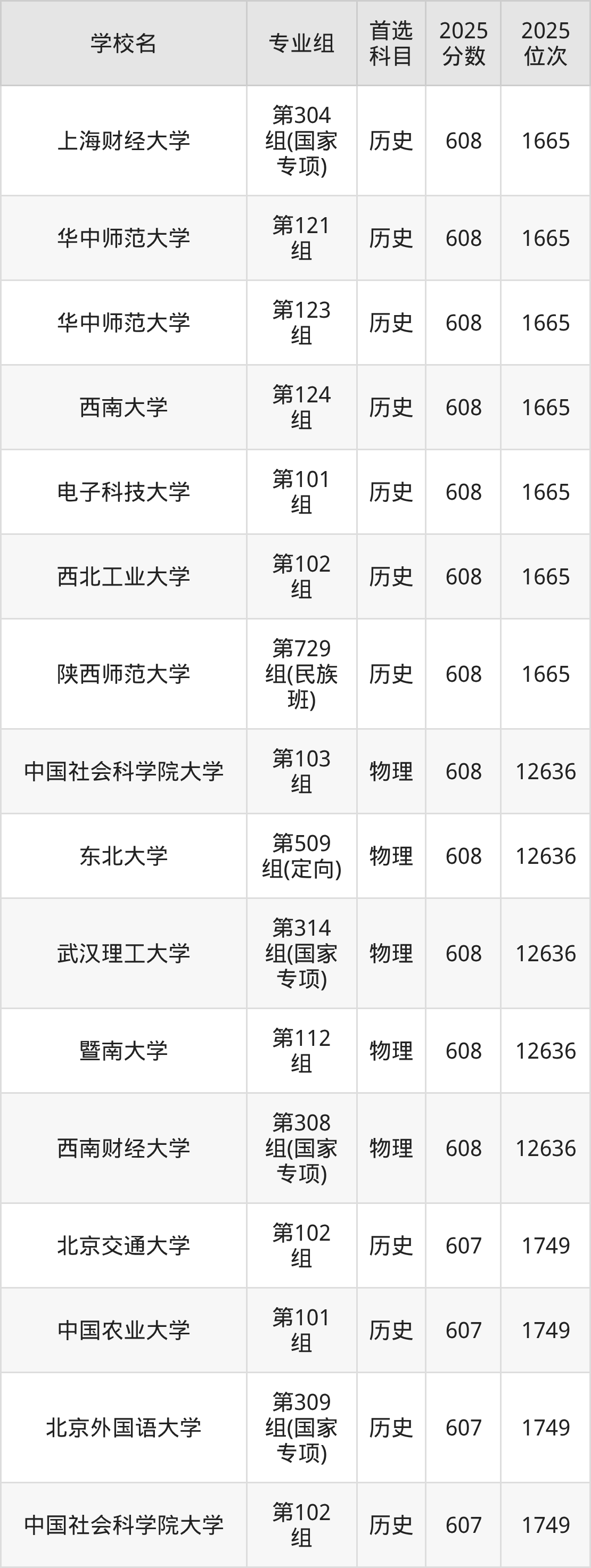 历史类606分可以冲的大学:上海财经大学608分、华中师范大学608分、西南大学608分、电子科技大学608分等;较稳妥的大学:北京邮电大学605分、中央民族大学605分、天津大学605分、湖南大学605分等。