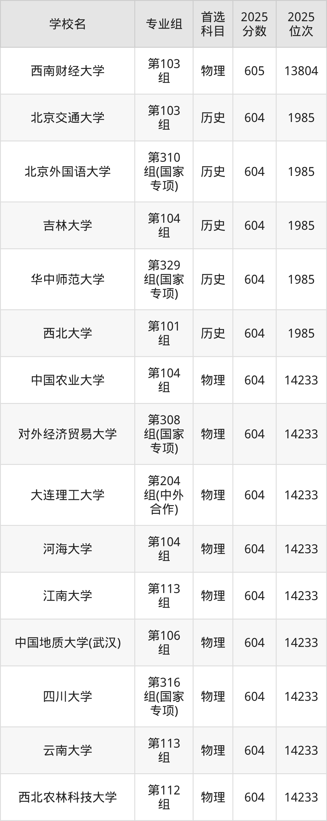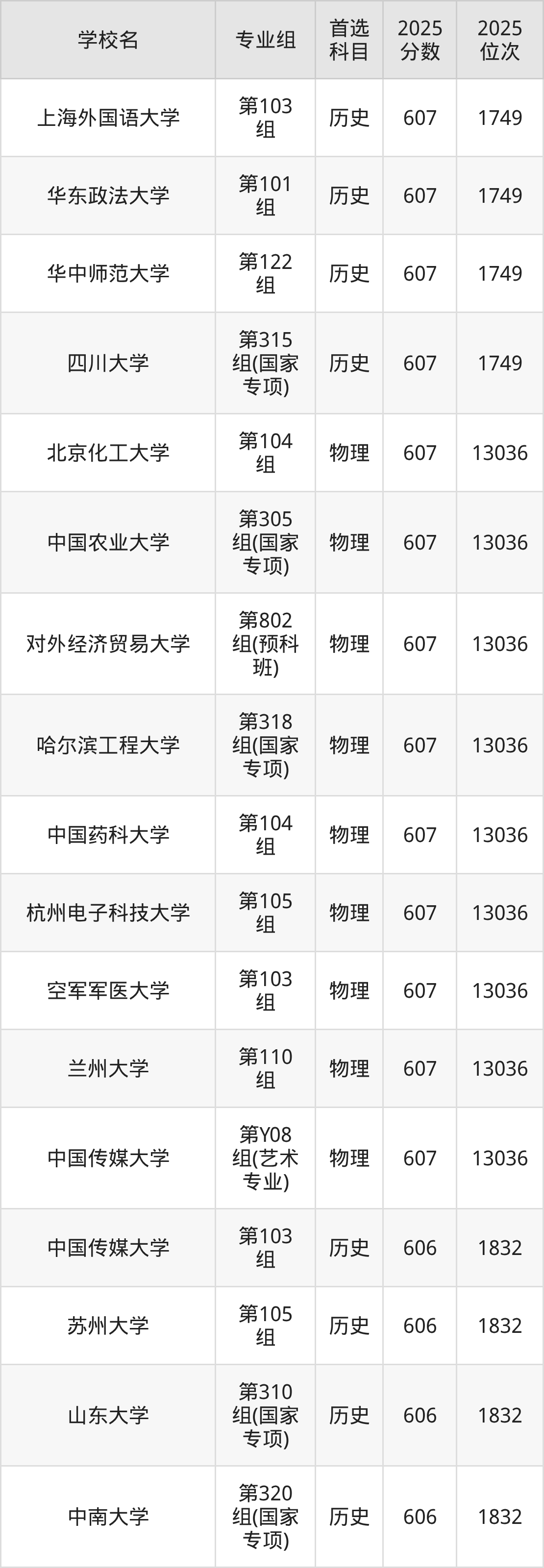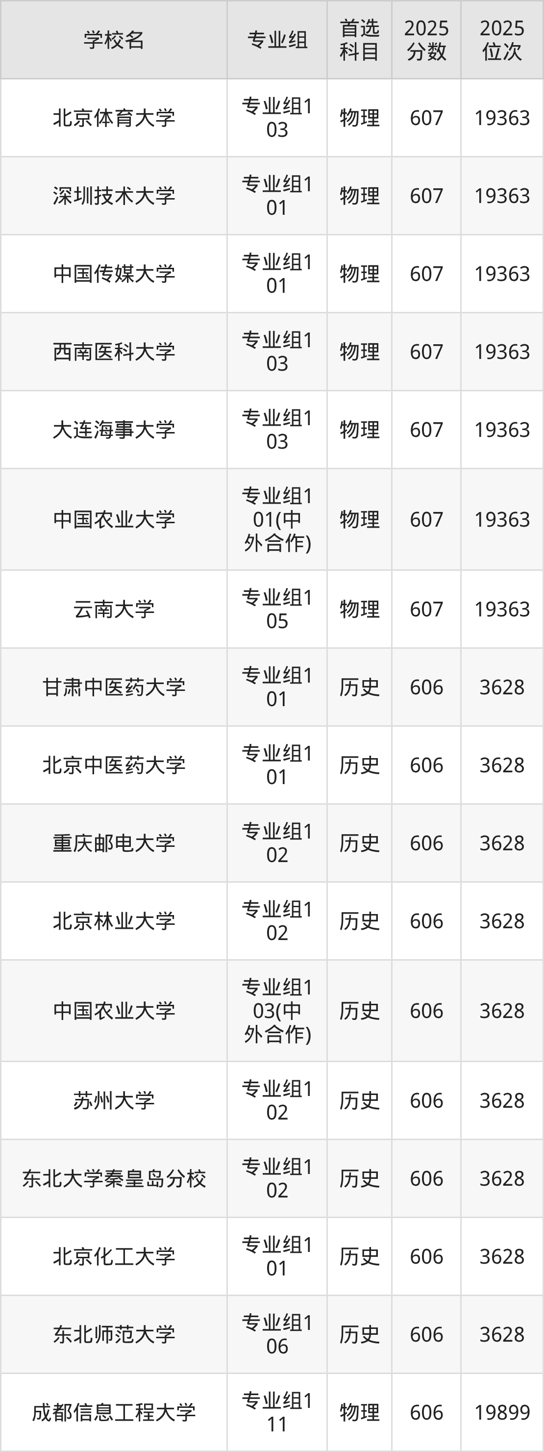 2025年在四川高考历史类录取分数线是606分的大学有甘肃中医药大学、北京中医药大学、重庆邮电大学、北京林业大学、中国农业大学、苏州大学、东北大学秦皇岛分校、北京化工大学、东北师范大学。物理类录取分数线是606分的大学有成都信息工程大学、西北农林科技大学、山西医科大学、兰州大学、中国地质大学(北京)、成都理工大学。