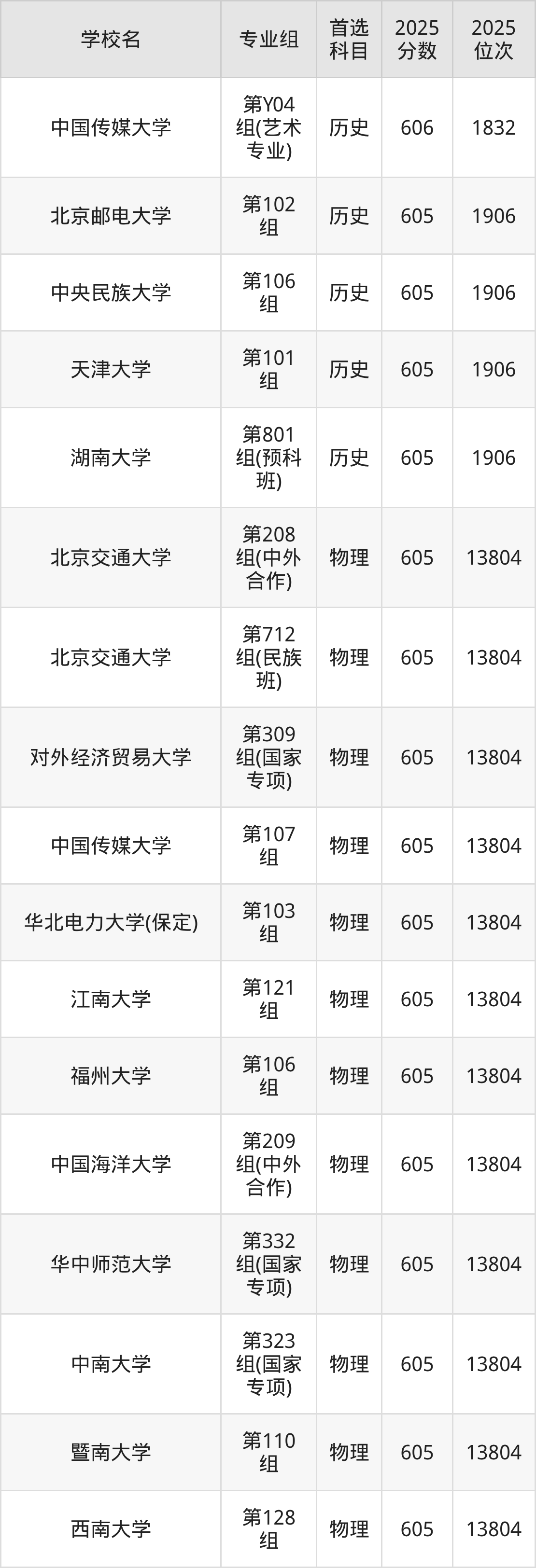 湖南高考历史类606分对应的位次排名是1832名,物理类606分对应的位次排名是13439名,因此建议2026年位次排在这附近的同学考虑这些大学。