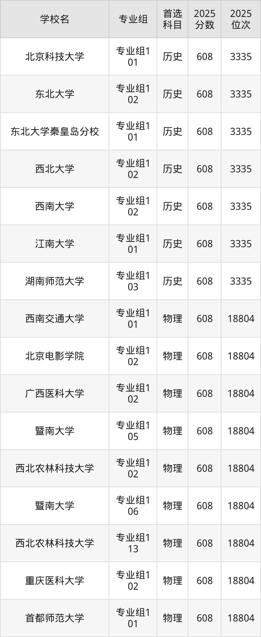 历史类606分可以冲的大学:北京科技大学608分、东北大学608分、东北大学秦皇岛分校608分、西北大学608分等;较稳妥的大学:中国农业大学605分、云南大学605分、东北财经大学605分、北京电影学院605分等。